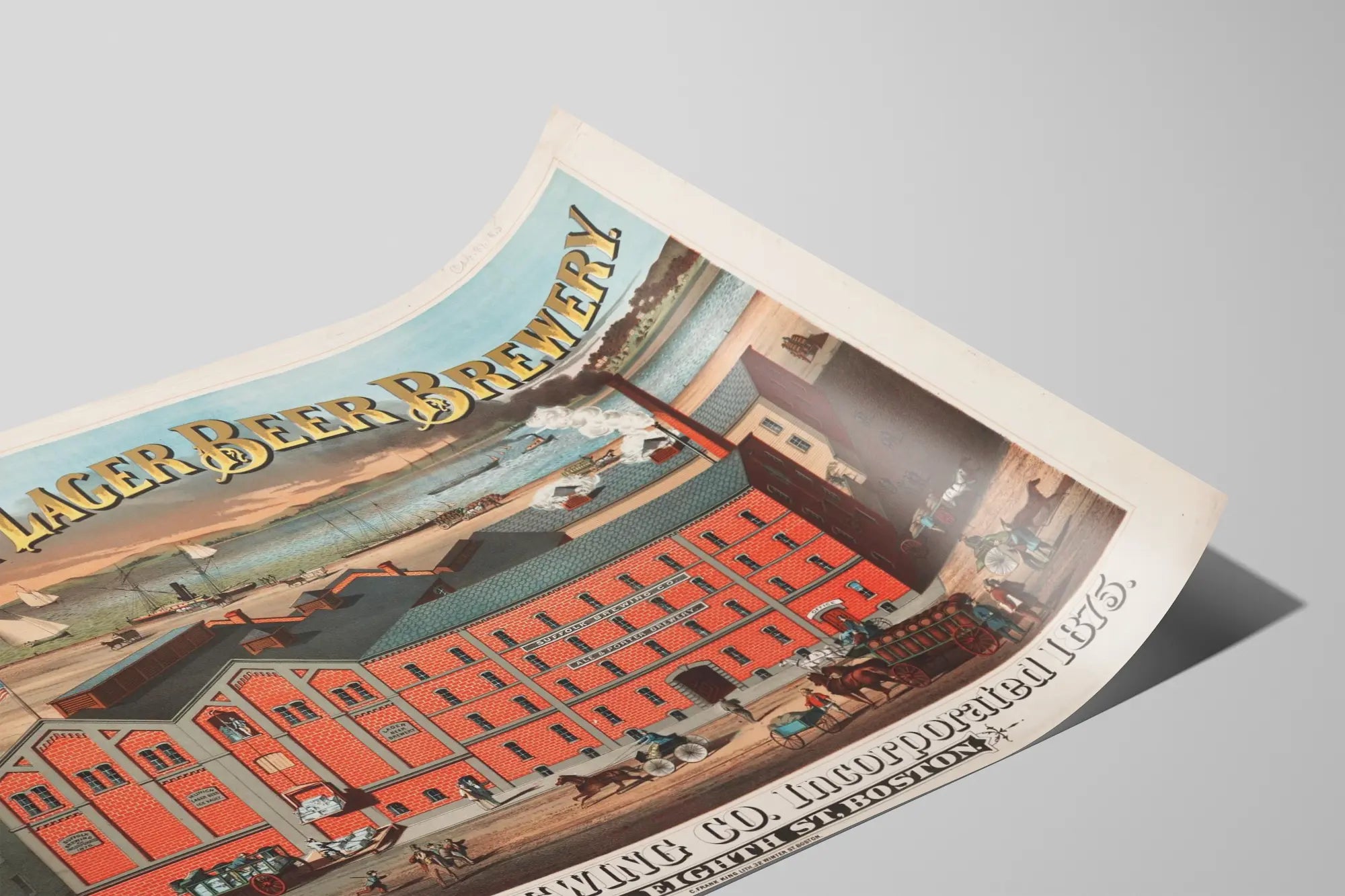 Den här vintageaffischen föreställer Munich Lager Beer Brewery, som grundades 1875 under namnet Suffolk Brewing Co. i Boston. Denna väggdekoration visar den typiska industriarkitekturen från 1800-talet med en röd tegelbyggnad och rykande skorstenar, vilket illustrerar bryggningsverksamheten från den tiden. Affischen fångar också den livfulla atmosfären runt bryggeriet med hästdragna vagnar, förbipasserande och båtar i hamnen i bakgrunden, vilket ger en äkta bild av det urbana och industriella livet vid havet. Denna affisch är perfekt för vintage- och industriväggdekoration, idealisk för historieentusiaster, arkitektur- eller bryggarkulturälskare. Dess grafiska stil och mjuka färger, främst i röda, blå och ockriga nyanser, gör den till ett dekorativt föremål som drar till sig blickar samtidigt som det är elegant. Denna gamla affisch är ett originellt dekorativt val för att pryda en vägg med en retro- och historisk atmosfär, och öppnar ett fönster mot en rik och fascinerande industriell historia.