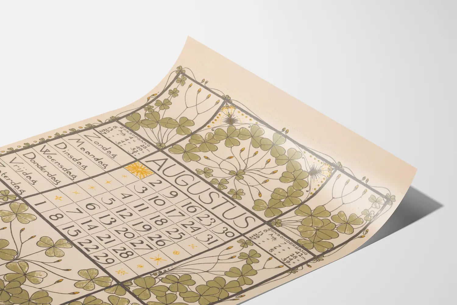 Upptäck denna dekorativa kalenderaffisch för augusti 1896, ett enastående exempel på jugendstil med sina delikata växtmotiv. Denna väggdekoration visar en månadskalender inramad av illustrationer av treblad och knoppar med flytande och eleganta linjer, typiska för denna konstnärliga period. Varje dag i månaden är inskriven i ett tydligt och lättläst rutnät, tillsammans med färgglada solsymboler i gult för att markera vissa datum. Texten är skriven på nederländska, vilket ger en vintagecharm och en historisk äkthet till denna kalenderposter. Ramens design integrerar harmoniskt blomsterelementen, vilket skapar en visuell balans och förstärker affischens dekorativa sida. Denna tavla är perfekt för en förfinad väggdekoration, idealisk för alla som älskar historia, dekorativ konst eller söker en originell tavla som kombinerar funktion och estetik. Oavsett om den placeras i ett kontor, ett bibliotek eller ett vardagsrum, bjuder denna poster in till en tidsresa, förhöjd av dess naturliga grafiska stil och mjuka gröna och gula nyanser. En affisch som lyfter fram den klassiska elegansen och vintage-designen på dina väggar, för en varm och sofistikerad atmosfär.
