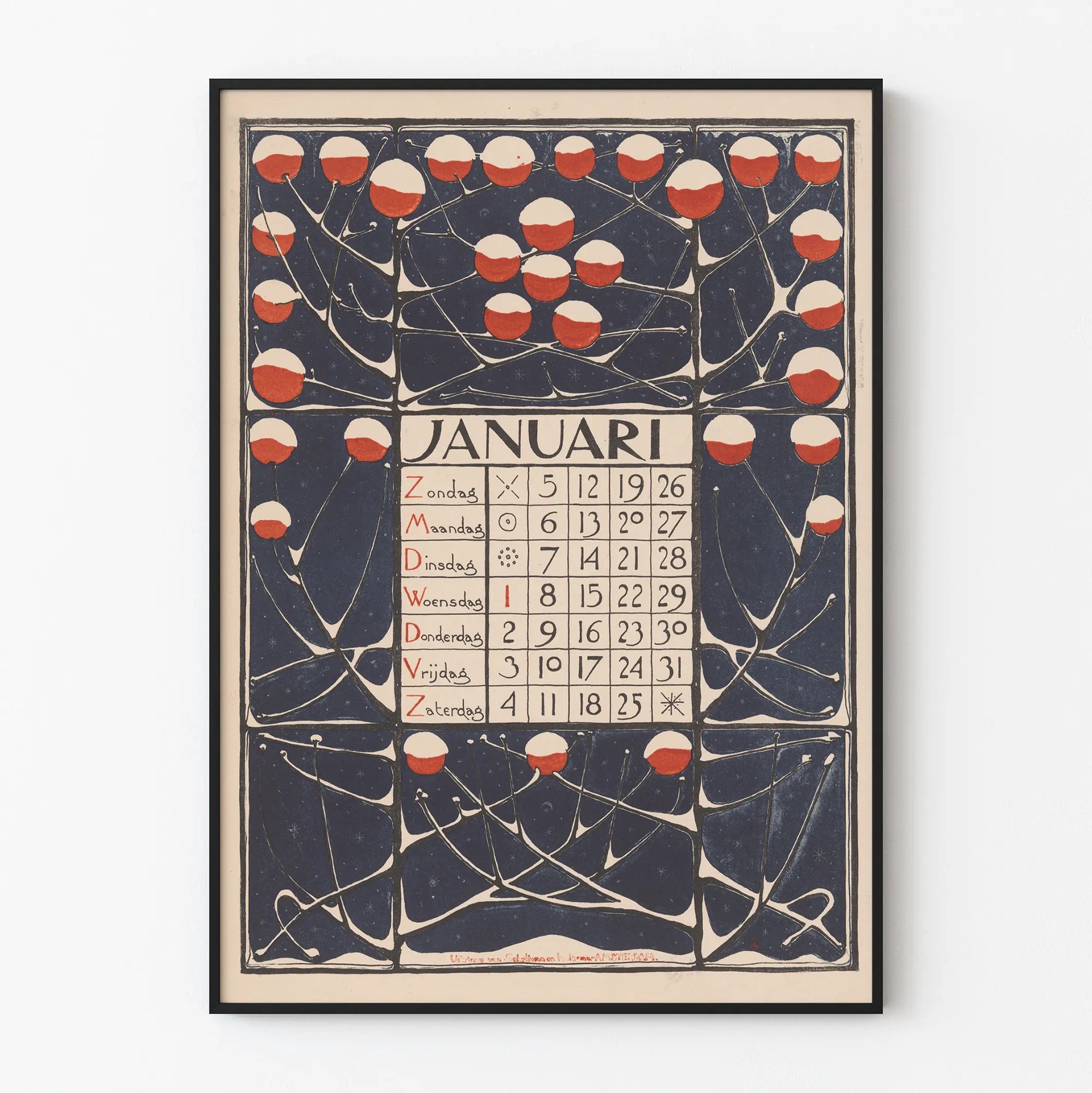 Ge en gammal elegans touch till din väggdekoration med detta januari 1896-kalenderaffisch. Denna vintageposter visar en konstnärlig komposition utförd i en subtil retrostil där grenar med runda, snötäckta frukter väver samman sig, i dominerande nyanser av midnattblått, djup rött och vitt. Kalendern är organiserad kring ett tydligt rutnät, där veckodagarna är skrivna på nederländska med noggrant utarbetad typografi, vilket ger en enkel och visuellt tilltalande läsning. Symboler placerade bredvid vissa dagar tillför ett extra dekorativt inslag, vilket förstärker den hantverksmässiga känslan i detta stycke. Denna väggdekoration, inspirerad av grafisk design från början av 1900-talet, passar perfekt i ett inre som söker en atmosfär som är både historisk och konstnärlig. Oavsett om den används som en fristående poster eller inramad som ett konstverk, kommer detta väggobjekt att fånga blickar och väcka nyfikenhet. Den kontrasterande färgskalan mot en mörk bakgrund utmärker sig och ger en elegant prydnad till en vägg, vilket skapar en varm och grafisk atmosfär i ditt utrymme. Perfekt för entusiaster av gamla kalendrar, retrodesign och stiliserade blomstermotiv, är detta poster ett unikt stycke för att försköna ett bibliotek, ett kontor eller ett vardagsrum. Det inbjuder till en fördjupning i en rik konstnärlig historia och erbjuder en originell väggdekoration som kombinerar funktion och estetik. Utmärkt för dem som söker en kalenderaffisch med charm från förr och en stil som alltid är modern inom en sofistikerad väggdekoration.