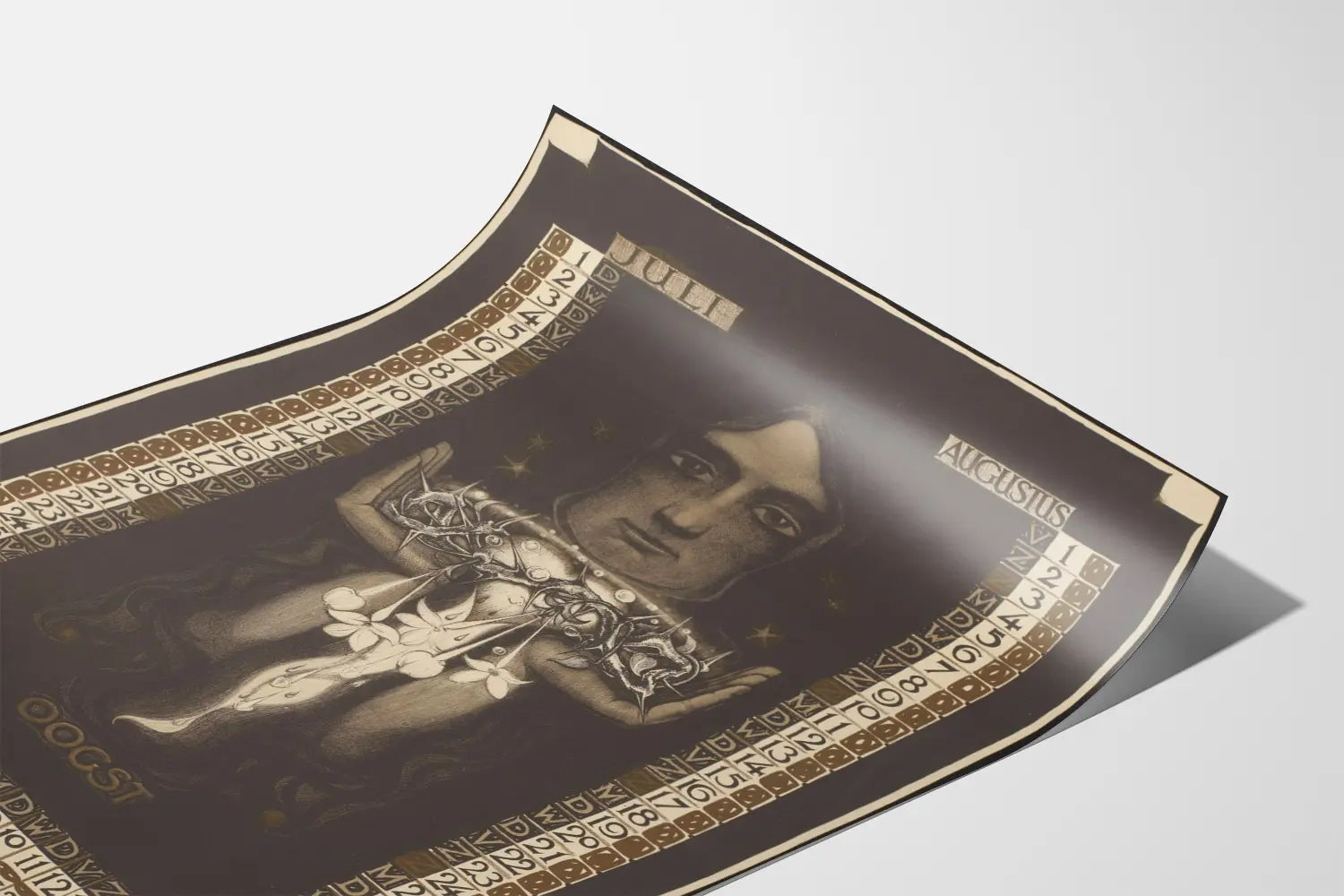I mitten av denna väggdekoration finns en stark och symbolisk illustration: ett mänskligt ansikte med intensiv blick, som håller ett komplext föremål som verkar mekaniskt, prytt med fallande blommor och droppar, vilket skapar en mystisk och poetisk stämning. Den centrala kompositionen drar starkt till sig uppmärksamheten, vilket förstärker den konstnärliga och unika karaktären hos detta kalender- och konstverk.