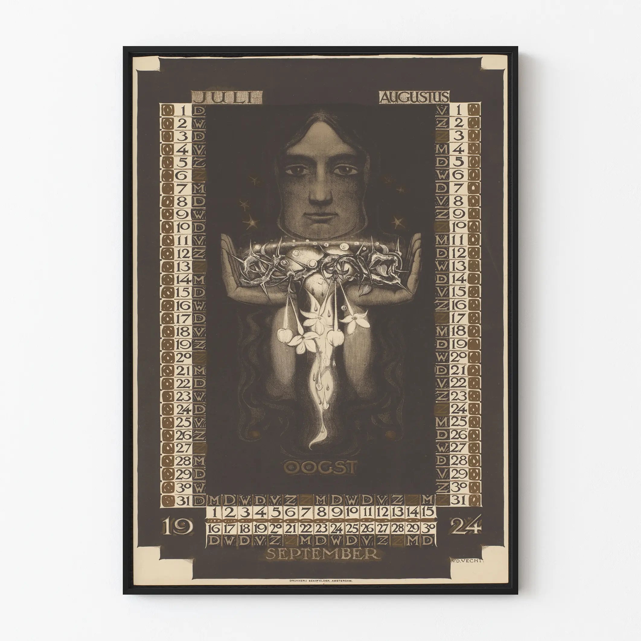 Affischen visar även inskriptioner på nederländska som anger månaderna (« JULI », « AUGUSTUS », « SEPTEMBER ») och ordet « OOGST », vilket betyder « skörd ». Detta understryker ett somrigt och jordbruksmässigt tema, i linje med kalenderperioden. Detta poster är noggrant tryckt, med subtila detaljer och balanserade nyanser mellan ljus och mörker. Signerad längst ned till höger, är detta konstverk ett grafiskt verk som kombinerar funktionell användning med dekorativ estetik.