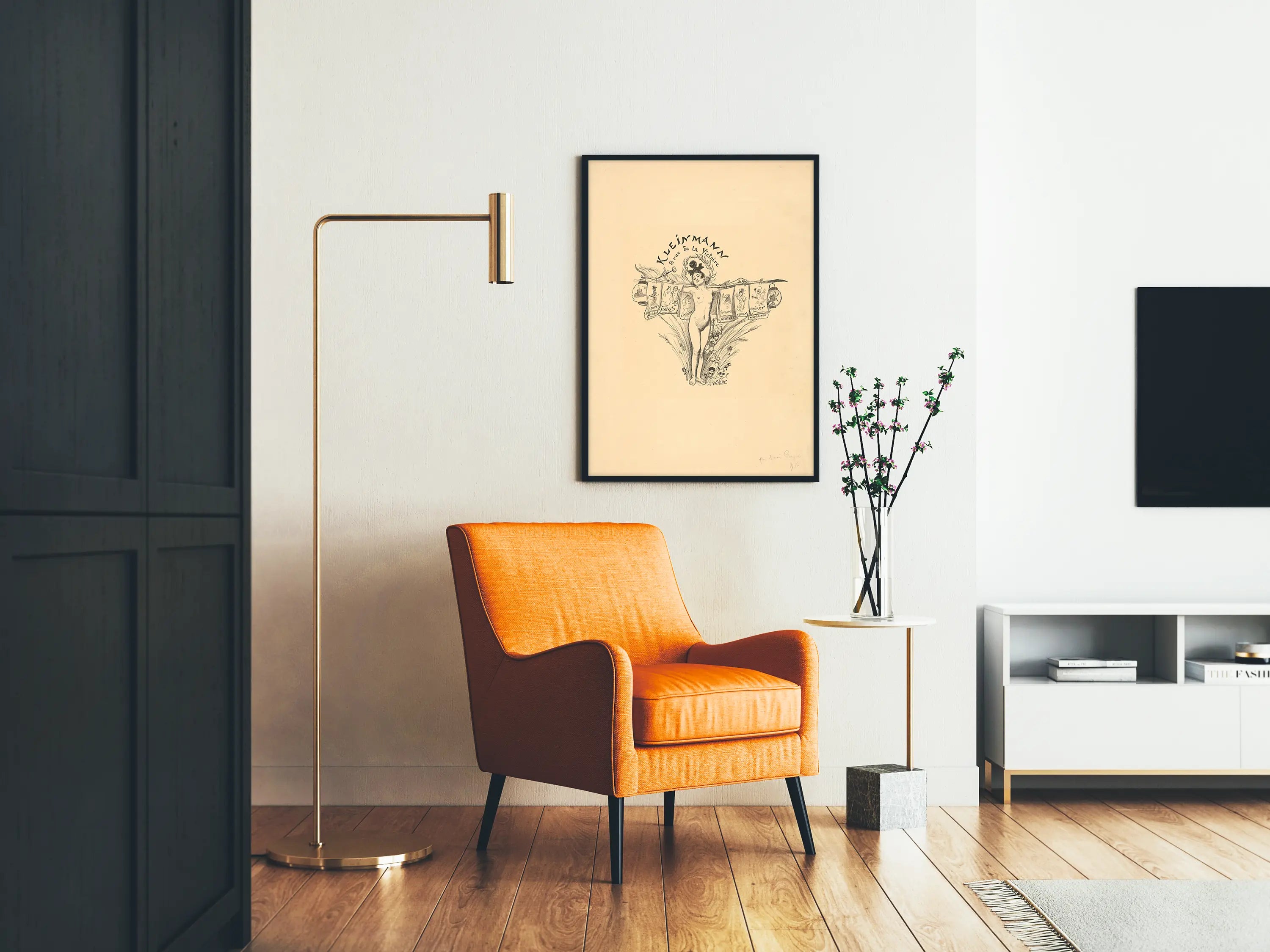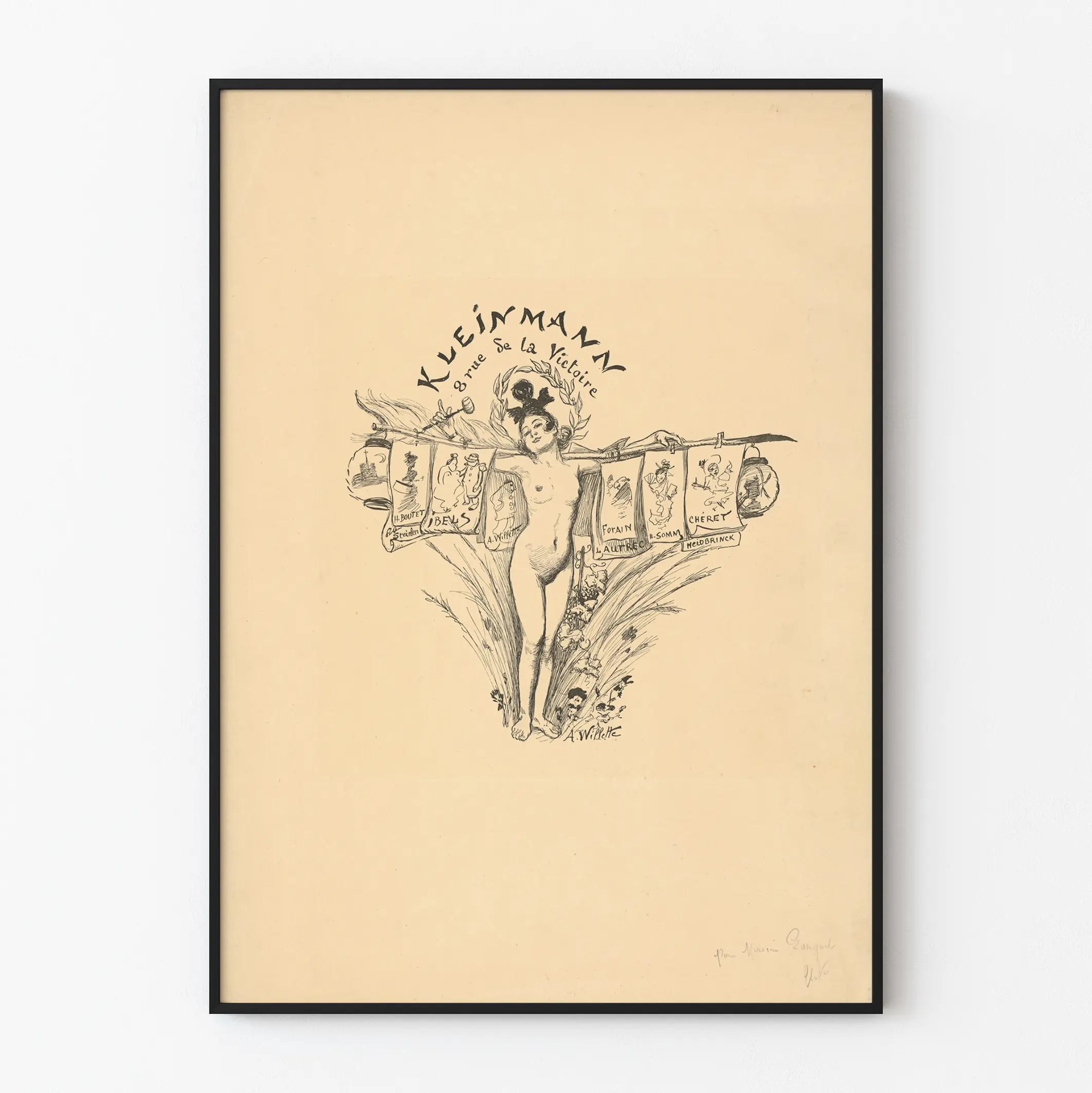 Upptäck denna vintageaffisch illustrerad av A. Willette, en fin och originell väggdekoration. På en beige bakgrund skildrar den en naken kvinnlig figur i mitten, bärande en växtkrans och hållande ett långt skaft med flera små affischer hängande från det. Dessa sekundära affischer visar stiliserade teckningar med namn, vilket tillför en berättande dimension till verket. Kompositionen är prydd med blomsterinslag i bakgrunden som ger en känsla av lätthet och elegans. Denna affisch är perfekt för entusiaster av klassisk och elegant väggdekoration, och erbjuder en retrocharm som kan förhöja varje interiör. Den väcker associationer till det gamla grafiska konstnärskapet, idealisk för att berika ett utrymme med ett konstverk som kombinerar finhet i linjeföringen och visuell poesi. Oavsett om den placeras i ett vardagsrum, ett bibliotek eller ett kontor, passar denna poster harmoniskt in i olika inredningsstilar, från vintage till modern, och kommer särskilt att tilltala dem som uppskattar konstnärliga illustrationer med en fin och detaljerad stil.