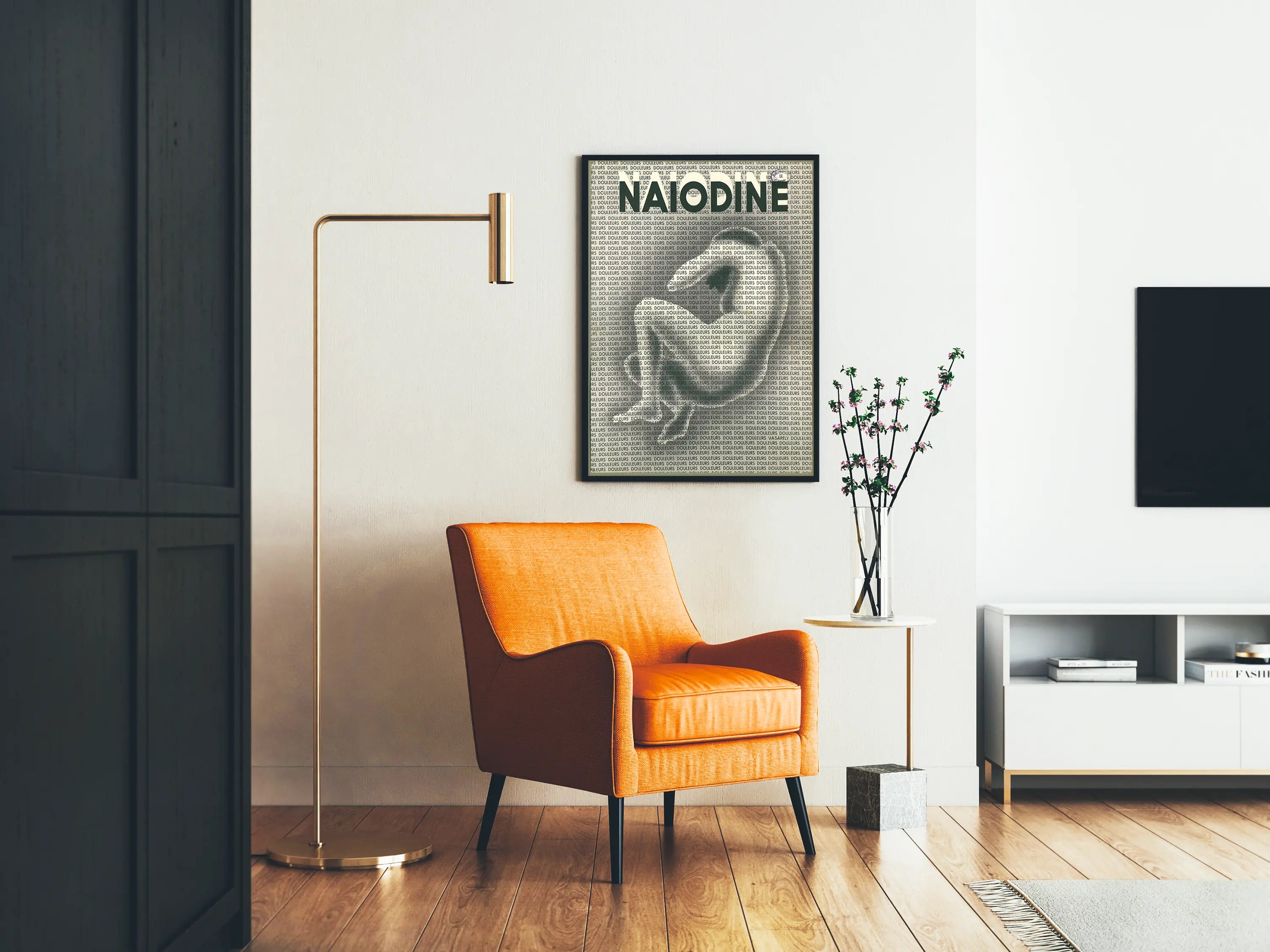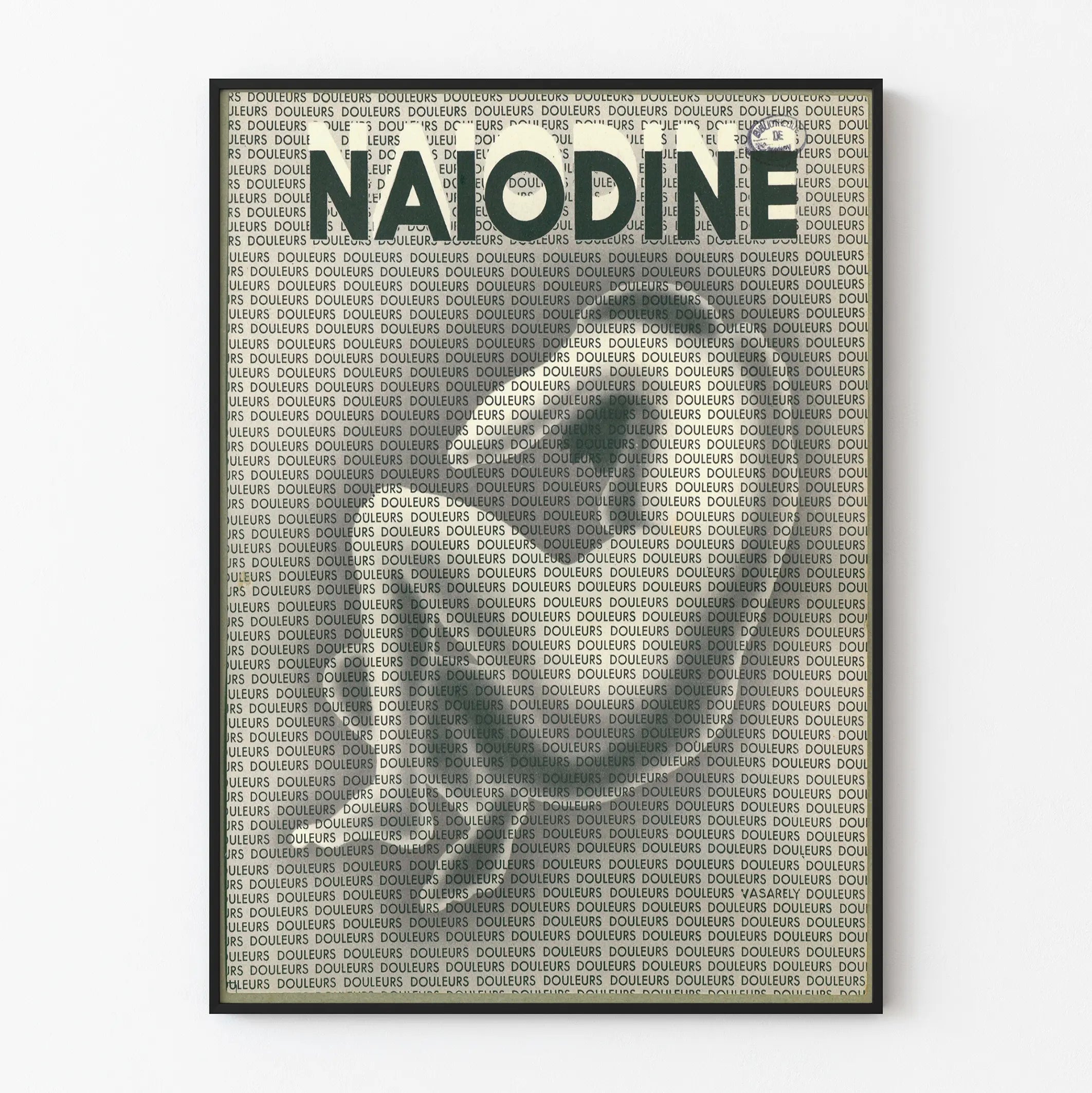 Denna väggaffisch i vintage stil framhäver namnet "NAÏODINE" i stora versaler som kontrasterar mot en texturerad bakgrund bestående av tusentals upprepningar av ordet "DÖDSSKÄLVO". Den typografiska leken skapar en mycket tydlig visuell atmosfär, där den textuella bakgrunden formar en abstrakt siluett i bakgrunden, vilket förstärker den grafiska och minimalistiska sidan av denna väggdekoration. Det diskret tryckta runda stämpeln upptill till höger ger en retro känsla till hela kompositionen. Perfekt för entusiaster av originella posters som kombinerar typografisk och konceptuell konst, lyfter denna grafiska tavla fram harmonin mellan text och bild, vilket gör den idealisk för att dekorera ett modernt hem eller ett kreativt utrymme. Den monokroma paletten, med fokus på svarta och beige toner, passar lätt in i olika väggdekorationer och tillför en touch av sofistikering och eftertanke. Denna poster framkallar en värld som är både konstnärlig och känslosam, fångar uppmärksamheten med sin hypnotiska upprepning av ordet "dödssköv" och sin minimalistiska men kraftfulla stil. För en unik väggdekoration som inbjuder till eftertanke och samtal, passar denna affisch perfekt i ett vardagsrum, ett kontor eller ett konstgalleri, och skapar en originell fokuspunkt på väggen. Dess balanserade komposition och vintage-estetik gör denna poster unik och tidlös.