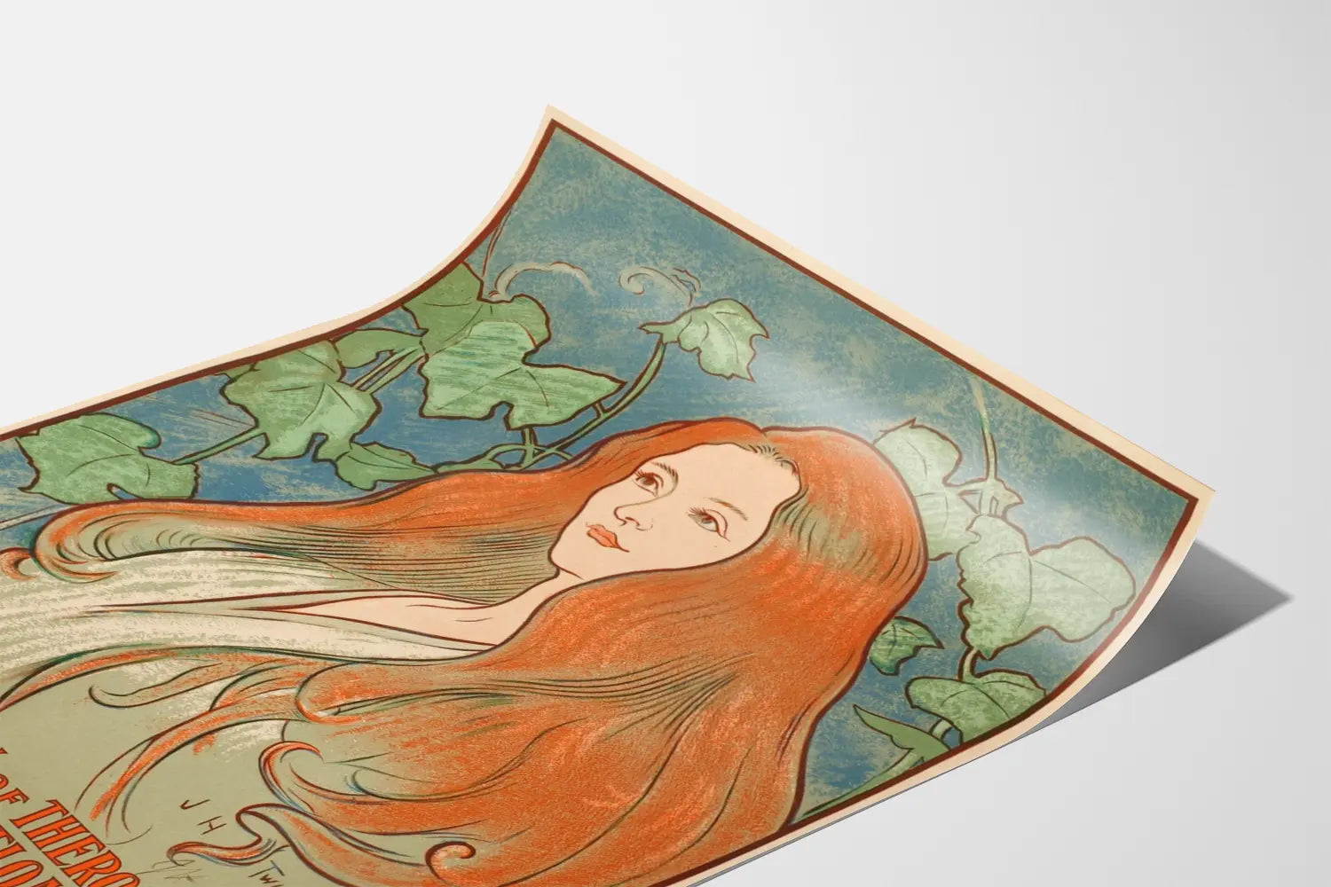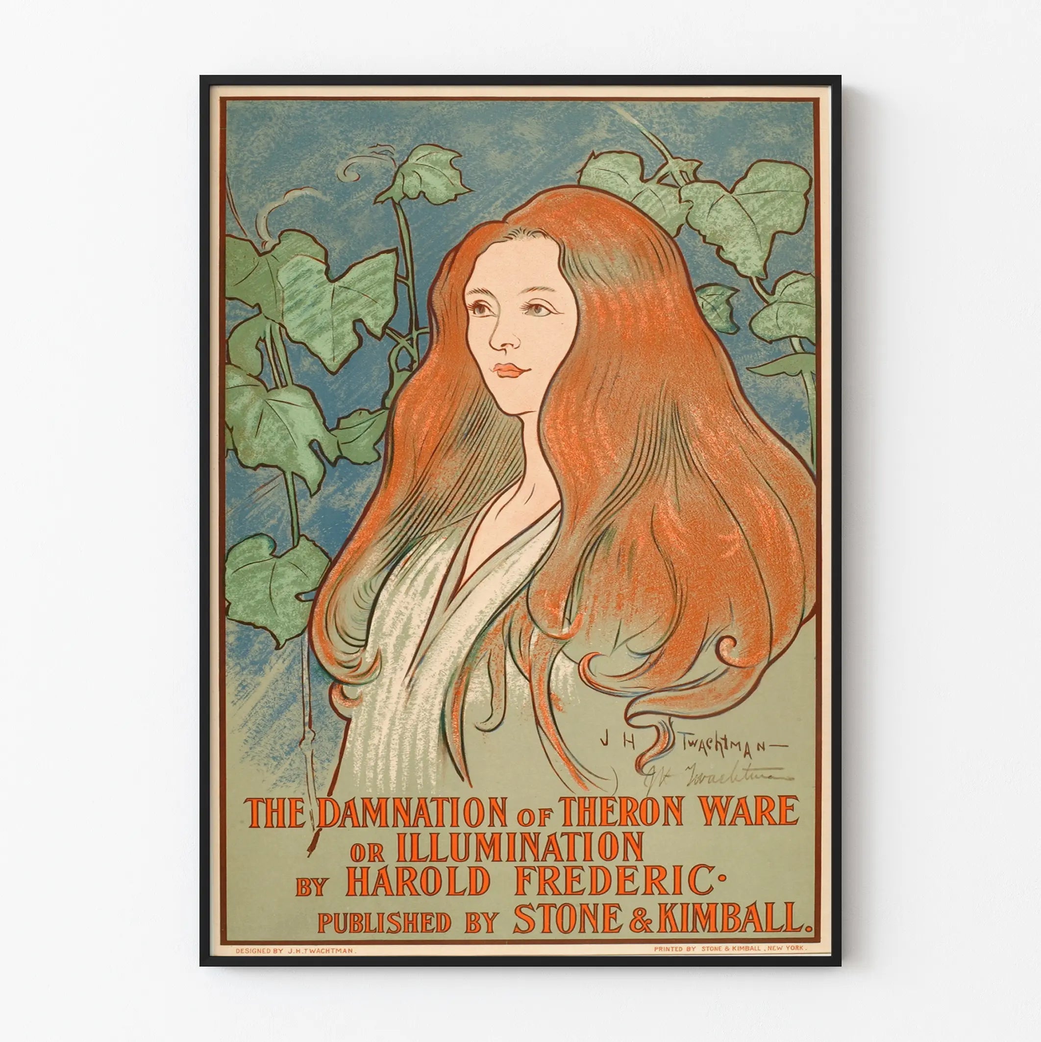 Upptäck denna vintage konstaffisch som illustrerar "The Damnation of Theron Ware or Illumination" av Harold Frederic, publicerad av Stone & Kimball. Denna retrostilposter framhäver porträttet av en kvinna med långt rött hår och ett lugnt uttryck, omgiven av gröna blad mot en blå bakgrund. Kompositionen kombinerar finhet i linjerna med en subtil användning av färger, vilket ger en ljus och ömtålig atmosfär till verket. Perfekt för en elegant väggdekoration, denna illustration passar utmärkt i ett inre som söker en äkthetskänsla och nostalgisk elegans. Oavsett om det gäller att försköna ett vardagsrum, ett bibliotek eller ett läshörn, kommer denna vintageaffisch att fängsla betraktaren och tillföra en konstnärlig ton till ditt utrymme. Dess gamla stil och noggranna detaljer gör den till ett originellt dekorativt föremål som tilltalar konstälskare, litteraturentusiaster och retro grafisk design. Med sitt vertikala format är den lätt att integrera i olika ramar för ett snyggt presentation. Denna väggdekoration riktar sig till alla som vill berika sitt hem med ett konstverk som är både estetiskt tilltalande och fullt av historia, perfekt för att skapa en varm och inspirerande atmosfär.