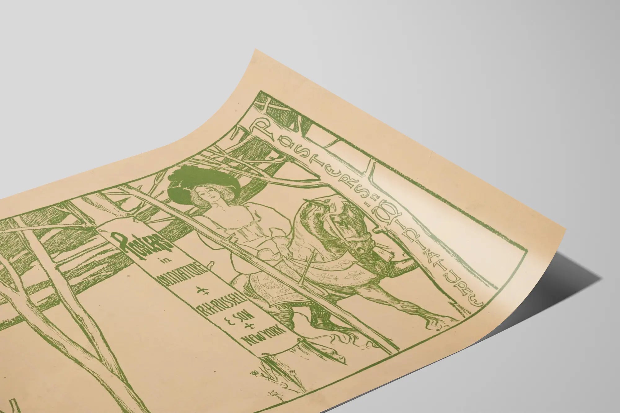 Upptäck detta vintageaffisch med retrostil, kallad "Miniatyraffischer", perfekt för en originell och elegant väggdekoration. Denna affisch återger en fin teckning av en kvinna till häst i en skog, omgiven av tunna träd och en stad i fjärran, allt i gröna nyanser på en krämfärgad bakgrund. Dess detaljerade design påminner om estetik från gamla affischer, med en noggrann linjeföring och vacker grafisk utformning som tilltalar entusiaster av klassisk och konstnärlig väggdekoration. Denna affisch passar utmärkt för att skapa en scen i ett inre som söker en äkta och unik prägel, vare sig det är i ett vardagsrum, sovrum eller kontor. Dess tema som kombinerar natur och figur ger en lugn atmosfär och för tankarna till en svunnen tid, samtidigt som den erbjuder en fängslande och harmonisk visuell effekt. Tack vare sina mått passar denna vintageaffisch lätt in i en samling av äldre affischer eller i en blandad samling av olika grafiska stilar, och tillför charm och karaktär till dina väggar. Detta unika konstverk speglar den grafiska reklamen från förr och skapar en nostalgisk stämning, perfekt för entusiaster av eftertraktad och originell väggdekoration. Välj denna vintageaffisch "Miniatyraffischer" för att förhöja ditt hem med ett verk som kombinerar finhet i teckningen och elegans i retrostilen – ett perfekt val för att lyfta fram en tom vägg eller komplettera en samling av äkta och karaktärsfulla bilder.