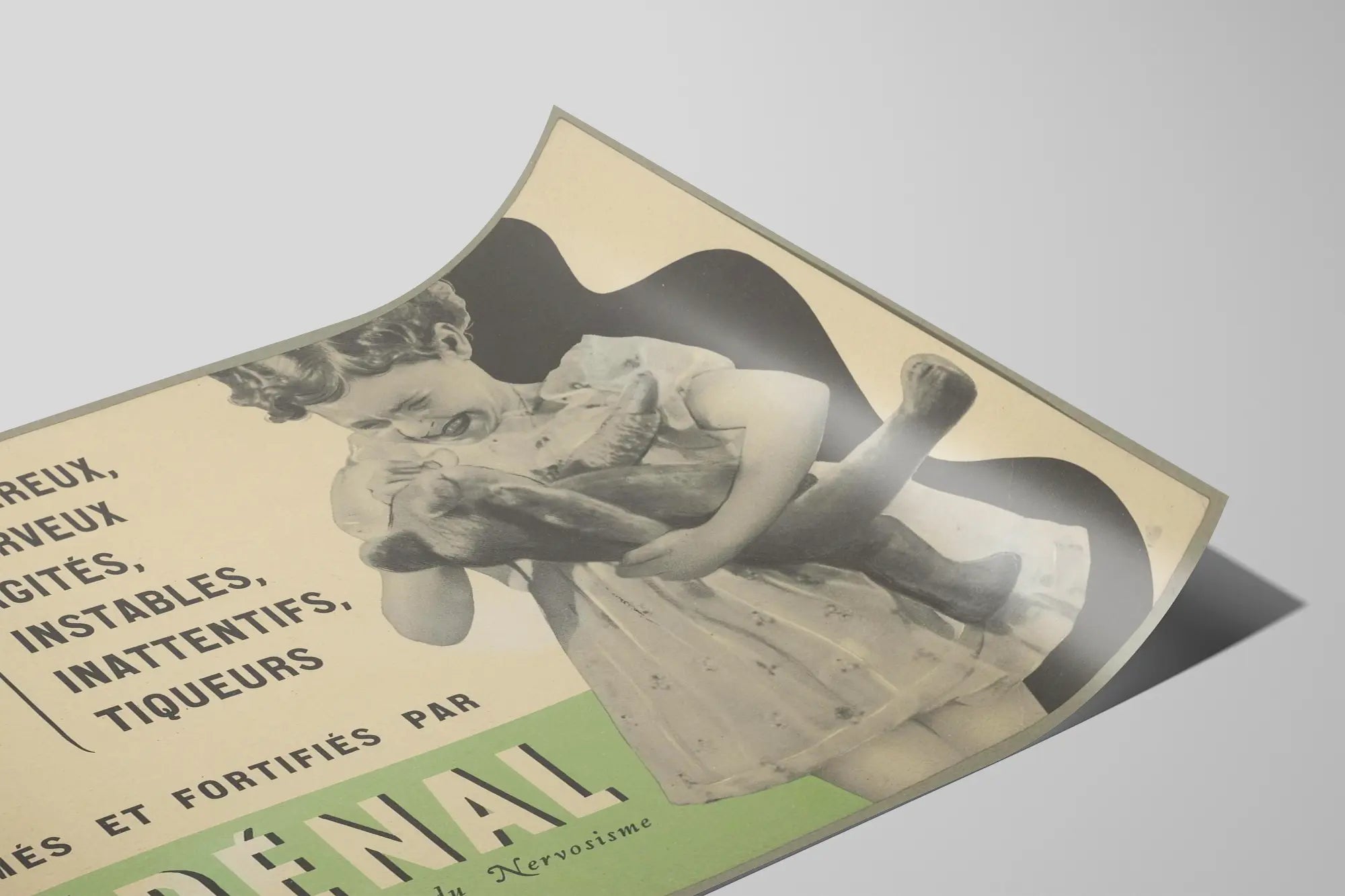 Upptäck denna originella vintageaffisch som är ägnad åt väggdekoration, och som lyfter fram den rationella behandlingen av nervositet hos barn och ungdomar med produkten Bédénal. Denna reklamaffisch i retrostil föreställer en liten flicka i vit klänning, som håller ett stort gosedjur i form av en björn med ett uttryck av förtvivlan, vilket förstärker idén om oro kopplad till nervösa störningar hos barnet. Bilden kompletteras av ett starkt och tydligt typografiskt budskap som väcker associationer till de olika känslotillstånd som denna behandling riktar sig mot: ilsken, nervös, rastlös, instabil, ouppmärksam och ticsande. På en tvåfärgad bakgrund i beige och pastellgrön är orden placerade för att dra till sig uppmärksamhet och skapa ett visuellt intryck som är både förståeligt och estetiskt tilltalande. Denna affisch är ett unikt föremål för väggdekoration som särskilt passar entusiaster av retrodesign, samlare av gamla reklamposters eller de som vill införa en vintage-stil i ett utrymme för hälsa eller barn. Perfekt för vardagsrum, läkarmottagningar, väntrum eller barnsrum, med en originell dekorativ ansats, och tillför en historisk touch till vilken vägg som helst. Framställ dina utrymmen med denna tryckta affisch som kombinerar konst och kommunikation av skuggor och ljus för att skapa en typiskt retro atmosfär. En väggdekoration som förenar pedagogiskt innehåll med estetik för att förhöja dina interiörer med en touch av nostalgi.