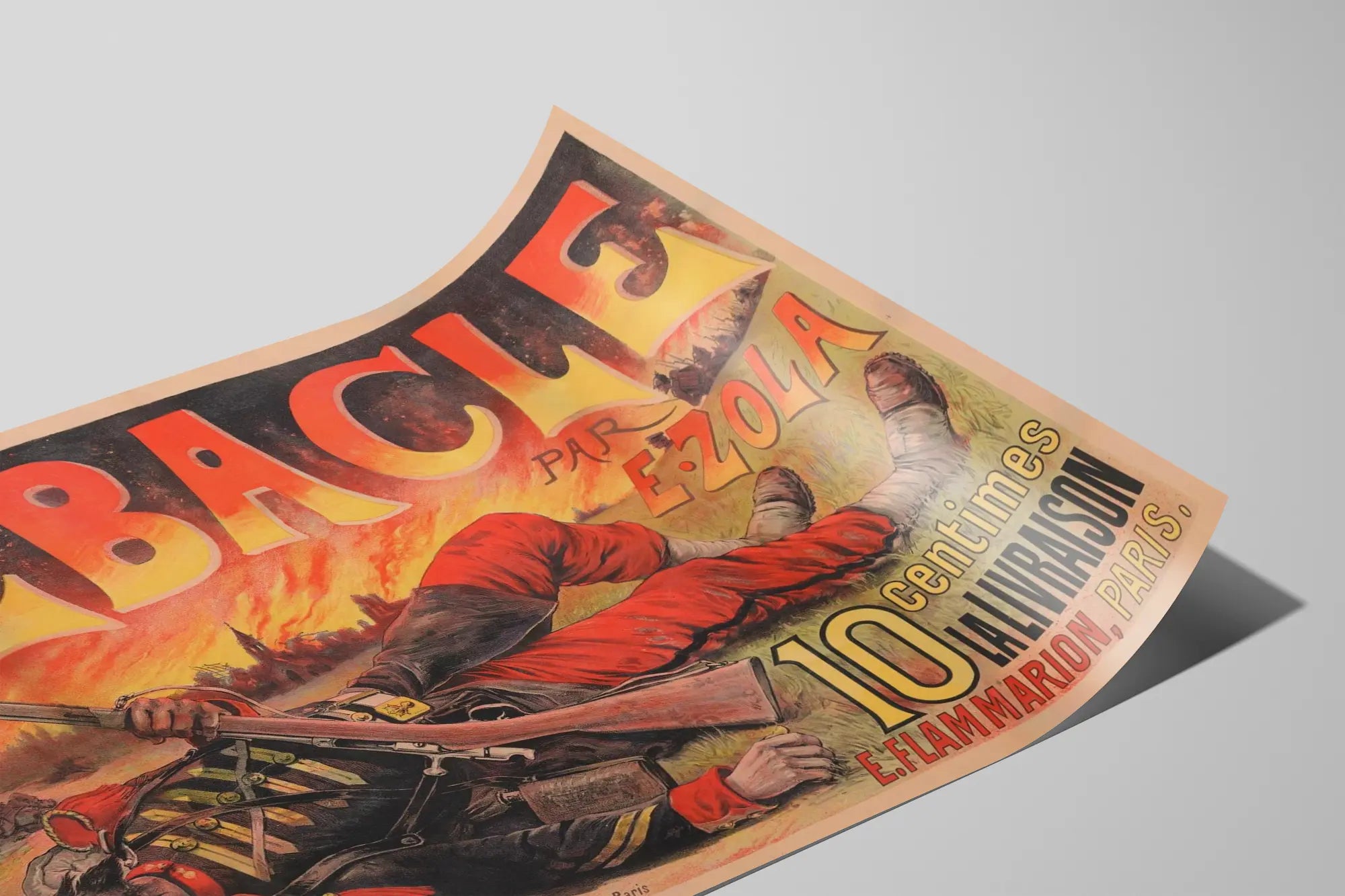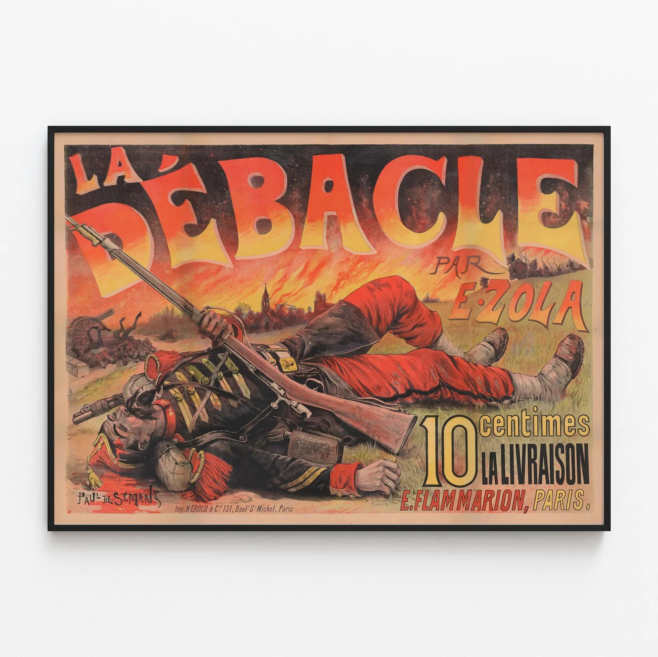 Denna vintageaffisch illustrerad av Paul de Sémantis erbjuder en slående skildring av den historiska romanen "La Débâcle" av Émile Zola. Utformad i en klassisk och dramatisk stil, visar denna väggdekoration en soldat som ligger på marken, klädd i en detaljerad militäruniform med ett gevär i handen, vilket väcker associationer till våld och förtvivlan i kriget. Bakgrunden i eld symboliserar förstörelse och förstärker den dramatiska intensiteten i bilden. Denna affisch är ett utmärkt val för litteratur- och historieälskare som vill berika sitt hem med ett konstnärligt och uttrycksfullt föremål. Perfekt som affisch eller väggdekoration, passar den lätt in i ett vardagsrum, ett kontor eller ett bibliotek, och tillför en touch av vintageelegans och ett intressant samtalsämne. Den stora, färgglada typografin av titeln "LA DÉBÂCLE" fångar omedelbart uppmärksamheten, medan alla grafiska element speglar den historiska och litterära kontexten från 1800-talet. Denna tryckta konstverk i Frankrike av H. Érold & Cie, med utgåvningsmärkningen E. Flammarion Paris, bekräftar dess äkthet och direkta koppling till den franska förlagsbranschen. Dess konstnärliga stil, kombinerad med ett starkt visuellt intryck, gör denna affisch till ett utmärkt val för en originell väggdekoration som förenar konst, historia och litteratur.