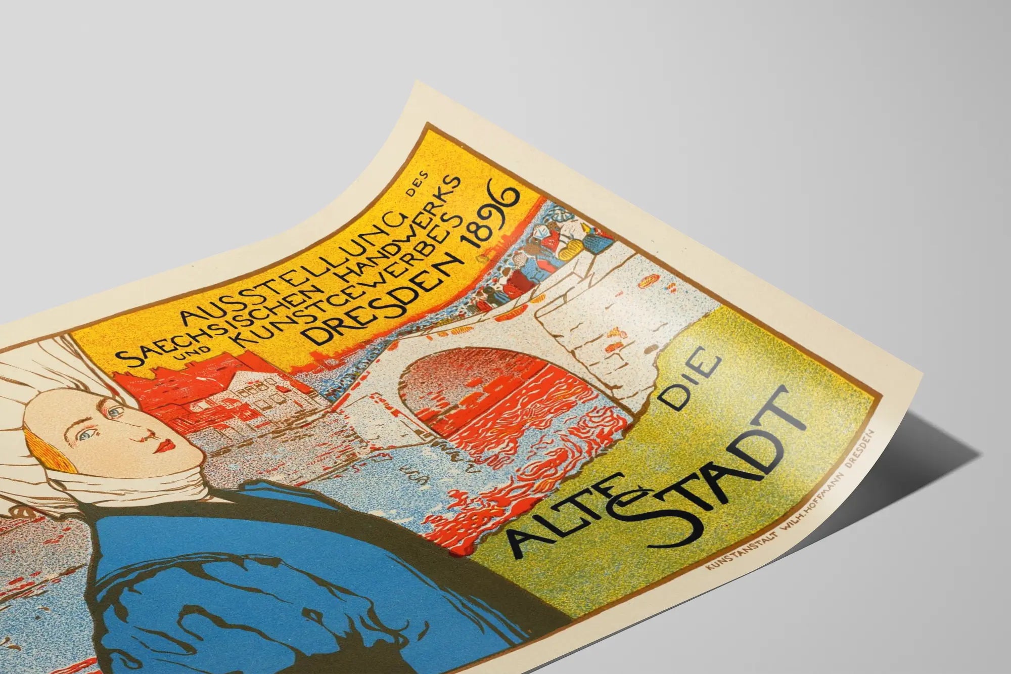 Den här vintageaffischen med titeln "Gamla stan" fångar med charm den konstnärliga och hantverksmässiga andan vid en utställning i Dresden 1896. Den grafiska kompositionen visar en pittoresk scen där en kvinna i traditionell klädsel drar blickarna till sig, framför en bakgrund som illustrerar en gammal bro och historiska byggnader vid en flod. Användningen av klara, kontrasterande färger — gult, rött, blått och grönt — ger liv åt detta väggdekoration, som förenar konst och tradition.