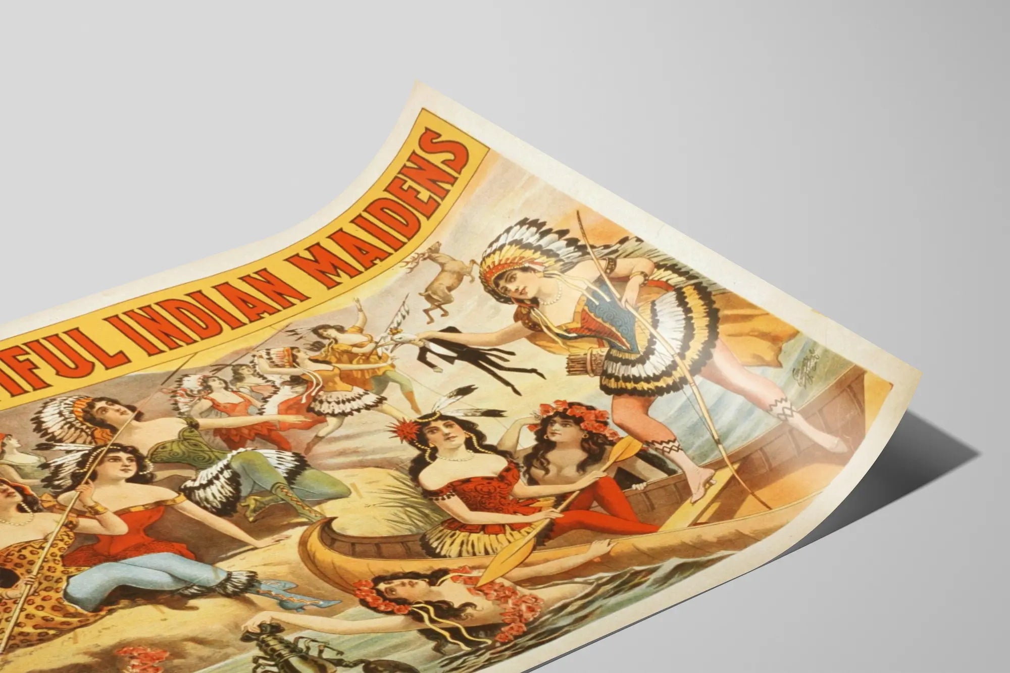 Upptäck denna vintageaffisch med titeln "The Beautiful Indian Maidens", en väggdekoration i fängslande retrostil. Den färgglada postern skildrar ett flertal unga kvinnor klädda i kostymer inspirerade av klassiska amerikanska ursprungsbefolkningens dräkter, prydda med fjädrar och traditionella tillbehör, i en rik och dynamisk komposition. Illustrationen visar en grupp av dessa unga kvinnor i olika poser och aktiviteter, några paddlar i en farkost, andra vid stranden eller i vattnet, alla samlade i en fantasivärld som blandar natur och folklore. Denna väggbild är perfekt för att tillföra en touch av originalitet och historia till ditt hem, genom att leka med nostalgi och estetik från gamla reklamaffischer. Med sina varma färger och noggranna detaljer passar denna väggdekoration utmärkt i ett vardagsrum, ett kontor eller ett fritidsrum, för en vintage- och konstnärlig atmosfär. Denna affisch är ett dekorativt föremål som kommer att glädja entusiaster av gammal grafisk konst, etniska motiv och naturalistiska scener.