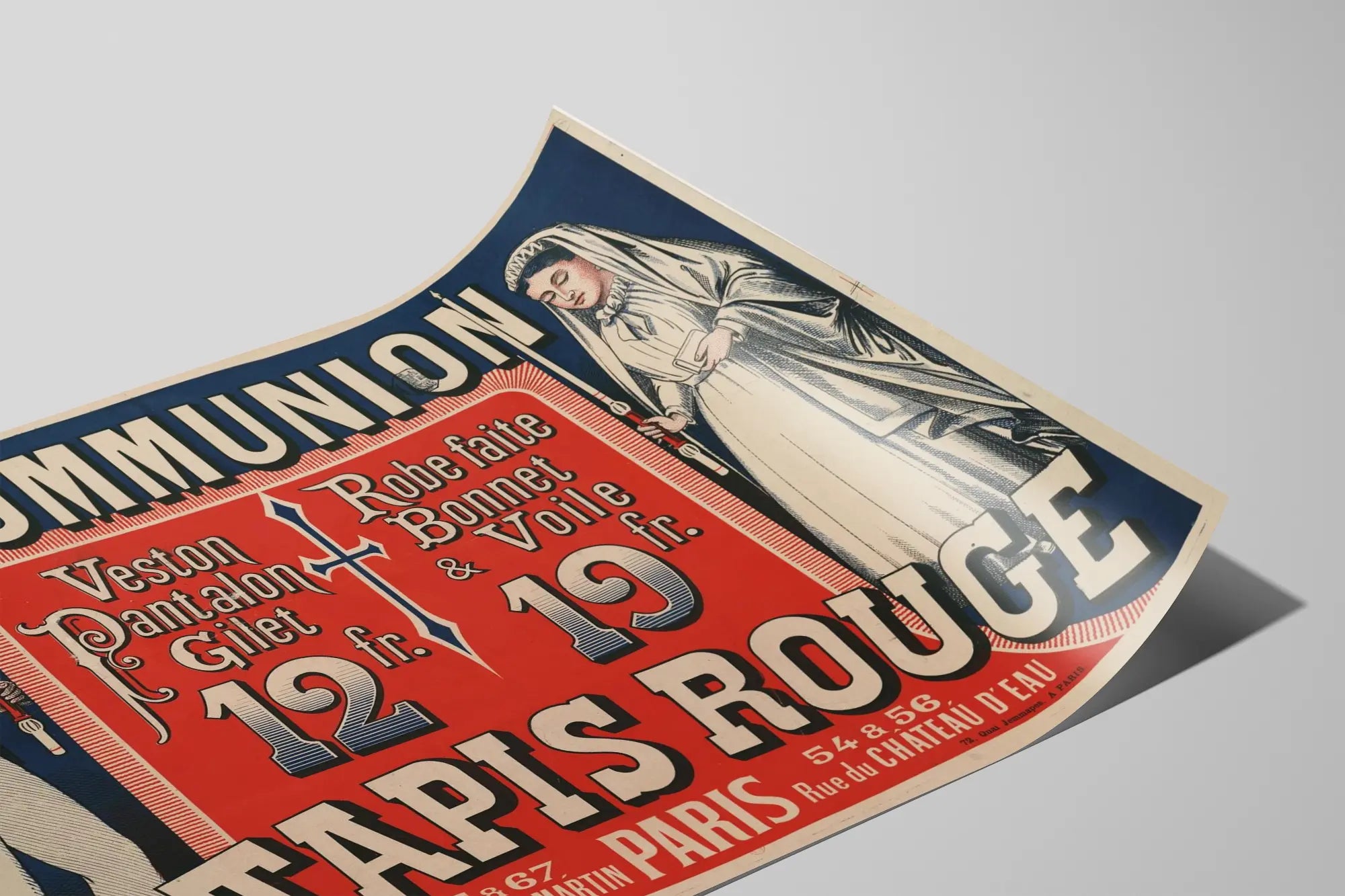 Denna vintageaffisch illustrerar en reklam för första kommunionkläder, med en pojke och en flicka klädda respektive i en kostym och en ceremoniklänning, typiska för den första religiösa kommunionen. På en kontrasterande blå och röd bakgrund visar den de artiklar som erbjuds i butiken Au Tapis Rouge, belägen på 65-67 rue du Faubourg Saint-Martin i Paris. Pojken bär en kavaj, byxor och väst, medan flickan har en klänning med mössa och slöja, vardera hållande ett ljus, symboler för denna traditionella högtid. Denna gamla reklamposter kombinerar en stiliserad grafik med starka och dekorativa typografiska element, kännetecken för affischer från början av 1900-talet.