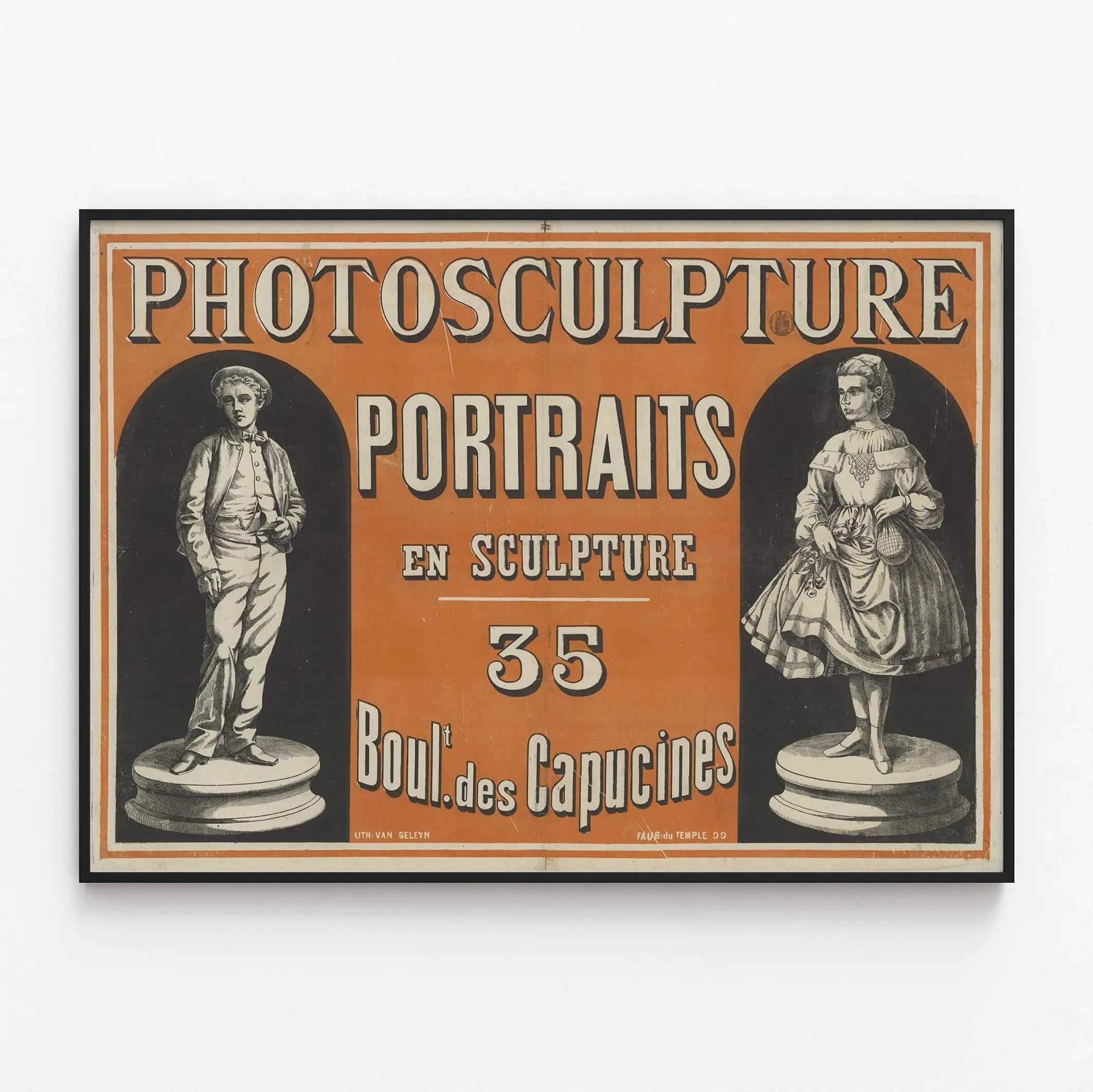 Den här dekorativa vintageaffischen lyfter fram den unika konstnärliga tekniken med porträttfotografisk skulptur, en originell konstnärlig metod som förenar fotografi och skulptur för att skapa tredimensionella porträtt. Bilden visar två detaljerade skulpturer föreställande en pojke och en flicka, vardera placerad på en rund bas. Affischen använder en livlig orange bakgrund som elegant kontrasterar mot de svartvita illustrationerna, vilket ger en retro och äkta karaktär till denna väggdekoration. Inskriptionerna i versaler tydligt markerar temat « FOTO-SKULPTUR PORTRÄTT I SKULPTUR » samt adressen « 35 Boul. des Capucines », vilket antyder en ikonisk plats där denna konstform visades eller skapades. Denna vintageaffisch är perfekt för konstälskare och väggdekorationer som söker ett unikt föremål som väcker traditionen av skulpterade porträtt och skönheten i det grafiska konstnärsskapet från förr. Idealisk för att pryda en vägg med en historisk och konstnärlig touch, passar denna affisch lika bra i ett modernt hem som i en mer klassisk miljö. Den passar harmoniskt in i en samling av gamla affischer eller kan fungera som ett blickfång i ett rum dedikerat till konstnärlig kultur. Inom inredningsdesign tillför denna vintageaffisch karaktär och en rik visuell historia tack vare sin noggrant utformade grafiska stil och sina realistiska skulpturala framställningar. Det är ett dekorativt val som inbjuder till reflektion kring traditionella konstnärliga tekniker och deras utveckling.