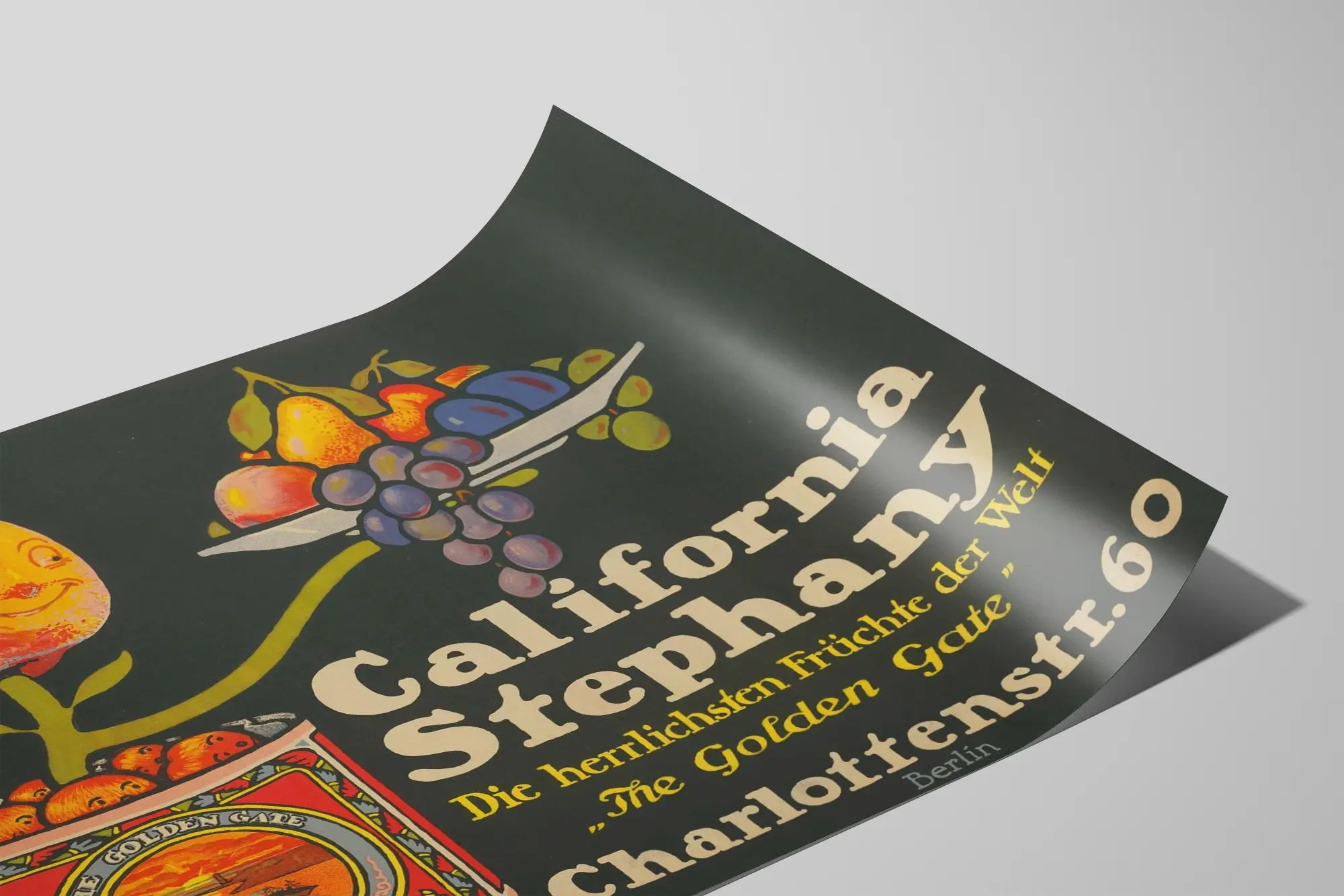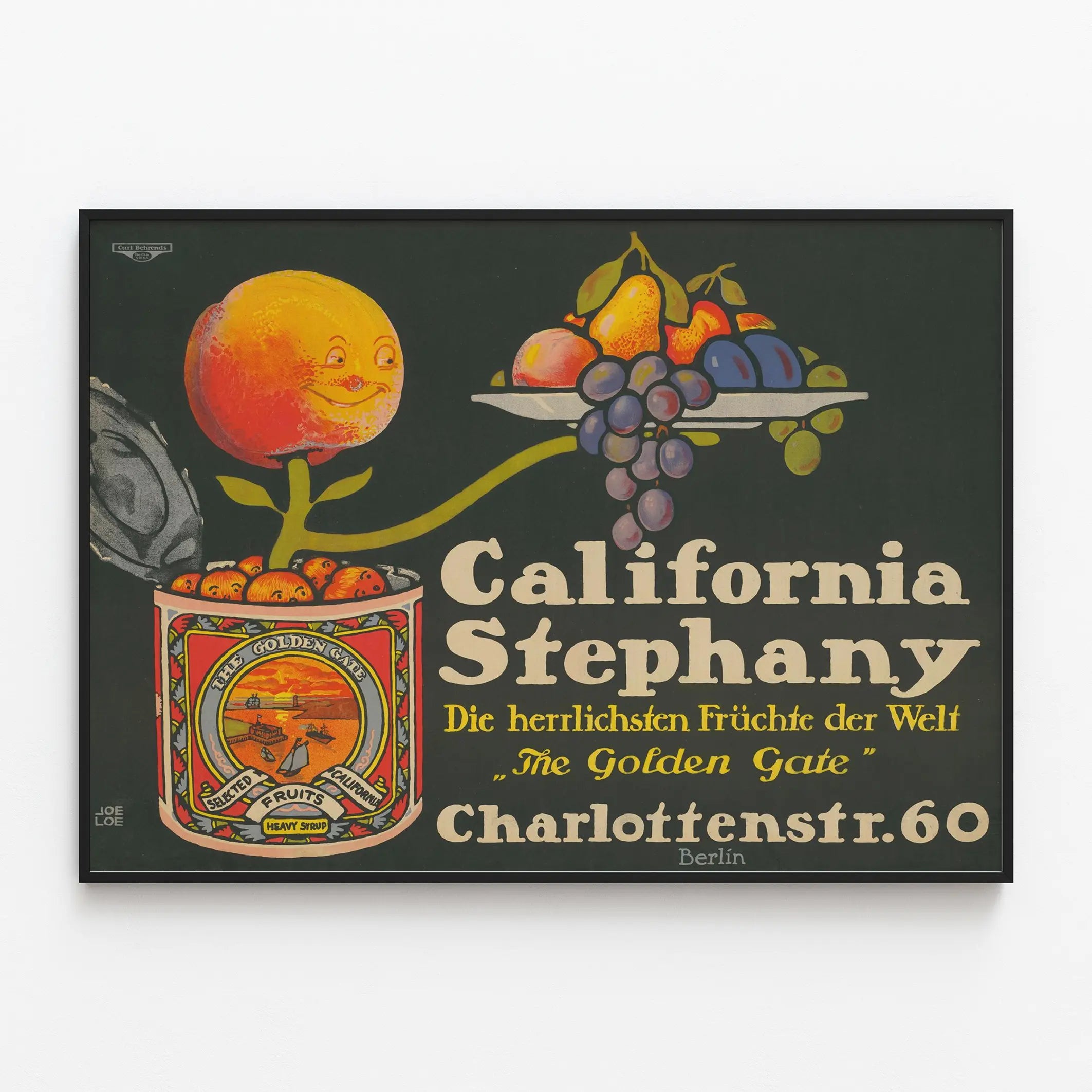 Denna vintageaffisch visar en färgstark och originell illustration av en burk med frukt från märket "California Stephany". I mitten av bilden står en leende, antropomorfisk apelsin placerad på en kvist, som håller en tallrik fylld med olika frukter: päron, persikor, druvor och andra färgglada frukter. Burken, dekorerad med en mycket detaljerad etikett i varma nyanser, bär texten "The Golden Gate" samt inskriptionen "Selected California Fruits". Den intensiva svarta bakgrunden gör att fruktens livfulla färger och den retroinspirerade typografin i olika nyanser av gult, off-white och grått framhävs. Denna affisch är signerad "Joe Loe" längst ner till vänster, vilket tillför en känsla av äkthet och retrostil till denna väggdekoration. Denna charmiga affisch från förr är perfekt för att tillföra en vintage- och gourmékänsla till ett kök, matsal eller ett avkopplingsutrymme. Den lyfter fram Kaliforniens fruktmångfald och rikedom med ett konstnärligt, fantasifullt och humoristiskt tillvägagångssätt. Oavsett om du är ett fan av vintageväggdekorationer, matillustrationer eller bara vill liva upp ditt hem, är denna affisch ett utmärkt val. Dess grafiska stil påminner om reklamaffischer från förr, perfekt för ett hem som vill kombinera nostalgi med ett originellt estetiskt uttryck. En väggdekoration som inbjuder till aptit och samtidigt skapar en varm, färgstark atmosfär.