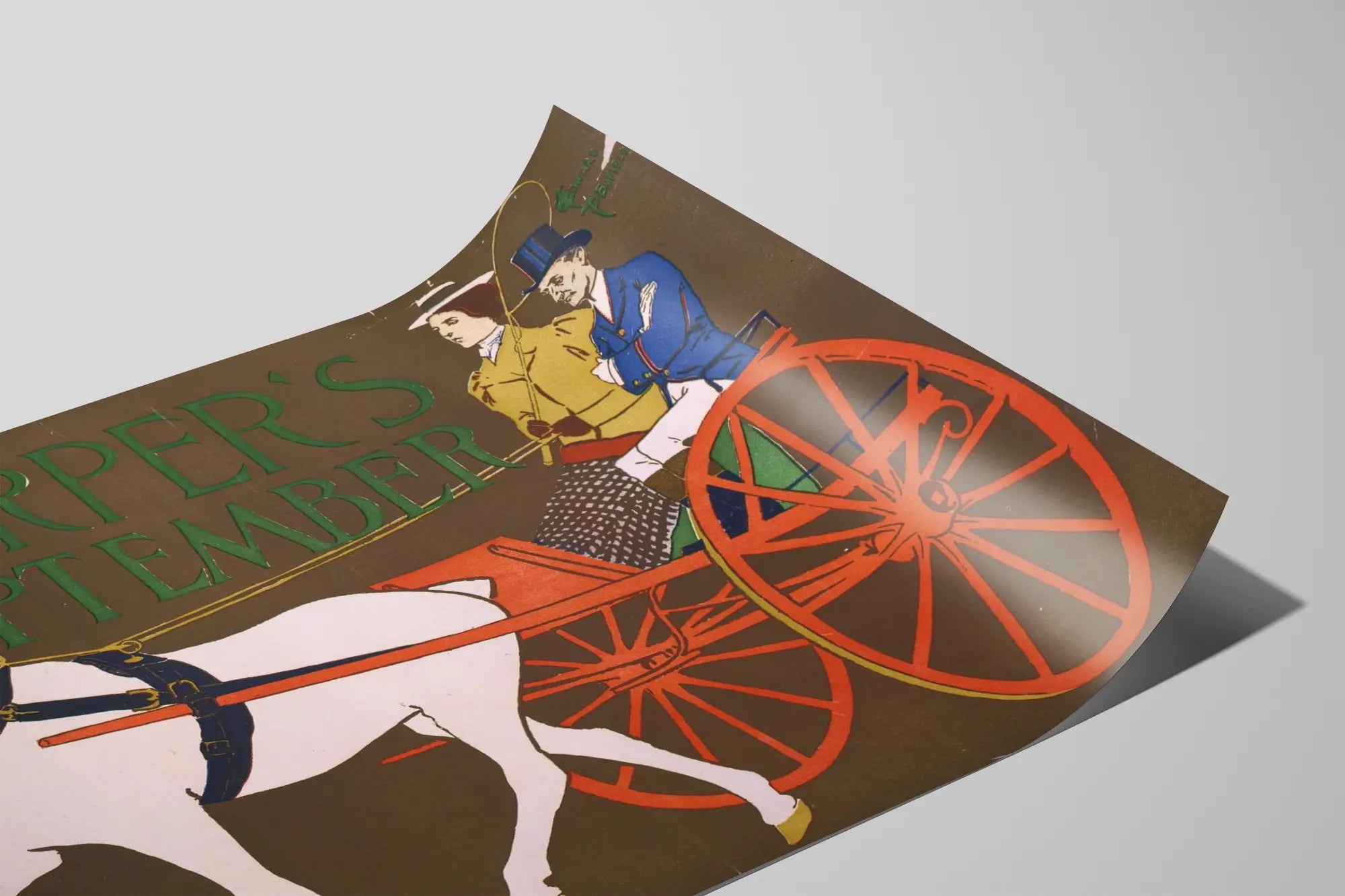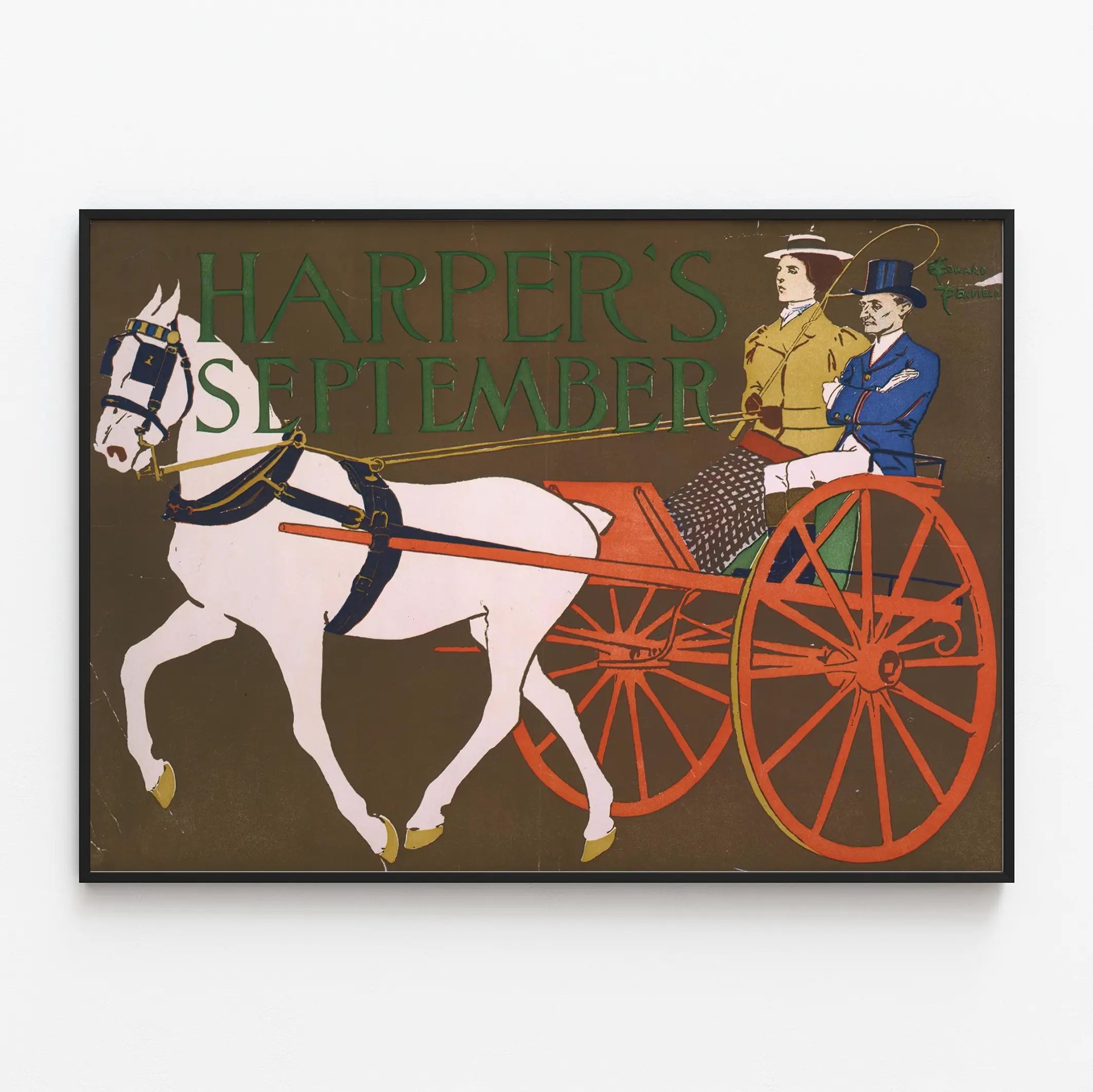Vintageaffisch Harper's september med häst och vagn och vit häst