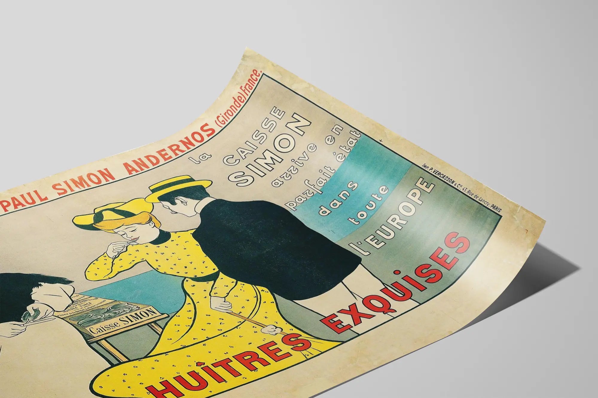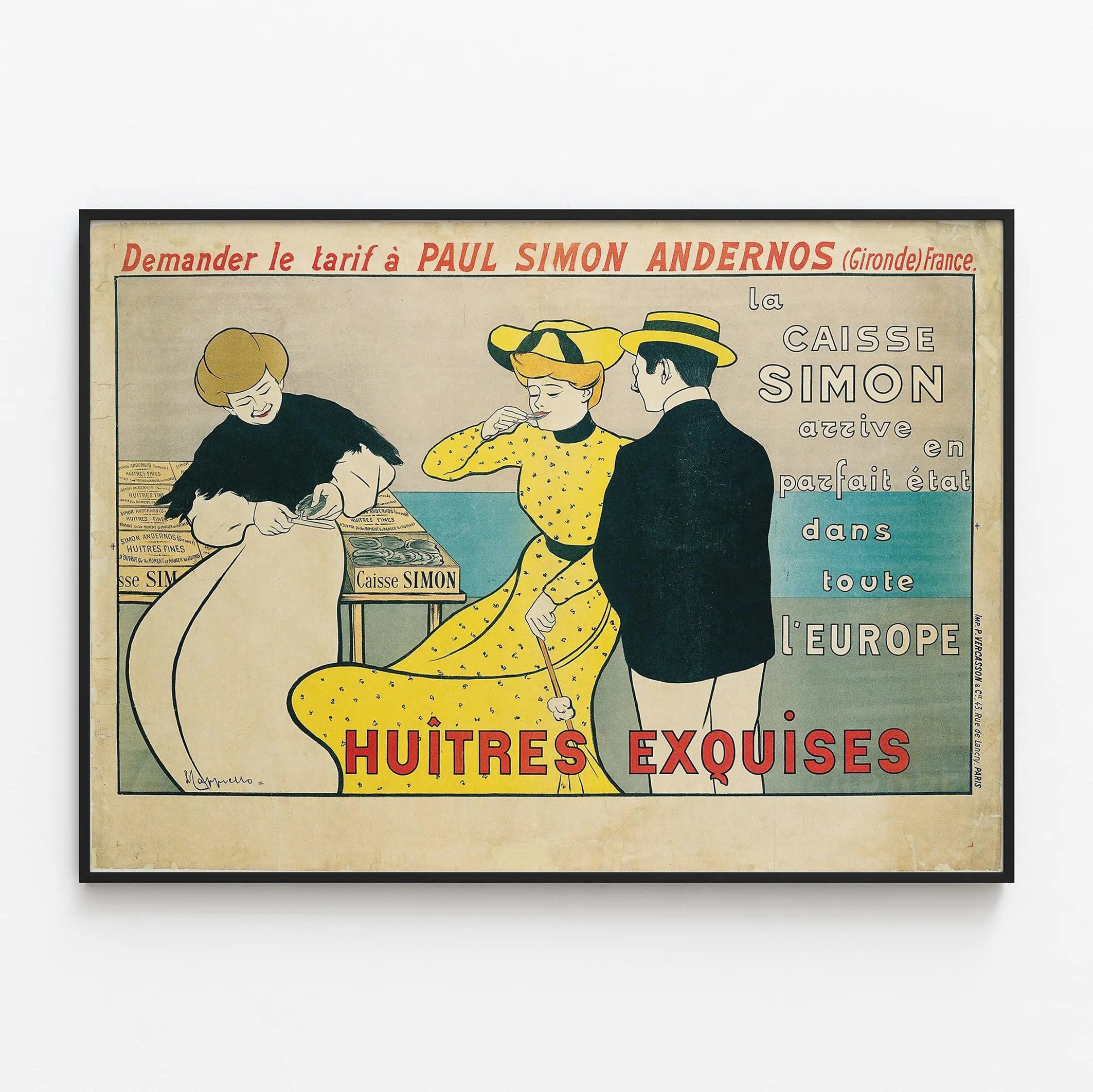 Denna vintageaffisch med titeln « La Caisse Simon » visar en annons för delikata och utsökta ostron. Den föreställer tre elegant klädda personer i en gammaldags stil, med en kvinna i gul klänning som njuter av en ostron, en man i svart jacka och hatt, samt en annan kvinna som öppnar en ostron med en kniv. I bakgrunden syns flera lådor märkta « Caisse Simon », vilket understryker ostronens kvalitet och färskhet.