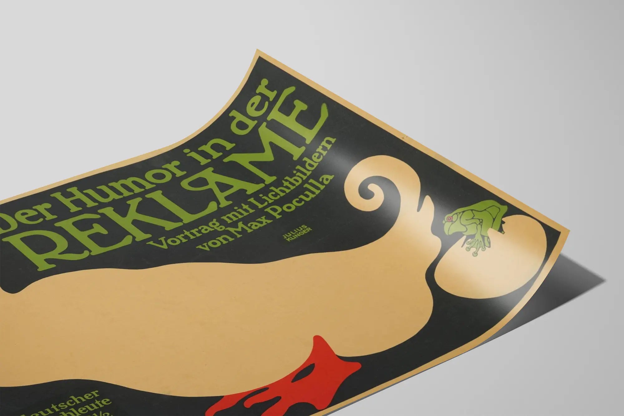 Upptäck denna originella vintageaffisch som illustrerar temat humor i reklam, med en design signerad Julius Klinger. Denna poster föreställer en stiliserad tupp i livfulla färger, dominerad av nyanser av rött, beige och grönt på svart bakgrund. Den grafiska kompositionen kombinerar ett djärvt typsnitt i vårgrön, som framhäver en text på tyska om humor i reklam, och hänvisar till ett evenemang eller en konferens av Max Poculla. Denna unika konstnärliga bit är perfekt för en äkta och originell väggdekoration, idealisk för ett retroinspirerat inomhusmiljö eller ett utrymme dedikerat till reklam- och visuellt skapande. Tack vare sin starka grafiska stil och sitt fängslande budskap ger denna affisch en konstnärlig och kulturell touch, perfekt för att personifiera ditt hem eller ditt kontor. Den passar utmärkt i en dekorativ miljö som kombinerar vintage och slående grafisk design, och skapar en stimulerande och originell atmosfär. Välj denna väggbild för att berika din samling av historiska affischer eller för en väggdekoration fylld av historia kring grafisk design och gammal reklam.