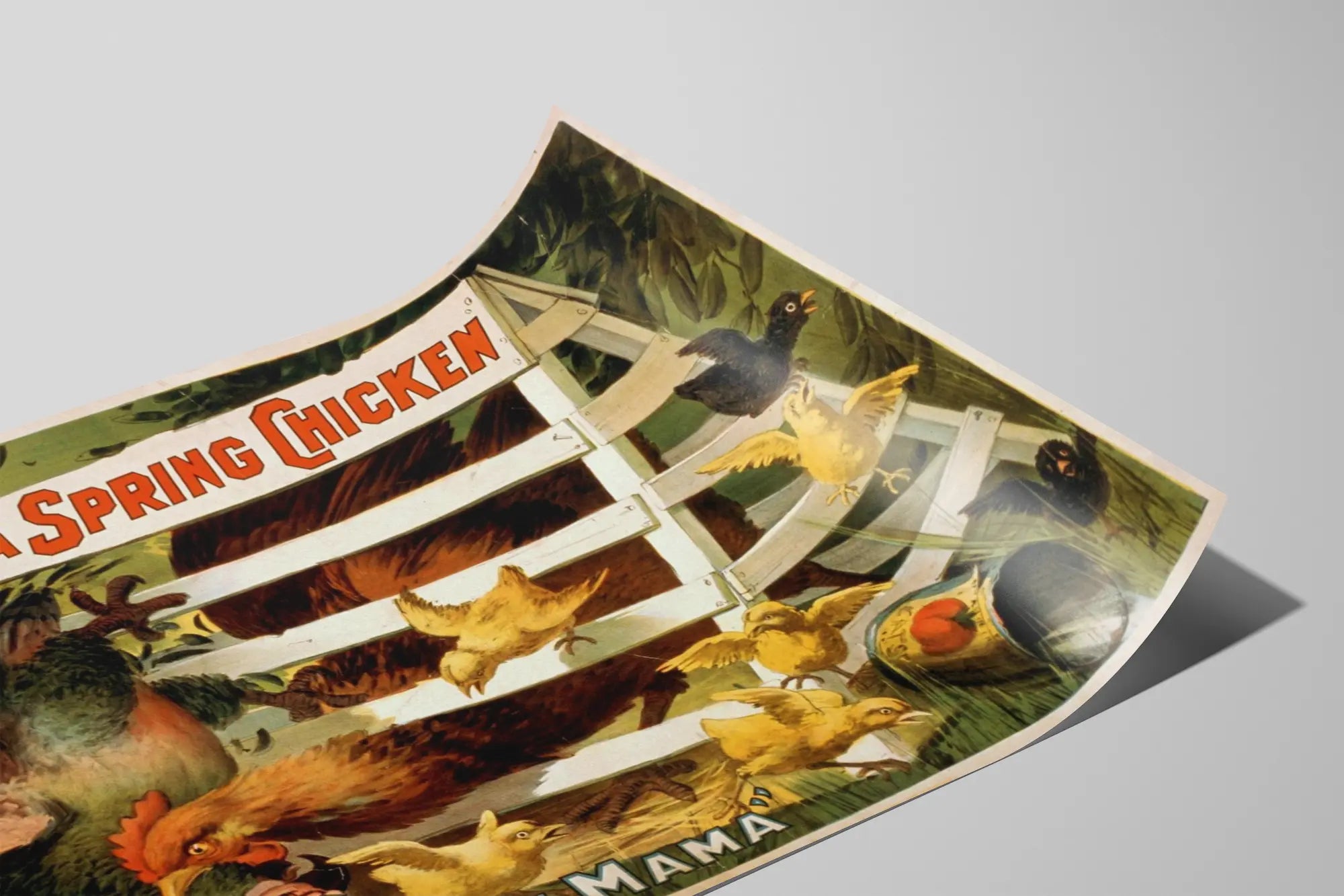 Upptäck denna humoristiska vintageaffisch med titeln "A Spring Chicken" av Selden, ett originellt och charmigt konstverk för din väggdekoration. Denna poster föreställer en höna mitt i ett skämt, fångad bakom en vit trästängsel, medan hennes kycklingar rör sig runt henne och förstärker den komiska och dynamiska scenen. Illustrationen är rik på detaljer, med ett subtilt spel på fåglarnas uttryck och en grönskande naturlig bakgrund. Texten högst upp på affischen, "Selden's Funny Farce A Spring Chicken", tillför en retro och äkta känsla, medan uttrycket längst ner, "Oh! Mama", förstärker den humoristiska tonen i verket. Denna poster passar perfekt i ett vintage-, rustikt eller lantligt inrett hem och ger en glad och vänlig atmosfär till dina väggar. Idealisk för entusiaster av originell och annorlunda väggdekoration, fångar denna stora affisch uppmärksamhet med sitt livfulla grafiska uttryck och varma färger. Oavsett om den hängs i ett kök, matsal eller vardagsrum, väcker denna djurillustration atmosfären med humor och äkthet. Lägg till en personlig prägel på ditt utrymme med denna charmiga och glädjefyllda väggdekoration, som kan harmonisera med olika inredningsstilar och samtidigt skapa ett attraktivt blickfång. En utmärkt idé för att ge liv åt dina väggar med en unik och uttrycksfull vintageillustration.