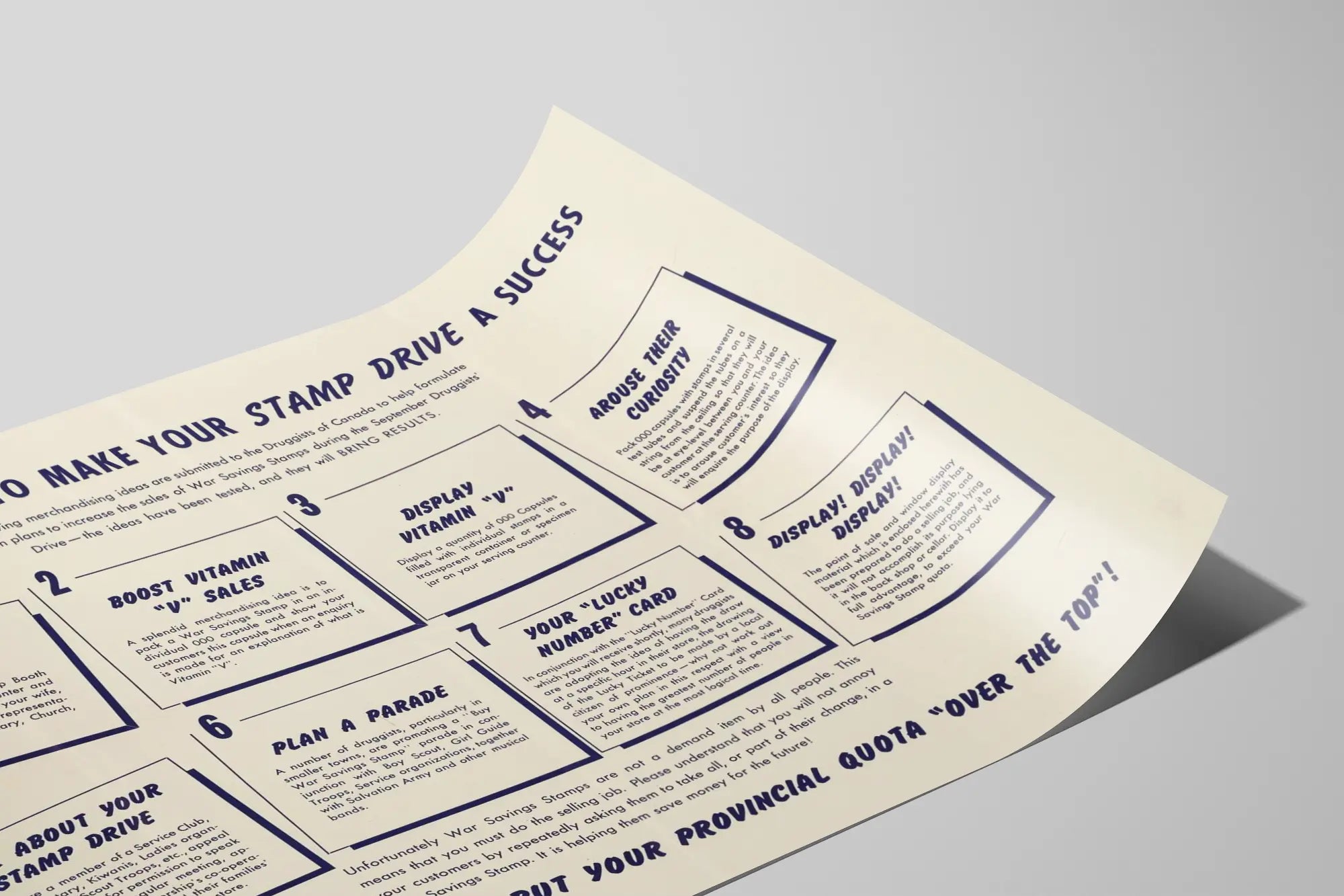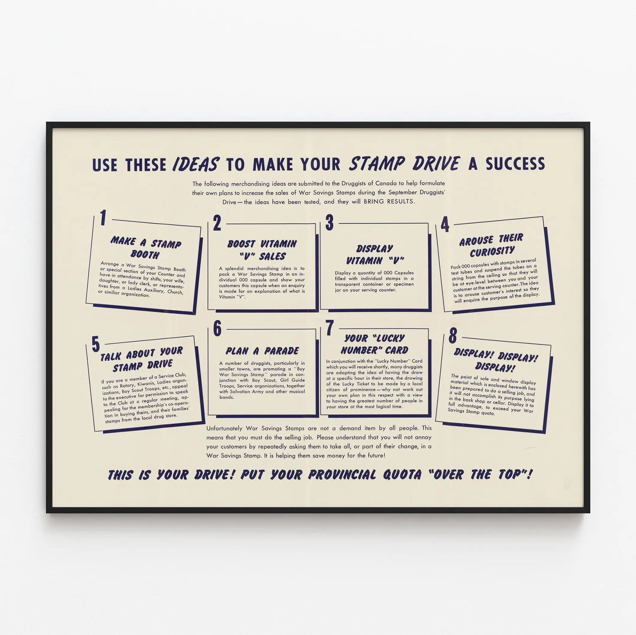 Den här vintagepostern visar en illustrerad och detaljerad guide för att skapa en dynamisk kampanj för frimärksförsäljning, särskilt War Savings Stamps. Utformad i en retrostil med handskriven mörkblå typografi på ljus bakgrund, erbjuder den åtta praktiska råd för att maximera den kommersiella effekten av din kampanj. Varje punkt är inramad för att fånga uppmärksamheten och underlätta läsningen, vilket gör denna poster till ett perfekt verktyg för utbildande och inspirerande väggdekoration.