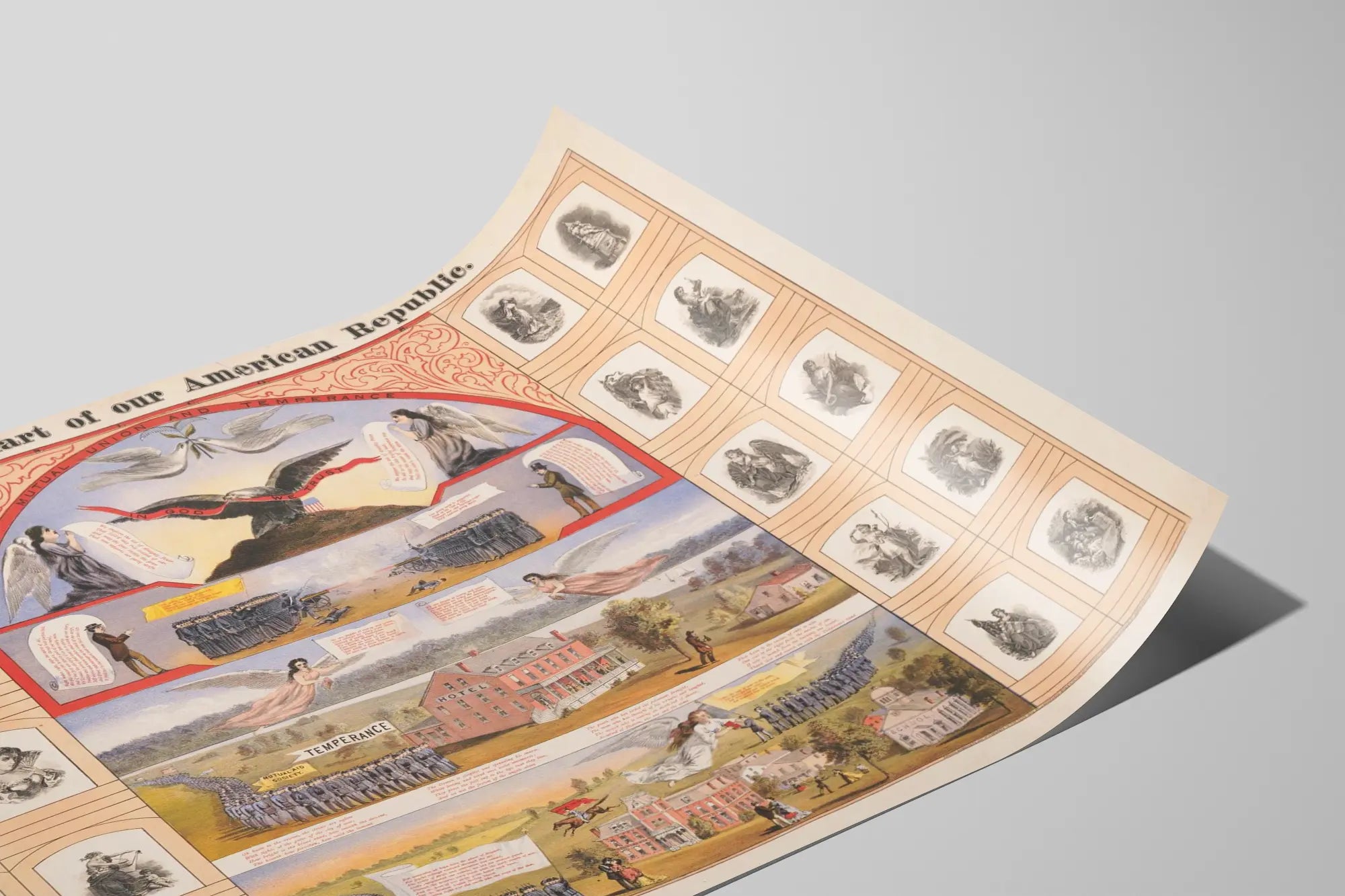 Den här vintageaffischen med titeln « Illustrated Chart of our American Republic » är en väggdekoration rik på illustrationer och historiska symboler. Den framstår som ett pedagogiskt och konstnärligt affisch, perfekt för historieentusiaster och älskare av retroinspirerad väggdekoration. Den centrala tavlan är inramad av svartvita gravyrer som föreställer olika personer och scener, inramade av arkitektoniska valv som ger en balanserad och harmonisk visuell struktur till hela kompositionen.
