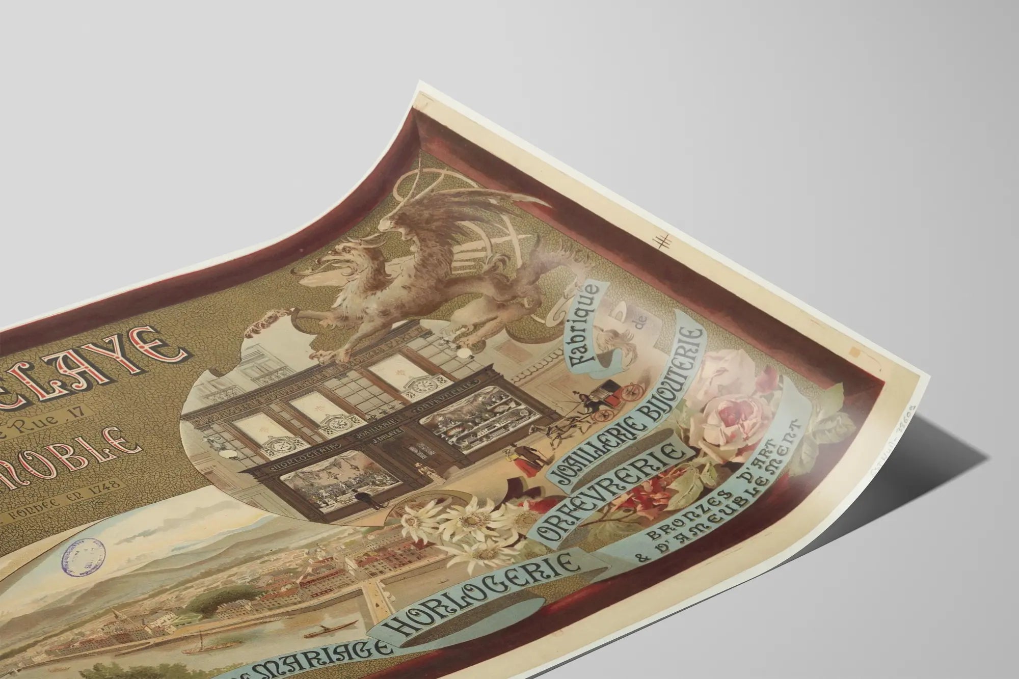 Upptäck denna vintageaffisch från huset J. Delaye, beläget på 17 Grande Rue i Grenoble, specialiserat på juveler, smycken, silversmide och urmakeri. Denna konstnärliga reklambild framhäver en välkänd fabrik, grundad 1748, med en detaljerad avbildning av butikens fasad, elegant dekorerad och med skyltfönster fyllt av ur- och juvelföremål. Bilden inkluderar en stiliserad mytisk drake, en pittoresk vy över Grenoble med dess floder och kullar, samt en fin blomsterkomposition med blommor som edelweiss och rosor, vilket ger en romantisk och naturlig prägel till denna väggdekoration. Rullade på målade banderoller lyfts husets olika yrken fram: bröllopskorg, urmakeri, juvelerare, smyckesfabrik, silversmide samt konst- och möbelbrons. Denna originella reklambild är ett utmärkt val för historieälskare, retroinredningsentusiaster eller för den som vill tillföra en äkta och vintagekänsla till sitt hem. Oavsett om den används som dekorativ affisch i ett vardagsrum, ett kontor eller ett kommersiellt utrymme, inbjuder denna bild till en tidsresa och illustrerar elegansen och det hantverksskicklighet som präglade 1700-talets Grenoble. Ge ditt hem en touch av gammal charm med denna vägginbjudan som förenar konst, tradition och enastående yrkesskicklighet.