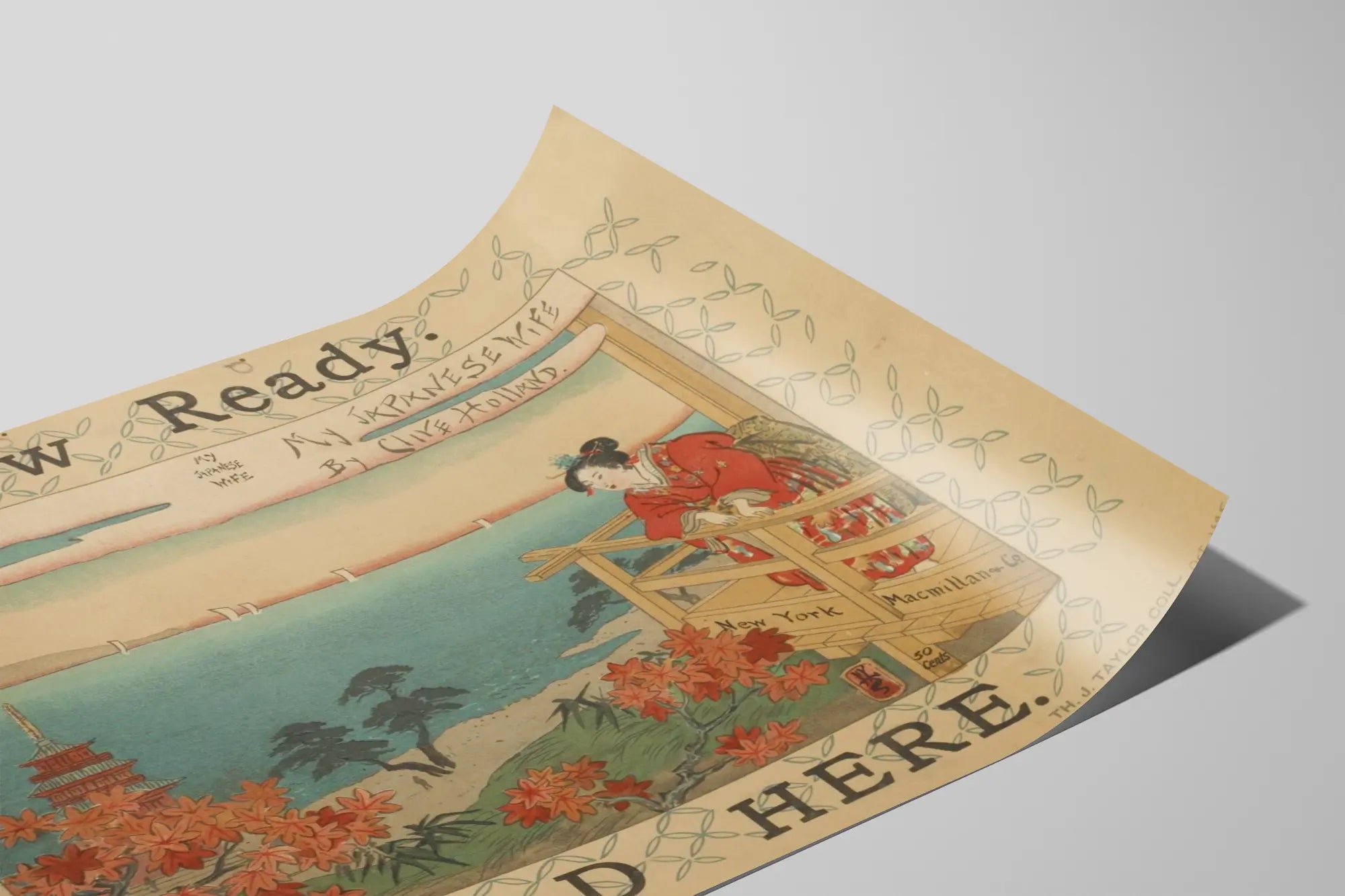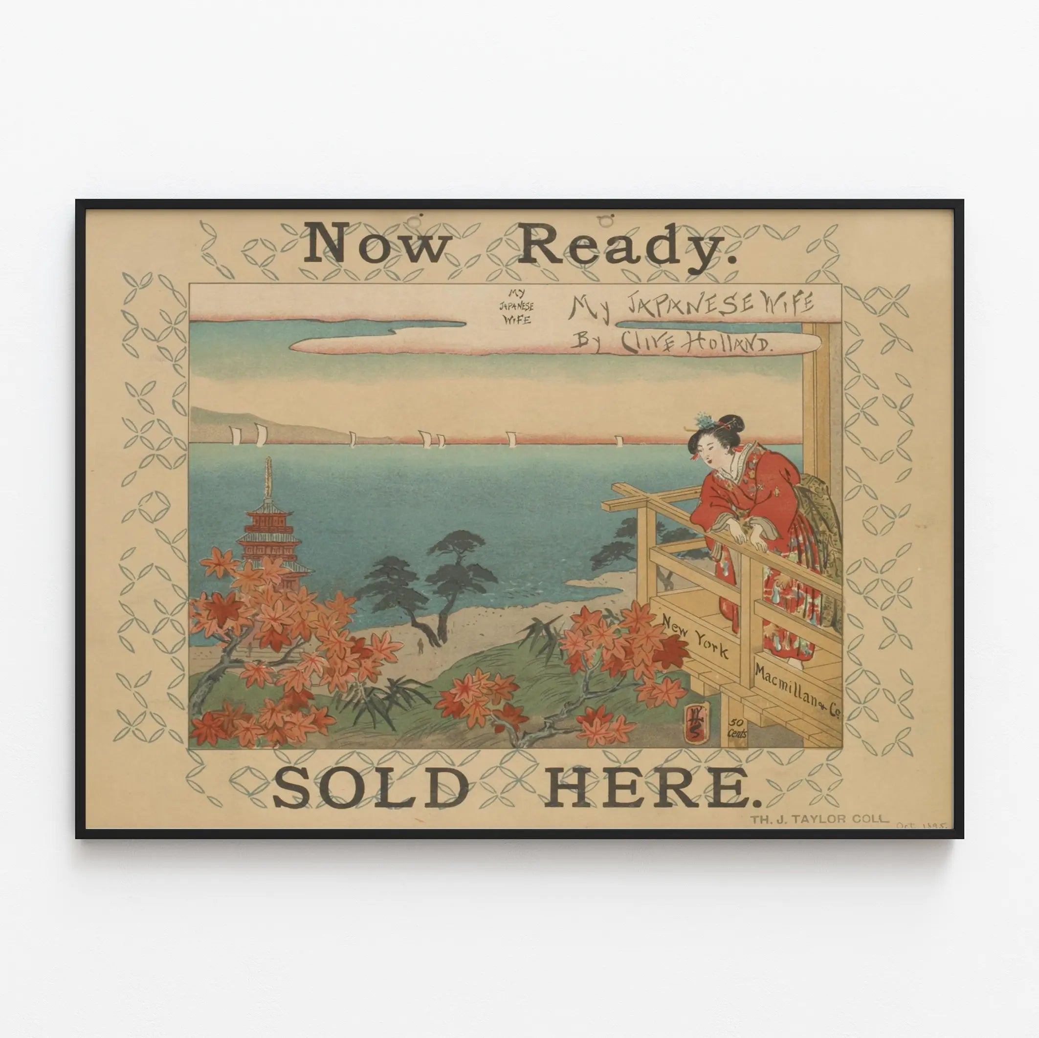 Upptäck denna vintageaffisch med titeln "Min japanska fru", en illustration signerad Clive Holland som fångar elegansen och lugnet i en traditionell japansk scen. Denna väggdekoration, i en stil inspirerad av japansk ukiyo-e, visar en kvinna klädd i en rikligt dekorerad röd kimono, stående på en träbalkong som blickar ut över ett stilla havslandskap. I bakgrunden skymtar ett panorama som blandar hav och natur med träd, en typisk pagod och vita segelbåtar på det lugna vattnet, vilket skapar en atmosfär som är både exotisk och nostalgisk. Färgpaletten använder mjuka och naturliga nyanser, med inslag av blått, grönt, orange och rött som bidrar till en harmonisk och lugnande helhet. Denna gamla affisch är inramad av en dekorativ kant bestående av ett repetitivt geometriskt mönster, vilket förstärker dess retrocharm samtidigt som det lyfter fram det centrala konstverket. Inskriptionerna på engelska "Now Ready", "Sold Here" och förlaget "New York Macmillan & Co." tillför en känsla av äkthet och historisk kontext till detta unika väggdekoration. Perfekt för älskare av japansk konst och vintageinredning, passar detta konstverk utmärkt för att försköna vardagsrum, salonger eller kontor som vill skapa en zen- och kulturinspirerad atmosfär. Affischen "Min japanska fru" är ett dekorativt verk som inbjuder till resa och eftertanke, där tradition och gammal estetik subtilt möts. Ett förfinat val för att berika din samling av affischer eller för att ge ditt hem en touch av exotism och elegans.