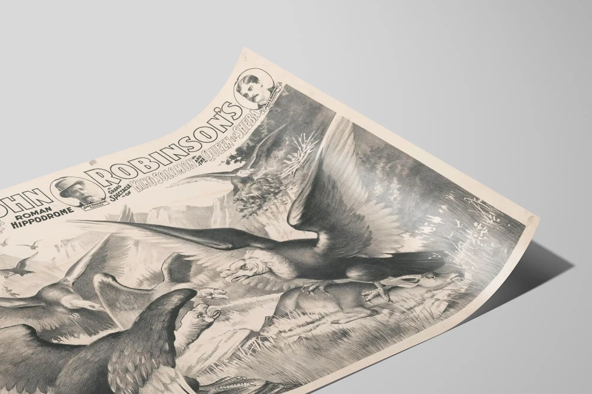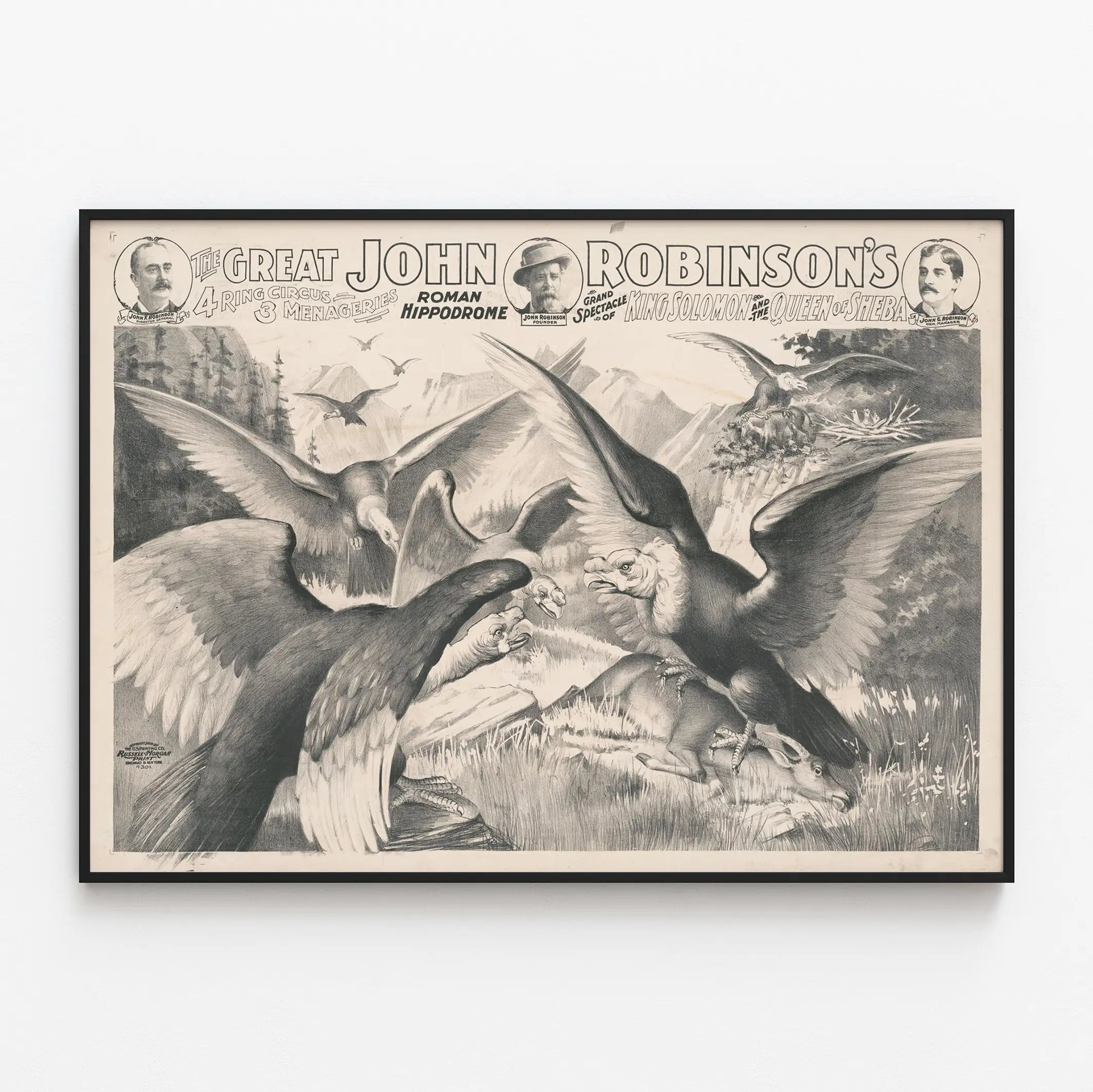 Upptäck denna originella vintageaffisch som hyllar "The Great John Robinson's 4 Ring Circus" och visar ett storslaget spektakel med titeln "King Solomon and the Queen of Sheba". Den svartvita postern föreställer en imponerande djurscen med kraftfulla rovfåglar i full fart och jakt, samt vilda djur på marken, mot en naturlig bakgrund av berg och skogar. Den detaljerade illustrationen fångar naturens dynamik och kraft, med en rik sammansättning av texturer och grå nyanser som gör den till en äkta och fängslande väggdekoration. Uppe på affischen finns porträtt av tre nyckelmän kopplade till cirkusen: John F. Robinson, chef, John Robinson, grundare, och John G. Robinson, generalmanager. Denna poster passar perfekt som väggdekoration med vintage-, djur- eller historiskt tema, och kan tillföra en unik och retro touch till ditt hem. Det är ett samlarobjekt för cirkussentusiaster, historia om underhållning och gamla affischer, idealiskt som tavla eller affisch för att pryda ett vardagsrum, ett kontor eller ett tematiskt utrymme. Kvaliteten på detta grafiska dokument kommer fint att pryda dina väggar samtidigt som det berättar en stark visuell historia, en spegling av tidsenligt nöje.