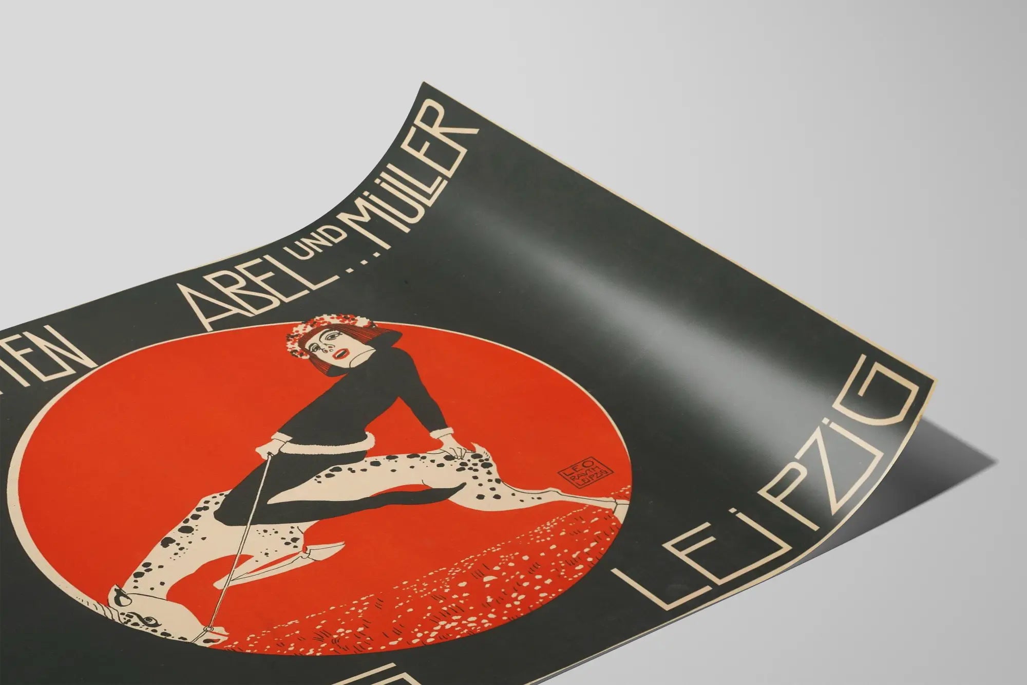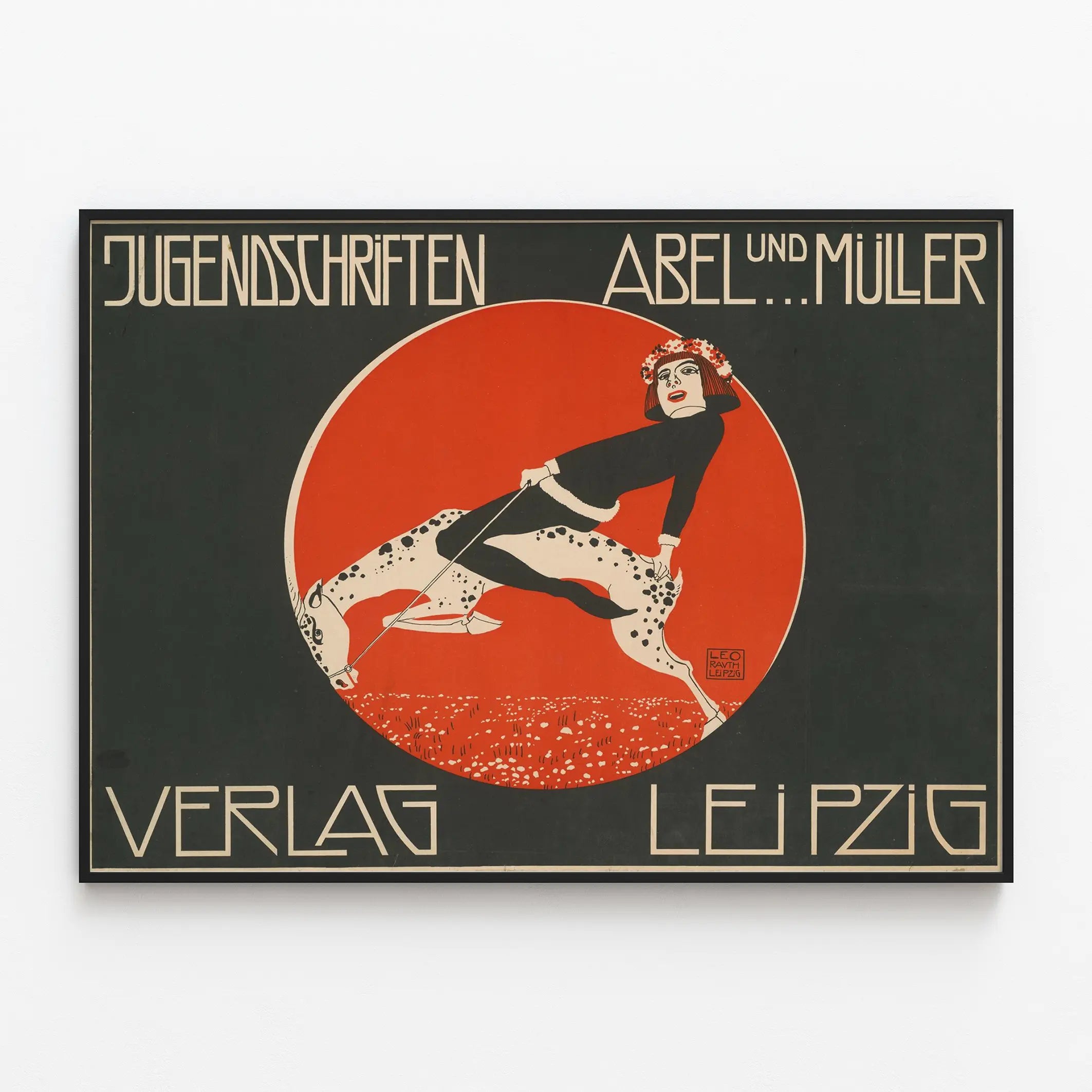 Upptäck denna vintageaffisch med stark grafisk stil, perfekt för en originell väggdekoration full av karaktär. Denna poster föreställer en ung kvinna klädd i svart, med en krans av röda blommor i håret, som rider på en vit fläckig häst. Allt är inramat av en rund, intensiv röd bakgrund som vackert kontrasterar mot den dominerande svarta färgen i resten av kompositionen. Denna reklamaffisch annonserar "Jugendschriften" från Verlag Abel och Müller i Leipzig, och lyfter fram en typografisk design och illustration som är typisk för början av 1900-talet. Perfekt för en väggdekoration i ett retro- eller konstnärligt inrett hem, ger denna affisch ett starkt visuellt intryck till vilket utrymme som helst. De enkla men effektfulla färgerna (röd, svart, vitt) och den stiliserade teckningen gör denna affisch till ett unikt inredningselement, både vintage och modernt. För entusiastiska samlare av gamla affischer eller för den som söker en originell väggdekoration, är denna poster ett föremål som omedelbart fångar uppmärksamheten tack vare sitt distinkta grafiska uttryck och harmoniska komposition. Lätt att hänga upp, erbjuder denna affisch ett konstnärligt alternativ för att dekorera ett vardagsrum, ett kontor eller en butik med en prägel av historia.