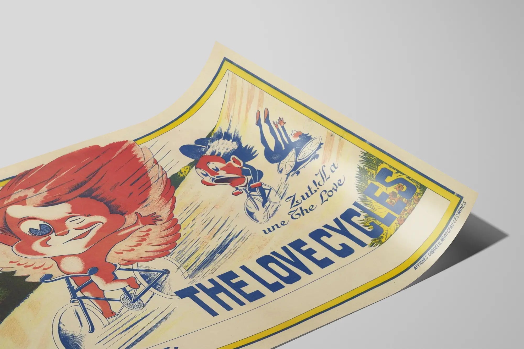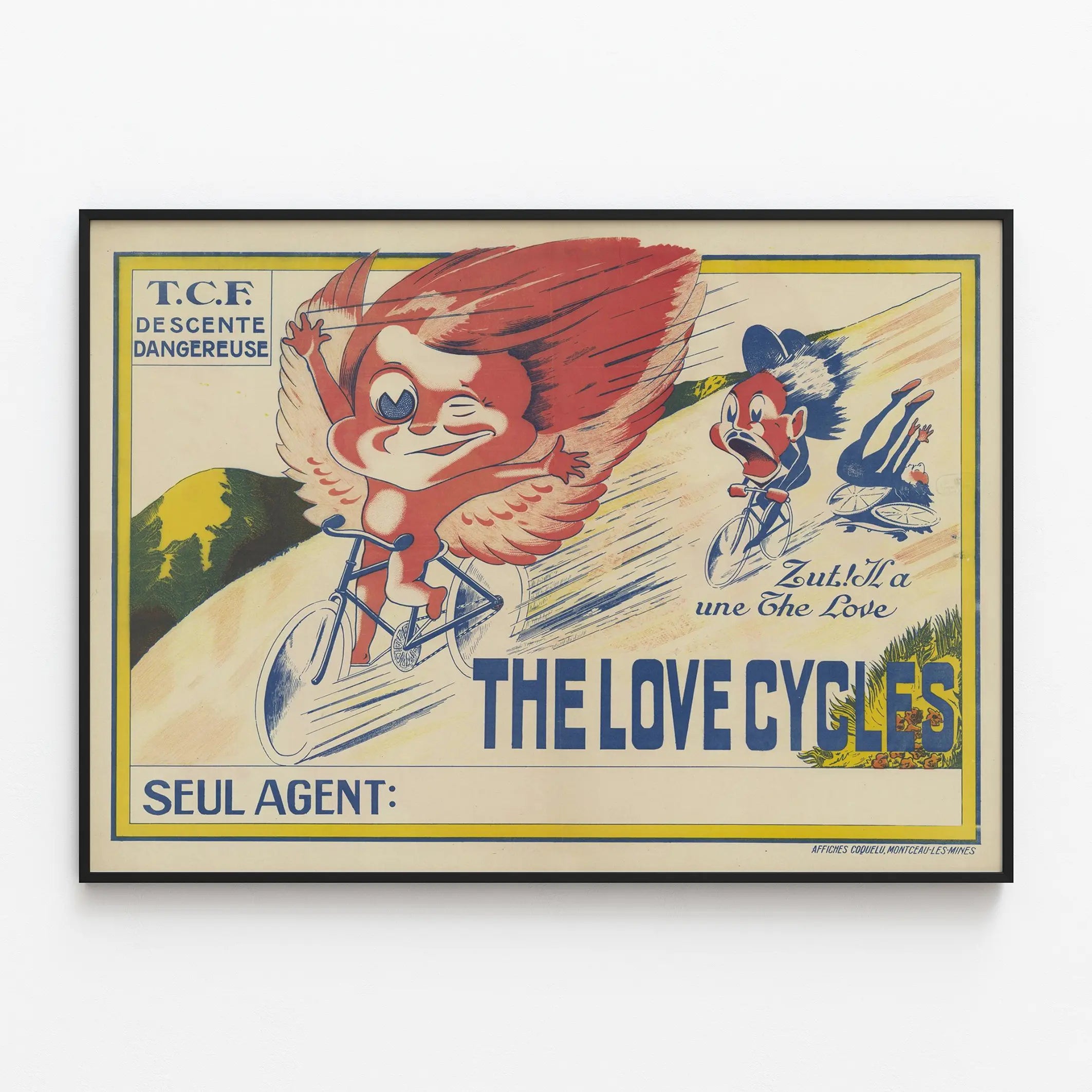 Denna vintageaffisch i färg illustrerar på ett humoristiskt och dynamiskt sätt en cykelloppsscen präglad av en farlig nedförsbacke. I förgrunden ser man en karikatyrfigur med överdrivna drag, stora ögon och röda vingar, som rider på en cykel med ett listigt uttryck och en blinkning. I bakgrunden verkar en annan figur tappa kontrollen över sin cykel, vilket illustrerar riskerna med denna snabba nedförsbacke. Texten i versaler "THE LOVE CYCLES" understryker scenens centrala tema, medan andra inskriptioner som "T.C.F. DÖDSFARLIG NEDFÖRSLÄPP" varnar för den farliga karaktären av loppet. Den gula ramen omger hela bilden, vilket ger den ett inramat och färdigställt utseende.
