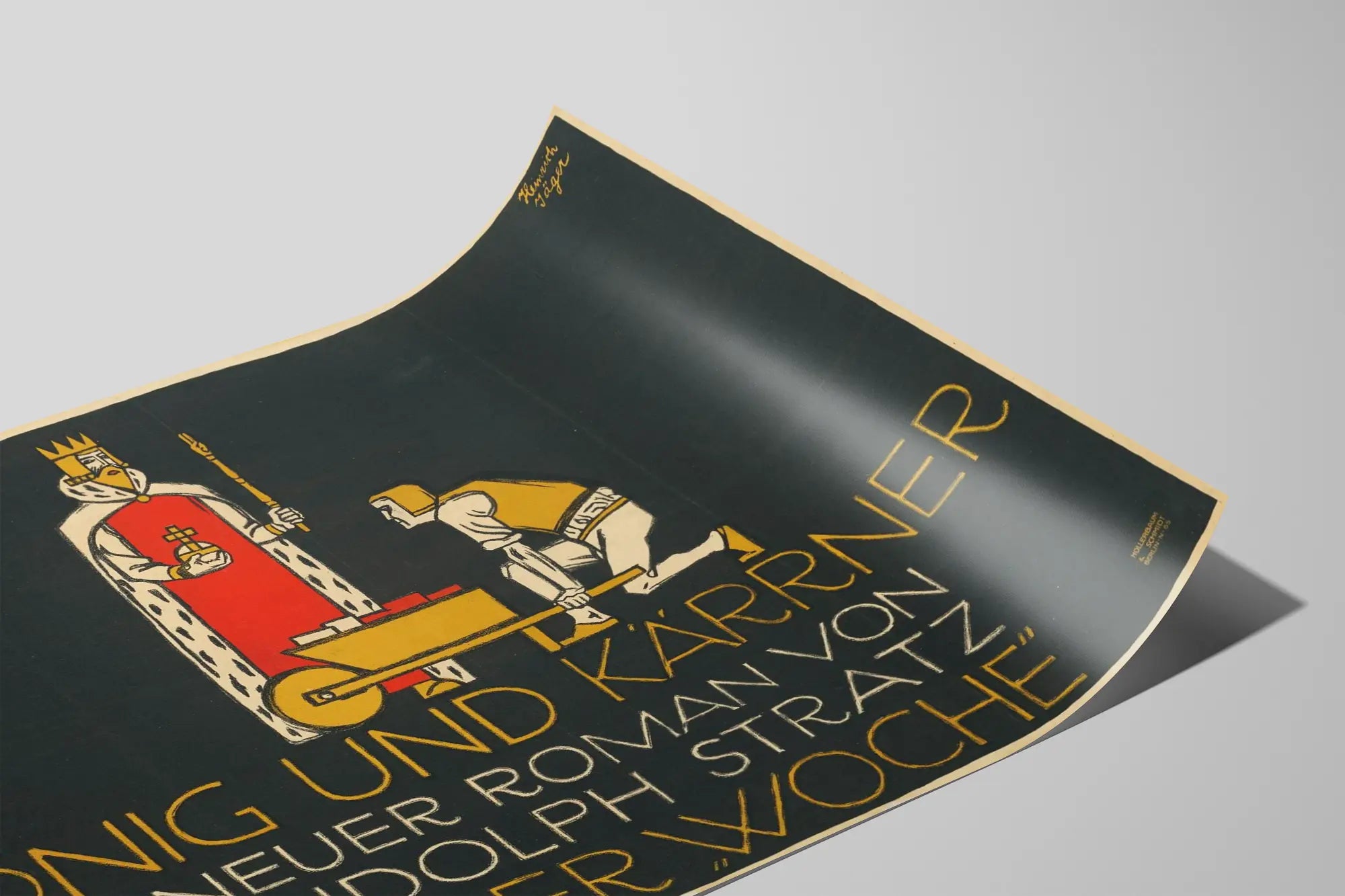 Denna vintageaffisch med titeln "König und Kärrner" är ett ikoniskt inslag i väggdekoration med tydlig grafisk stil, skapad av illustratören Heinrich Jäger. På en mörk bakgrund skildrar den två stiliserade figurer med rena linjer: en kung med krona, iklädd en vit mantel med svarta prickar, som håller en scepter och en jordglob, tillsammans med en knäböjande man som skjuter en träskottkärra fylld med färgglada block. Kontrasten mellan varma nyanser som rött, ockra och vitt mot en svart bakgrund förstärker den dramatiska och symboliska känslan i bilden. Denna affisch annonserar en ny roman av Rudolph Stratz, vars tyska titel betonar den litterära och kulturella aspekten av verket, vilket ger en narrativ dimension till väggdekorationen. Perfekt för entusiaster av retrokonst och typografisk grafik, är detta gamla affisch idealiskt för att skapa en vintageatmosfär i vardagsrummet, kontoret eller biblioteket. Dess enkla men uttrycksfulla komposition fångar ögat och väcker eftertanke, samtidigt som den tillför en äkthetskänsla till väggarna. Oavsett om du samlar eller dekorerar, ger denna affisch en stark visuell identitet och ett historiskt prägel till ditt hem. Ge din väggdekoration en touch av retro elegans med detta verk med enkla linjer och karakteristisk typografi.
