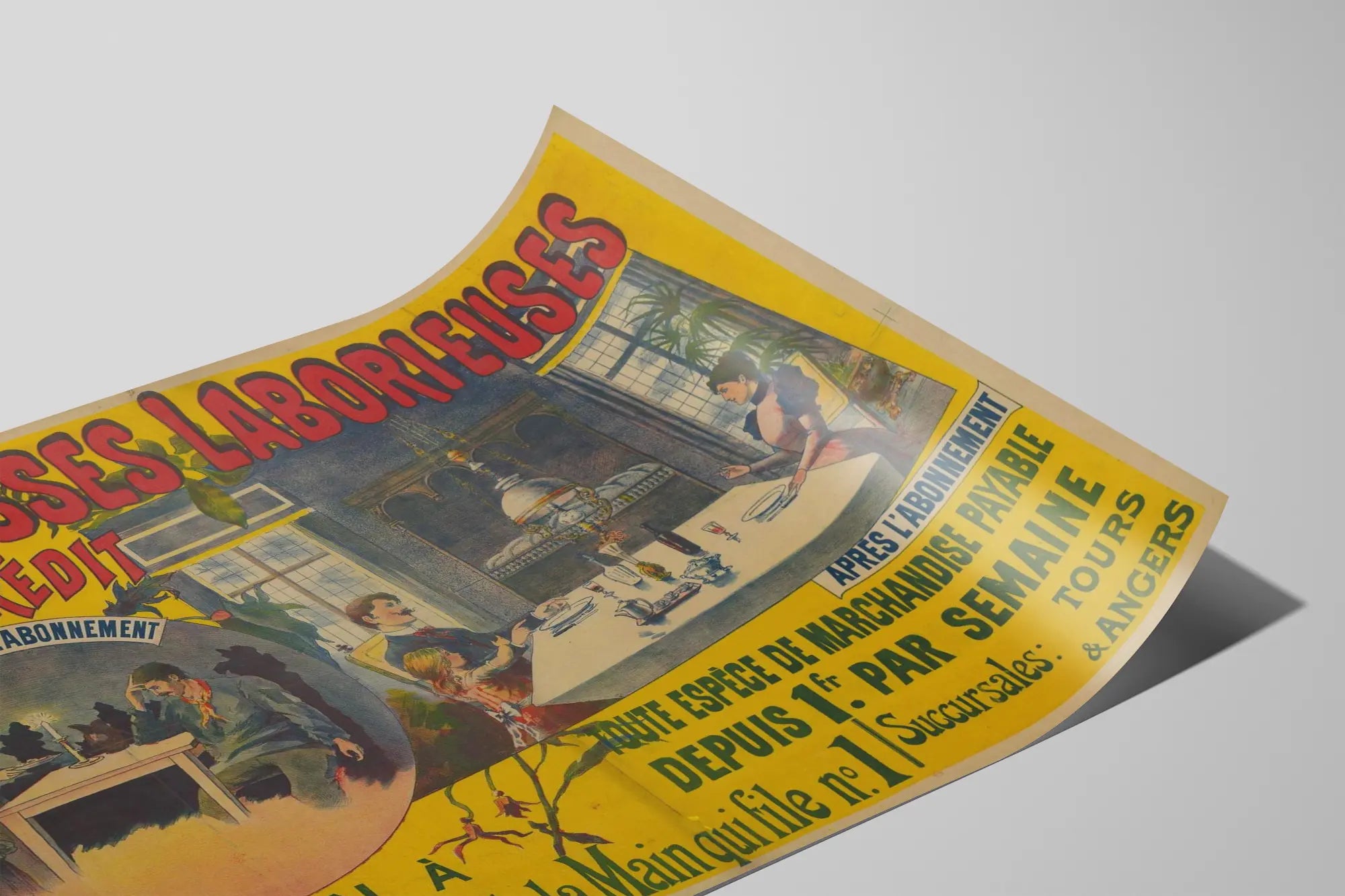 Affischen nämner uttryckligen att erbjudandet gäller alla typer av varor som kan betalas från en franc per vecka, vilket möjliggör en avbetalning som är tillgänglig för arbetare med modest inkomst. Huvudhuset är beläget i Orléans, Rue de la Main som går nr 1, med filialer i Tours och Angers, vilket indikerar en märkbar regional närvaro.