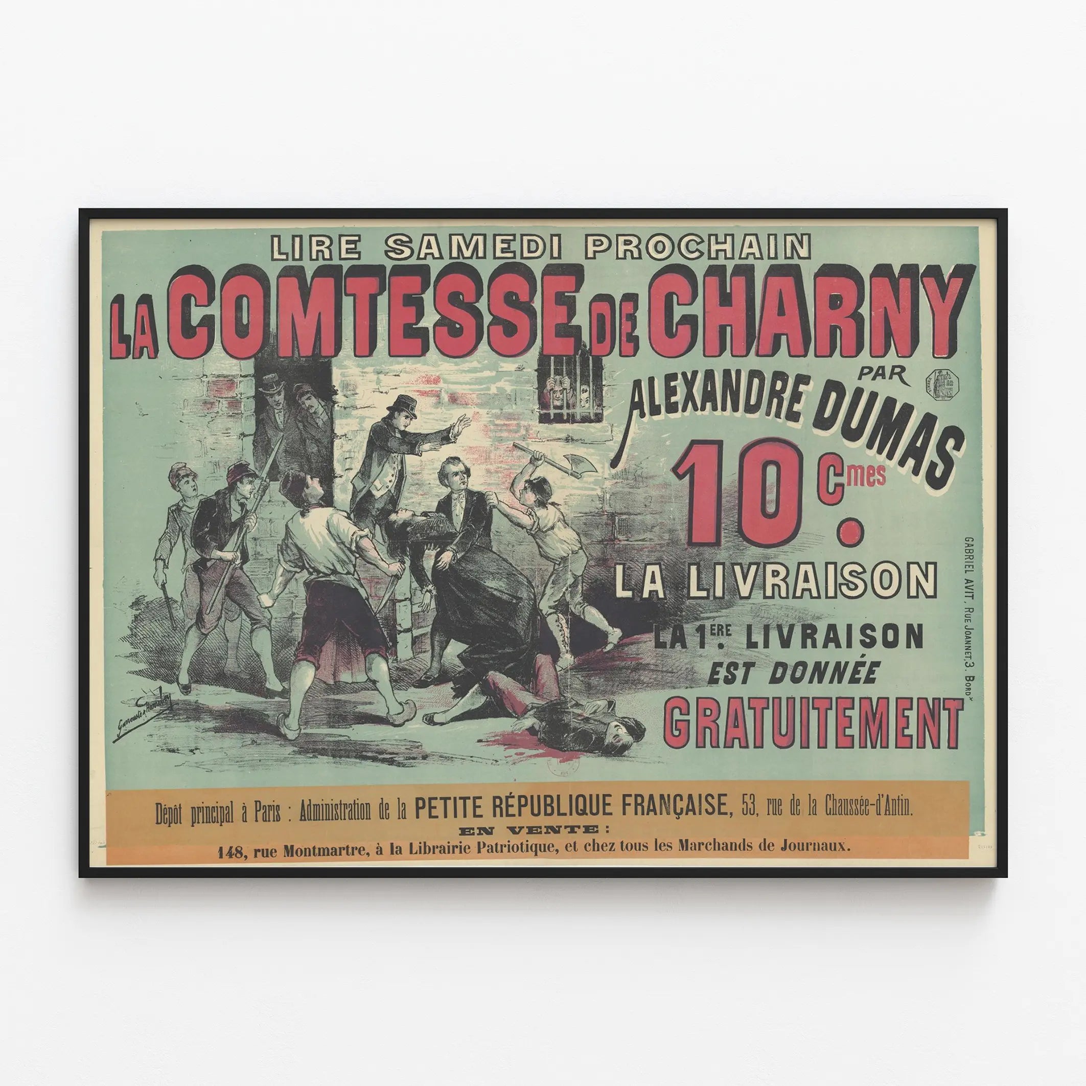 Denna vintageaffisch annonserar den kommande utgivningen av romanen "Hertiginna av Charny" av Alexandre Dumas. En ikonisk poster som återspeglar den gamla grafiska stilen, där titeln framhävs med iögonfallande röda och svarta bokstäver på en ljus bakgrund, vilket ger en retro touch till din väggdekoration. Illustrationen i mitten visar en dramatisk och livlig scen, med en grupp karaktärer i full konfrontation kring en man i kostym, vilket understryker berättelsens intensitet. Denna tavla skapar en atmosfär av historia och litteratur, perfekt för entusiaster av klassisk litteratur och vintage design. Denna litterära läsaffisch framkallar också en typisk stämning från de små franska republikerna, med en kampanjtext som meddelar att den första leveransen av romanen är gratis, vilket betonar dess gamla och autentiska karaktär. Ett perfekt dekorativt element för att personifiera ett läsrum, ett kontor eller ett vardagsrum, och tillföra en touch av historia och kultur direkt på dina väggar. Hela bilden använder kontrasterande färger som fångar ögat samtidigt som de är harmoniska, vilket gör den till en attraktiv och historisk väggdekoration. Välj denna unika poster för att förhöja ditt hem med ett väggdekoration som berättar en historia och hyllar Alexandre Dumas penna.