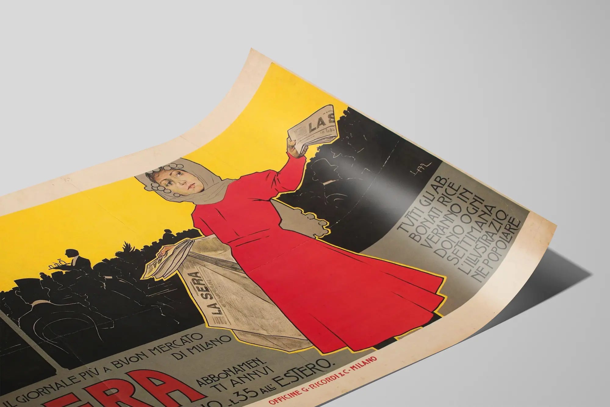Upptäck denna originella vintageaffisch med titeln "La Sera", en verklig klassiker inom väggdekoration i retro- och grafisk stil. Denna färgglada och retroaffisch skildrar en ung kvinna iklädd en röd tunika och ett grått halsduk, som delar ut tidningar "La Sera" till en folkmassa av män i svarta silhuetter, klädda i tidsenlig stil, mot en ljusgul bakgrund. Den fångar omedelbart uppmärksamheten med sitt slående kontrast mellan de livfulla färgerna för huvudpersonen och de mörka silhuetterna i bakgrunden, vilket skapar en perfekt estetisk balans mellan energi och elegans. Perfekt att hänga på väggen för att tillföra en vintage och dynamisk touch till ditt hem, är denna affisch idealisk för entusiastiska väggdekorationer och älskare av gammal grafisk design. "La Sera"-affischen speglar en urban och folklig atmosfär, och föreställer en tidsenlig scen där utdelning av tidningar symboliserar en viktig social kommunikation. Dess harmoniska komposition och noggrant utvalda färgpalett gör den till ett unikt dekorationsobjekt, som passar lika bra i ett vardagsrum, ett kök eller ett kontor, och tillför charm och en historisk ton. Denna affisch är ett dekorativt plakat som särskilt tilltalar samlare och älskare av italiensk vintage-stil. Dess generösa mått gör den till en iögonfallande väggmålning, lätt att framhäva i en både inbjudande och kulturell atmosfär. Ge dina väggar en äkta karaktär inspirerad av en avlägsen tid med denna "La Sera"-affisch, ett perfekt val för en originell väggdekoration full av karaktär.