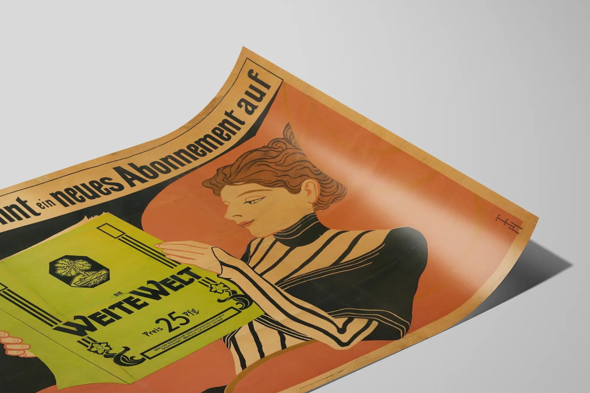 Denna vintageaffisch föreställer en grafisk och stiliserad scen av en kvinna som ligger och läser en stor tidskrift med titeln "Die Weite Welt". Illustrationen har en retroestetik med tydliga linjer, kontrasterande färger och en stark typografisk prägel, inskriven på tyska i den övre delen. Teckningen understryker vikten av läsning och information, genom att framhäva tidskriften med en ren design och varma nyanser, dominerande av en ljusgrön ton på omslaget. Denna vintageaffisch är ett originellt inslag för väggdekoration, som tillför en konstnärlig atmosfär från tiden, blandad med enkel och uttrycksfull elegans. Den riktar sig särskilt till entusiaster av retroaffischer och grafisk design från början av 1900-talet, och ger en känsla av äkthet och karaktär till ett vardagsrum, ett kontor eller ett bibliotek. Denna vintageaffisch uttrycker ett intresse för kultur och litteratur, genom att framhäva bokobjektet i en omsorgsfull komposition, och passar perfekt i en väggdekoration samling med historiska eller konstnärliga affischer. Den tyska typografin i fet stil på ljus bakgrund drar till sig uppmärksamhet och ger affischen ett utseende som är både informativt och dekorativt. Denna väggbild är idealisk för att tillföra en känsla av originalitet och retrocharm till dina inomhusmiljöer, genom att leka med nostalgi och ren grafik.