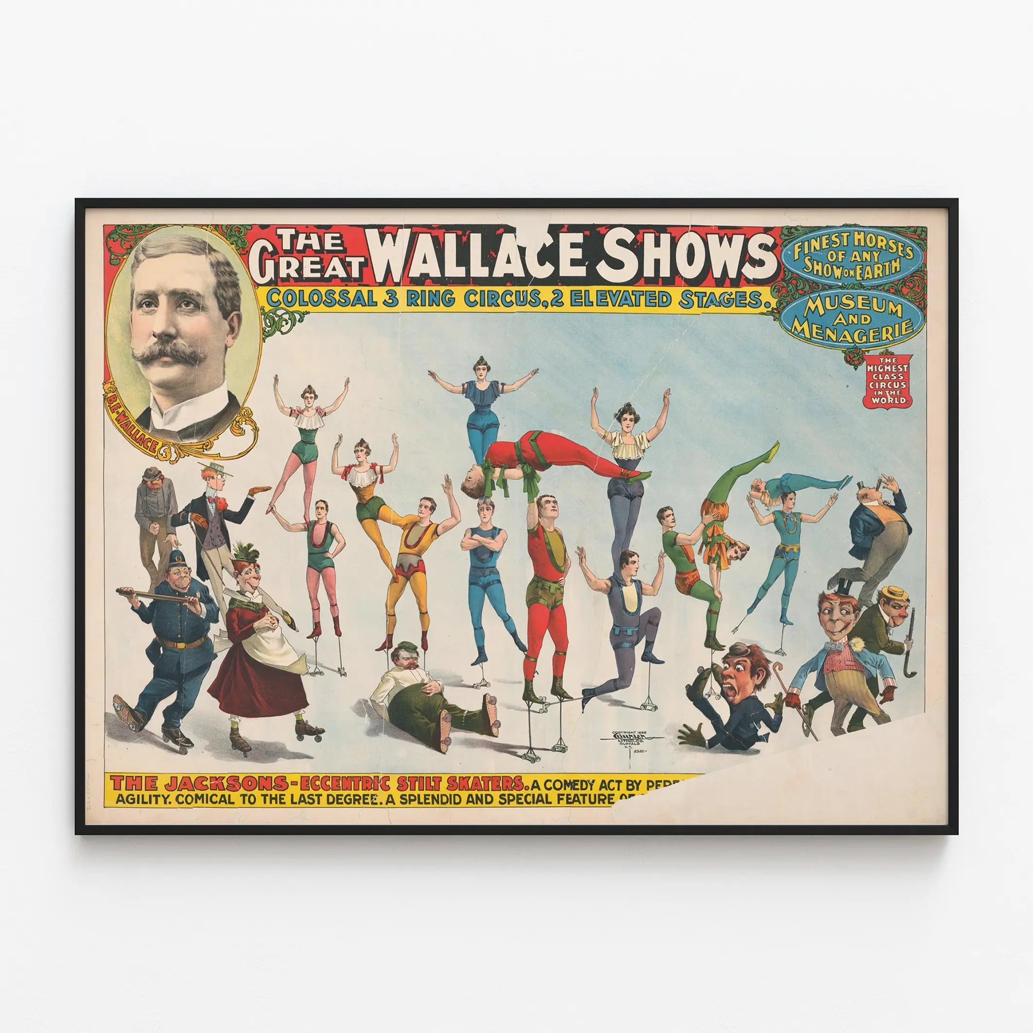Upptäck denna originella vintageaffisch som visar scenen från Great Wallace Shows, en kolossal cirkus med tre manegor och två upphöjda scener, som är emblematiskt för den tid då traditionell cirkus var som bäst. Denna unika väggdekoration illustrerar med glans Jacksons humoristiska och akrobatiska nummer, berömda för sina stiliserade trampolinskådare. Affischen visar figurer i färgglada kostymer, vissa av dem som akrobater i rörelse, andra som komiska karaktärer, vilket fångar den festliga och excentriska andan hos denna troupe. Den vita och gula texten i rubriken på en röd och blå bakgrund, samt de dekorativa ornamenten runt porträttet av B.E. Wallace, tillför en äkthetskänsla till detta gamla cirkusskylt. Denna väggmålning är perfekt för entusiaster av retroinredning, cirkhistoriaälskare eller för den som vill skapa en vintage och originell atmosfär i sitt hem. Med sin blandning av klara färger och noggranna detaljer representerar denna reklamaffisch ett sällsynt konstverk som speglar modet och fantasin i de kringresande föreställningarna från början av 1900-talet. Perfekt för ett vardagsrum, ett kontor eller ett lekrum, utmärker sig denna affisch genom sin berättande karaktär och sin förmåga att fånga ett viktigt ögonblick i populärkulturen. Skäm bort dig själv med detta tidlösa väggdekoration, rikt på detaljer och karaktär, som lovar att liva upp dina väggar och väcka nyfikenhet hos dina besökare.