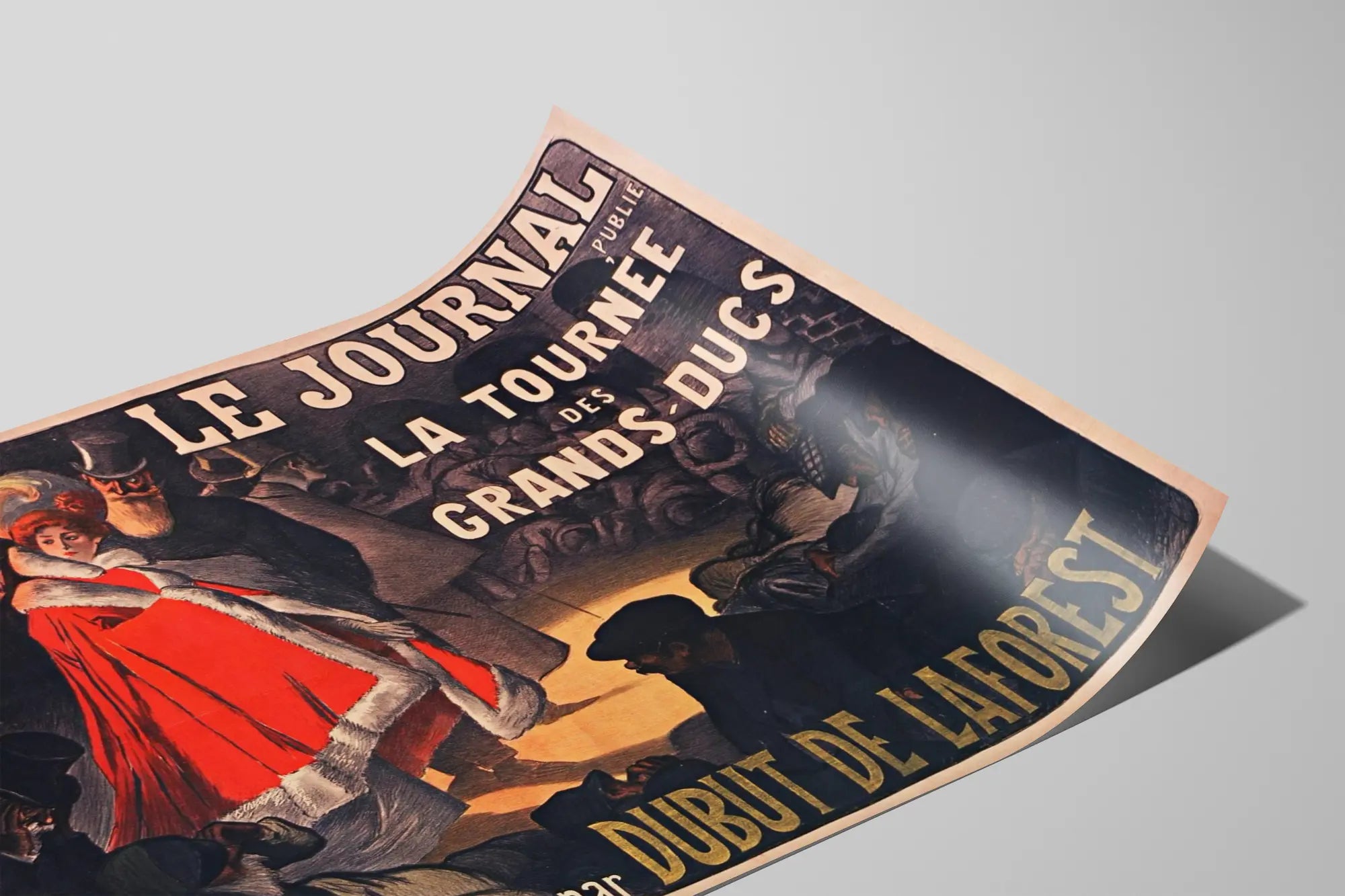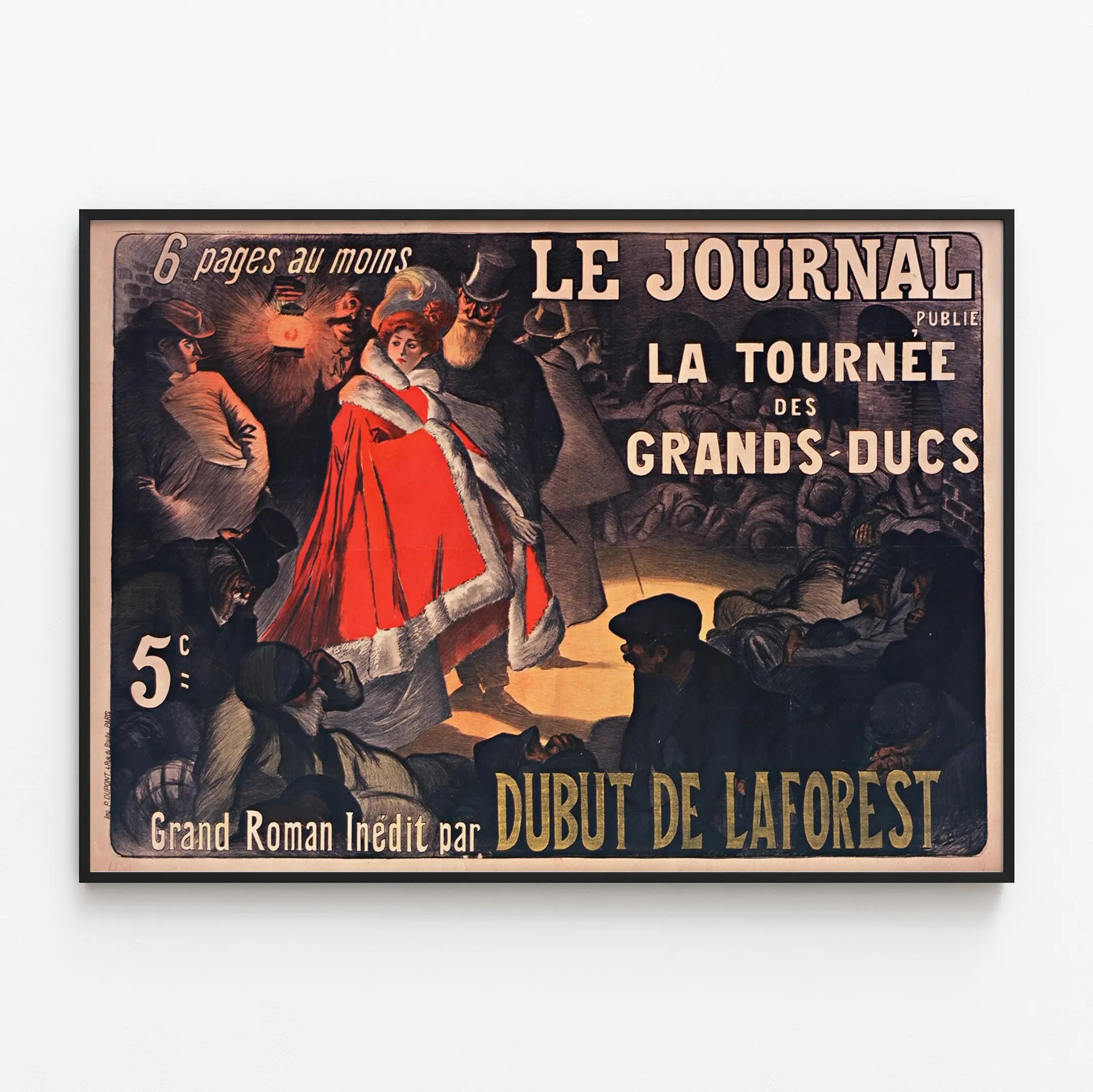 Upptäck denna vintageaffisch med titeln « Le Journal publie La Tournée des Grands Ducs », ett slående exempel på retro väggdekoration inspirerad av gamla tidningsomslag. Tryckt i varma, kontrasterande färger, föreställer denna affisch en elegant kvinna i en röd pälskantad kappa, omgiven av män med förundrade blickar, allt badande i en nattlig atmosfär upplyst av en lampa. Denna poster annonserar en stor, opublicerad roman av Dubut de Laforest, vilket ger en äkta och historisk prägel till ditt hem. Perfekt för en gammaldags väggdekoration eller för entusiaster av litteratur och tidsenliga reklamaffischer, denna unika detaljrikedom och unika stämning gör den till ett fängslande inslag. Oavsett om det är för ett vardagsrum, ett kontor eller ett bibliotek, utstrålar detta konstverk en charm från förr som berikar ditt boende. Välj denna poster för att tillföra en vintage- och kulturkänsla till din väggdekoration samtidigt som du lyfter fram ett typiskt franskt konstarv.