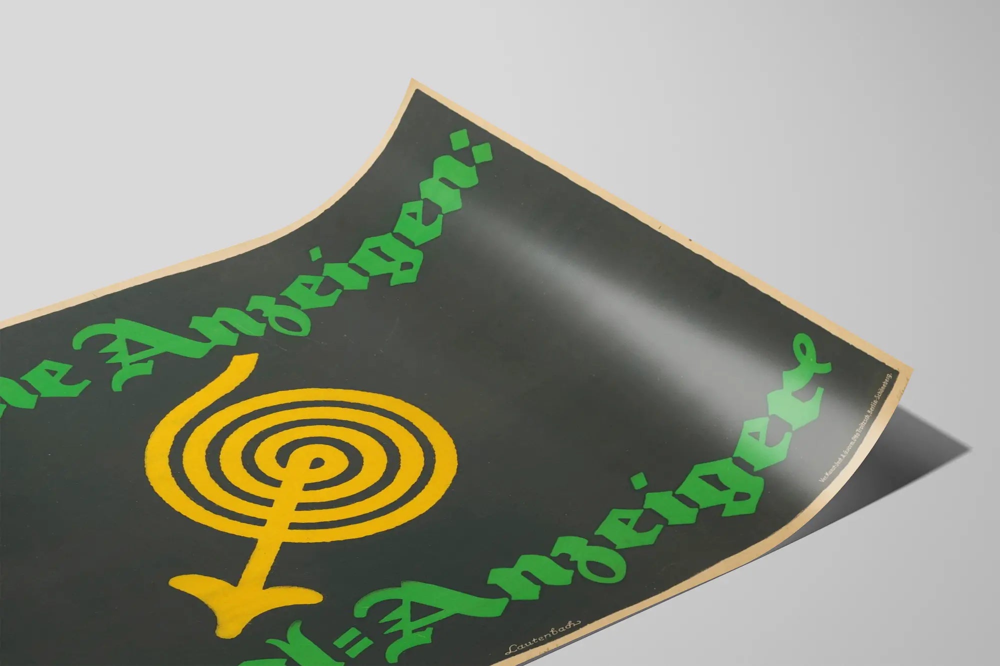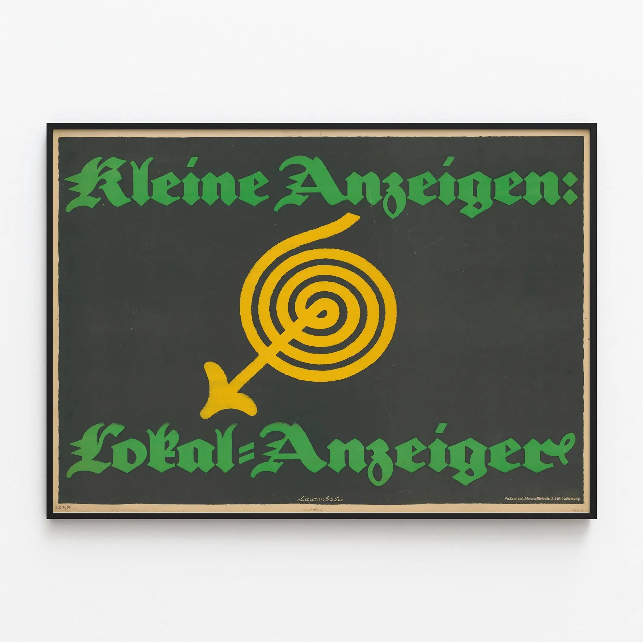 Denna vintageaffisch Kleine Anzeigen Lokal-Anzeiger är ett utmärkt val för en väggdekoration i retro- och grafisk stil. Med sin djupa svarta bakgrund framhäver den ett förenklat centralt motiv: en gul pil som snurrar i spiral, ett starkt och slående visuellt symbol. Texten i stora gröna gotiska bokstäver "Kleine Anzeigen:" upptill och "Lokal-Anzeiger" längst ner ger en anmärkningsvärt kontrast mot den mörka bakgrunden, vilket förstärker den traditionella och gamla känslan av denna affisch.