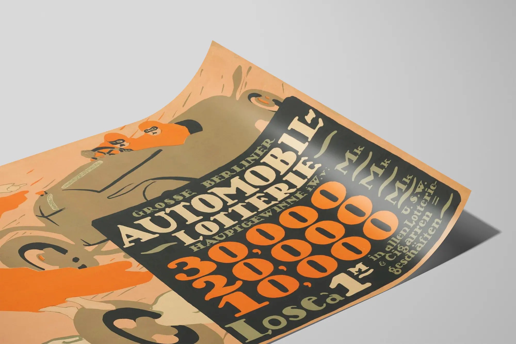 Denna vintageaffisch föreställer en reklam för ett berliniskt billotteri, kännetecknat av en ren grafisk stil och dominerande färger i orange och ljusgrått. Illustrationen visar en stiliserad racingbil, tillsammans med två förare i orange dräkter och svarta glasögon, vilket understryker den dynamiska och sportiga känslan. Till höger finns en svart skylt med nyckelinformation om lotteriet i vita bokstäver, med orange siffror som markerar de stora prissummorna: 30 000, 20 000 och 10 000 mark. Texten, på tyska, anger också att biljetterna säljs för 1 mark i olika lotteri- och cigarrbutiker. Denna affisch är ett utmärkt väggdekoration för vintageälskare, bilhistoria och retrografik. Den kan användas som affisch eller dekorativ tavla, och tillför en originell och nostalgisk touch till alla inomhusmiljöer, oavsett om det är ett vardagsrum, ett kontor eller ett fritidsrum. Affischen utmärker sig genom sin balans mellan illustration och typografi, en hyllning till reklamaffischer från början av 1900-talet. Dess enkla men slagkraftiga grafiska uttryck lyfter fram både det erbjudna produkten – billotteriet – och universumet av gamla bilrace. Den passar perfekt till väggdekorationer som kombinerar retrocharm med tidlösa element. Denna vintageaffisch blir därmed en nyckelkomponent för att skapa en unik och karaktärsfull atmosfär kring ett bil- eller samlartema. Oavsett om det gäller att berika en konstsamling eller att dekorera ett vardagsutrymme, ger denna affisch väggdekorationen ett estetiskt och historiskt värde, värt de gamla berliniska reklambroschyrerna.