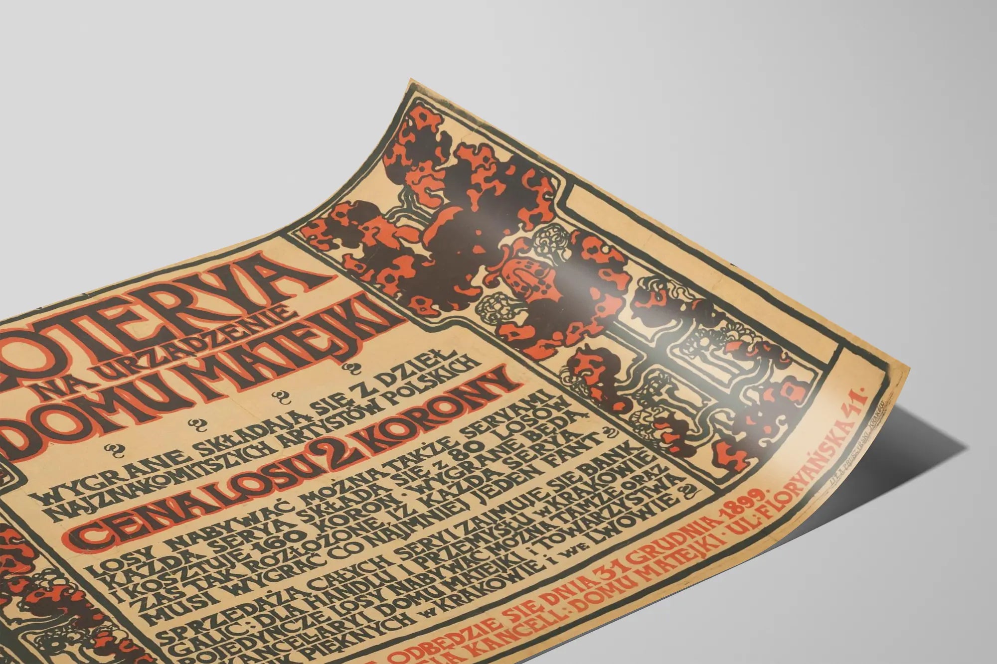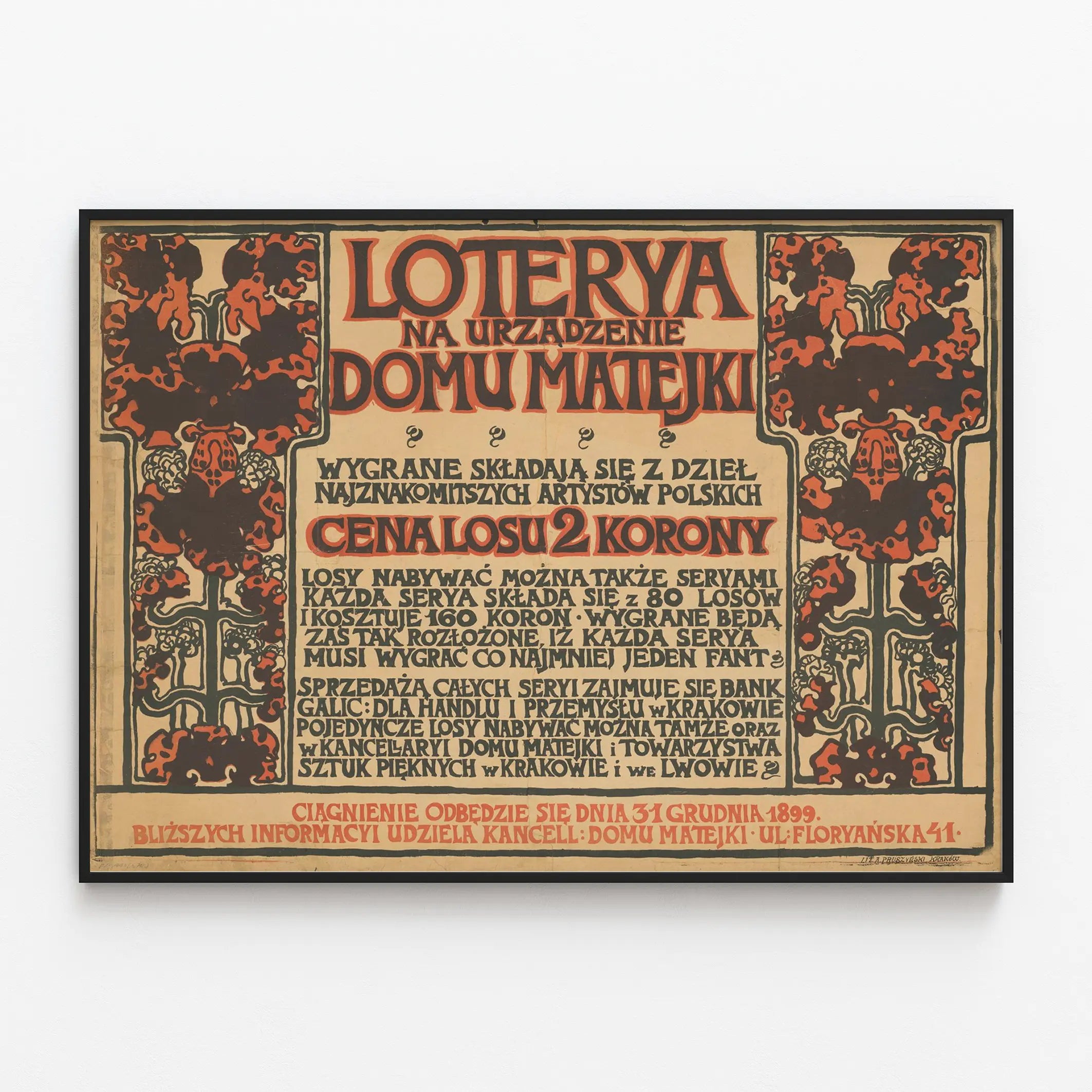 Denna vintageaffisch är ett unikt väggdekorationstycke som utstrålar en mycket tydlig konstnärlig och historisk stil. Den heter « Loterya na urzadzenie domu Matejki » och återger en grafisk design i varma nyanser dominerade av beige, rött och svart, inramad av stiliserade blomstermotiv som påminner om jugendstilen. Denna gamla affisch väcker minnen av en lotteriorganisation i Polen, avsedd för finansiering och inredning av huset Matejki. Texten på polska, i originaltypsnitt och kraftfullt framhävd, innehåller detaljer om lotteriet, såsom biljettpriset, serieindelningen och försäljningsplatserna, vilket ger en värdefull inblick i kultur och visuell kommunikation från denna tid.