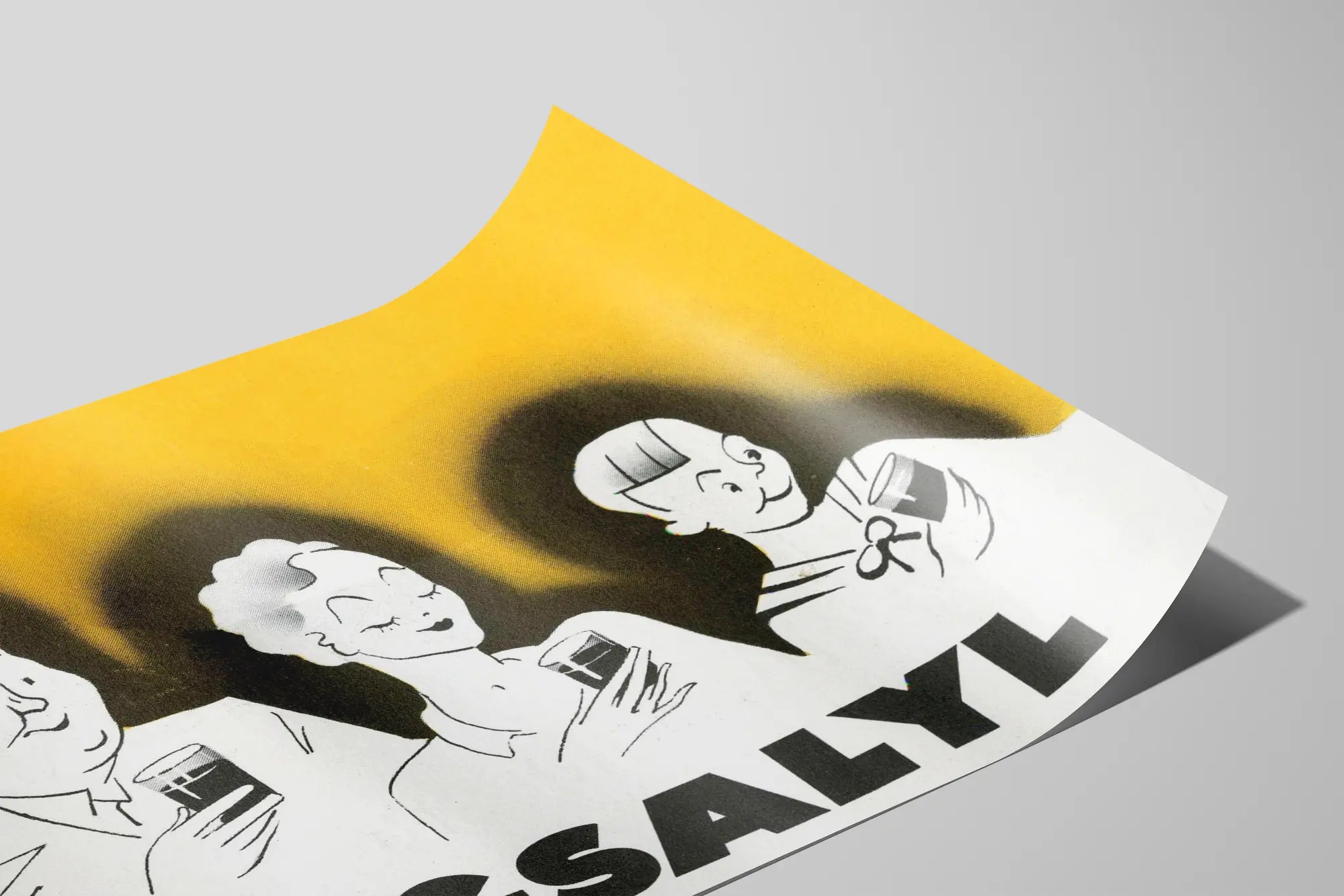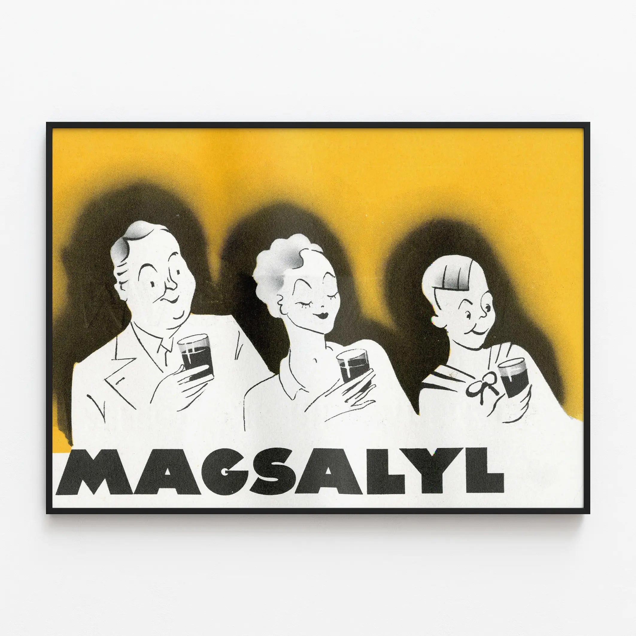 Den här vintageaffischen MAGSALYL är ett perfekt exempel på retro väggdekoration, som tillför en nostalgisk och varm känsla till ditt hem. Föreställande tre leende personer som var och en håller ett glas, skiljer sig denna svartvita illustration mot en ljusgul bakgrund och skapar en slående visuell kontrast som naturligt drar till sig uppmärksamheten. Den grafiska stilen påminner om reklamaffischer från mitten av 1900-talet, med en enkel men uttrycksfull teckning och en effektiv komposition, vilket är karakteristiskt för kampanjer från den tiden.