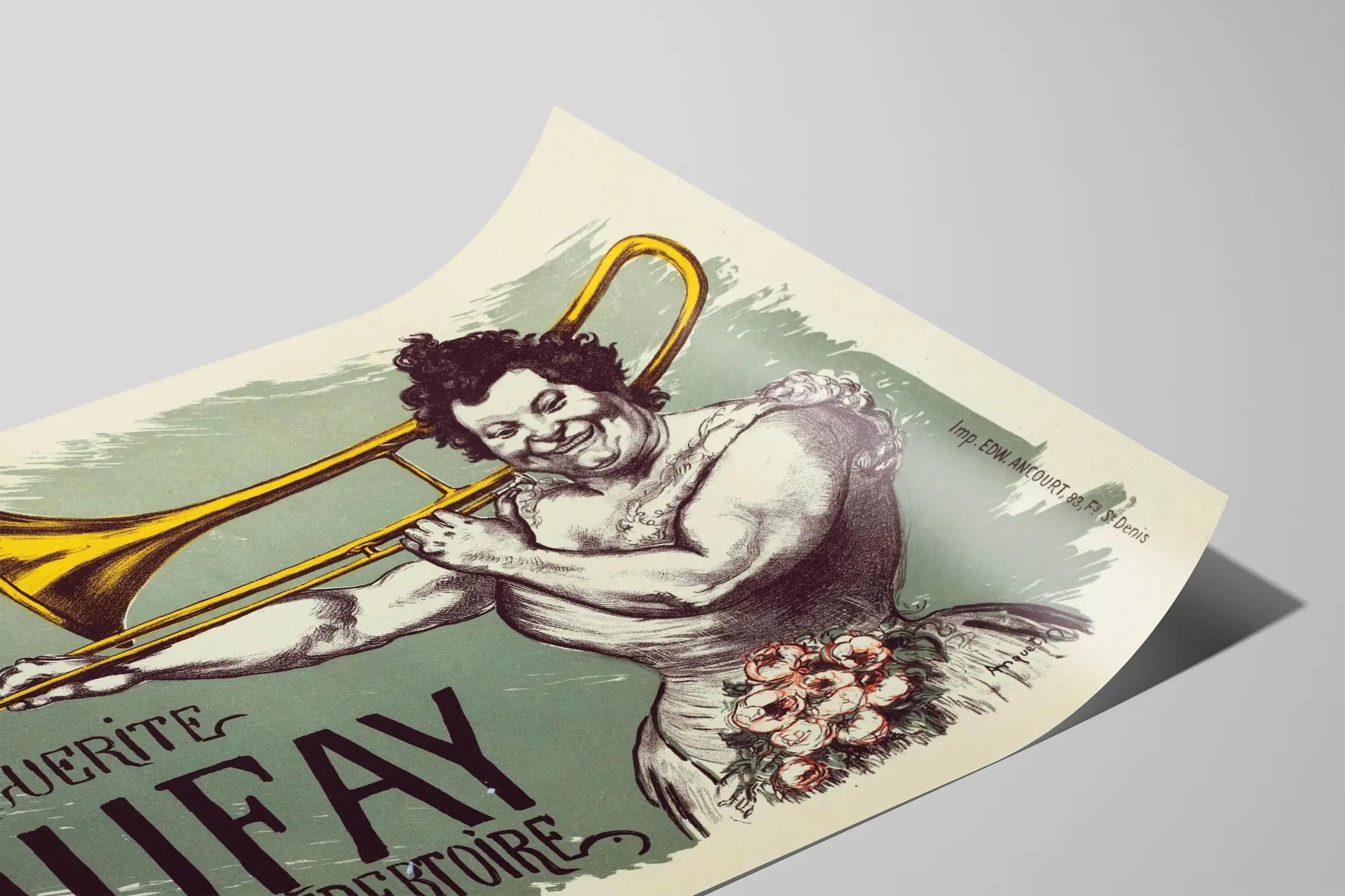 Vintageposter med Marguerite Dufay och dekorativt trombon