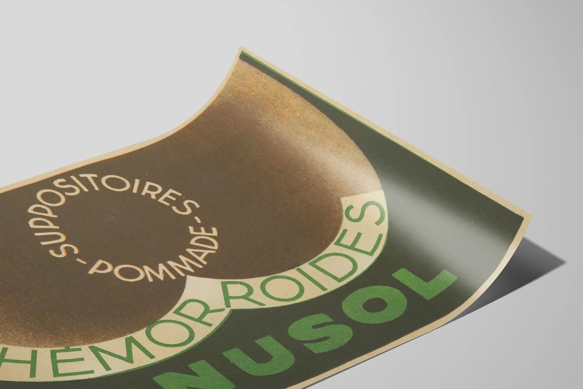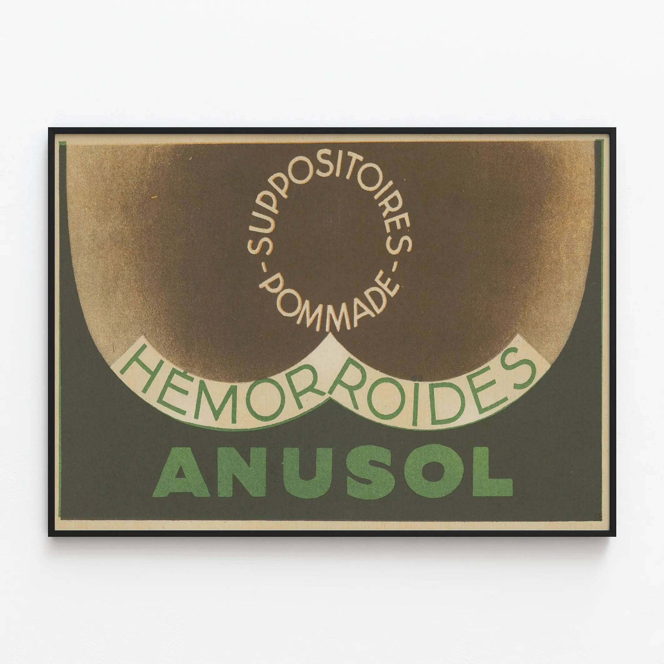 Den vintage reklamaaffischen Anusol är ett unikt väggdekorationselement med en slående grafisk och typografisk design. Den framhäver på ett djärvt och humoristiskt sätt en vårdprodukt som påstås vara avsedd för behandling av hemorrojder, illustrerad med en abstrakt bild som antyder det berörda kroppsområdet. Den cirkulära texten "SUPPOSITORIER - POMMADE" betonar den medicinska karaktären av föremålet, medan orden "HÄMORROJDER" och "ANUSOL" dominerar kompositionen i gröna bokstäver på mörk bakgrund.