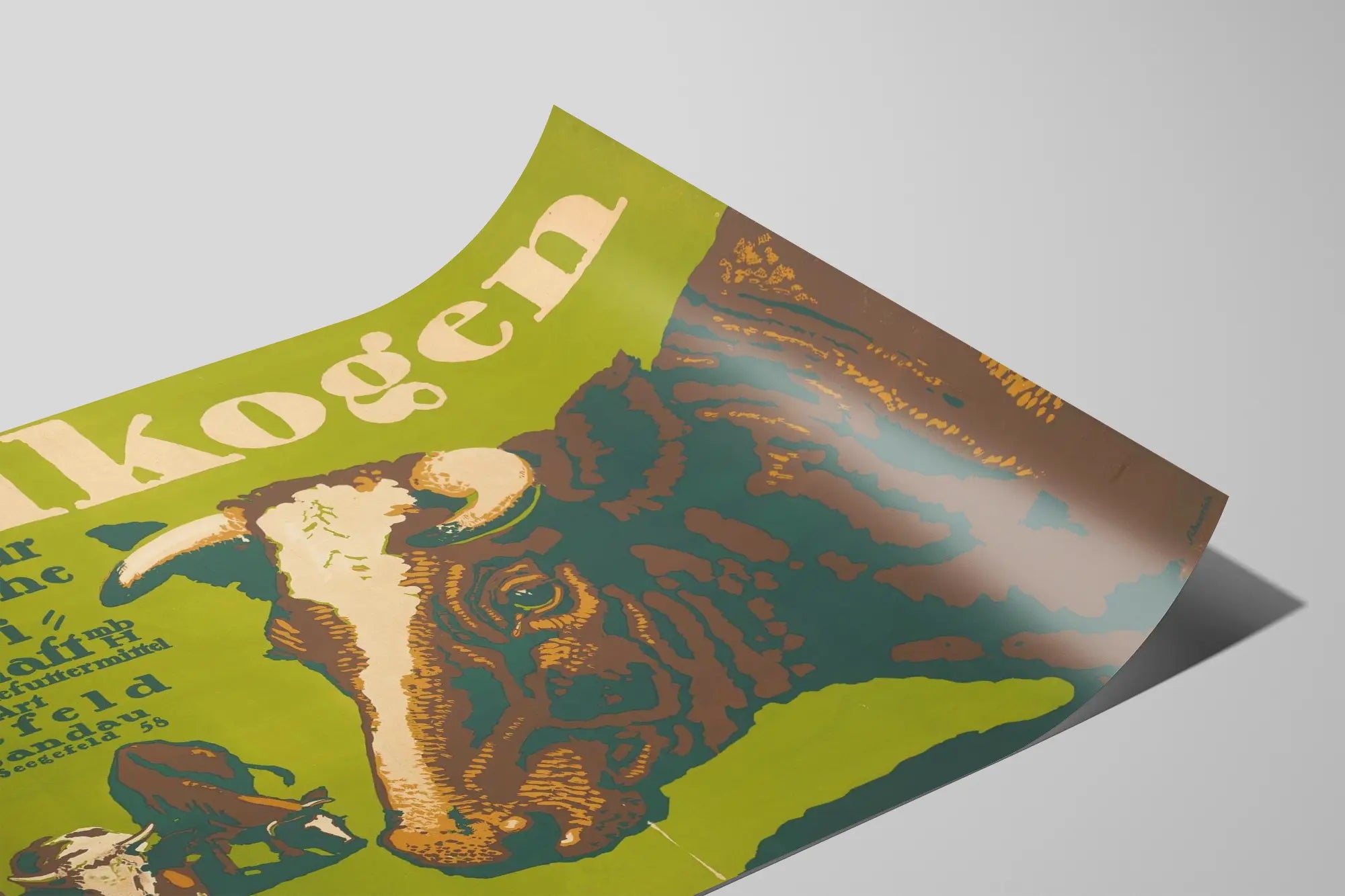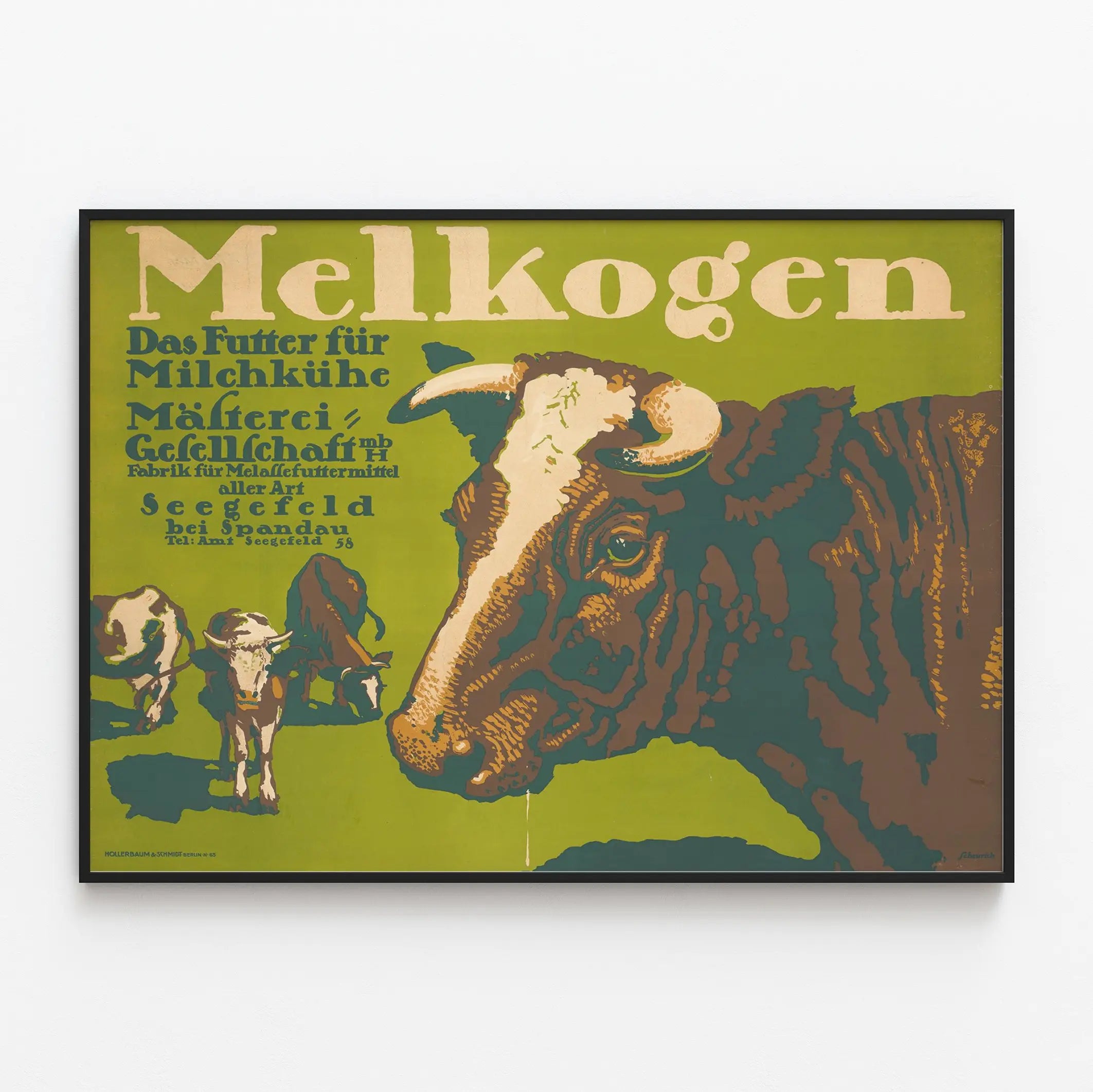 Texten på affischen, på tyska, anger att Melkogen är ett varumärke som ägnar sig åt "foder för mjölkkor", vilket understryker den ursprungliga funktionella och praktiska aspekten av denna affisch. Verket framkallar en äkta lantlig värld och passar utmärkt som en tematisk eller vintage väggdekoration.