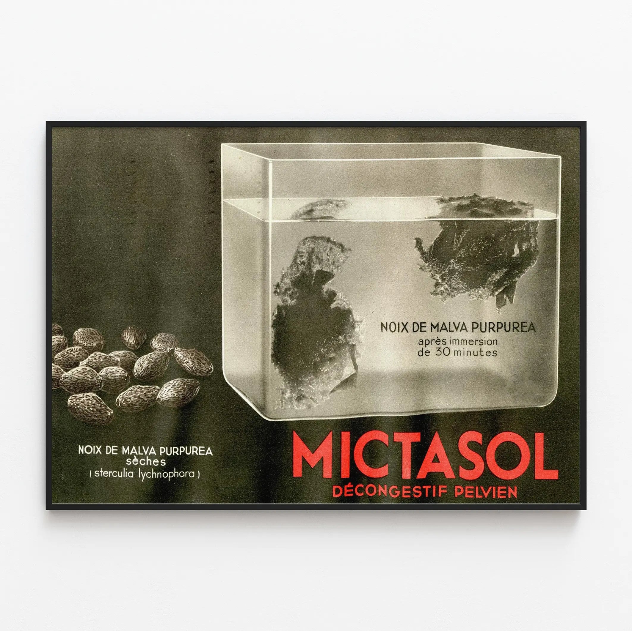 Den vintageaffisch med titeln "Mictasol" illustrerar en vetenskaplig upptäckt med en unik retrostil. Den visar en svartvit bild av en fördjupningsexperiment med purpurmalva-nötter, även kallade Sterculia lychnophora, i en vätska under 30 minuter. Bilden kontrasterar de torra nötterna mot de nedsänkta i en genomskinlig behållare fylld med vätska, och framhäver ett medicinskt koncept kopplat till bäckenavsvällning. Denna väggdekoration ger en originell och äkta atmosfär, perfekt för entusiaster av retro grafisk konst eller historisk vetenskapsbild. Som dekorativ affisch kombinerar den estetik med ett medicinskt tema, och tillför en touch av utbildning och nyfikenhet till ditt hem. Den är idealisk för en unik väggdekoration i ett kontor, väntrum eller vardagsrum, särskilt för dem som söker en tavla med en vetenskaplig och vintage atmosfär. Tack vare sitt enkla och kontrasterande grafiska uttryck passar denna bild lika bra i en modern ram som i ett industriellt eller minimalistiskt inredningsstil. Mictasol-affischen är ett originellt val för att berika en vägg med ett dekorativt verk som väcker tankar och inbjuder till reflektion kring vetenskap och natur. Sammanfattningsvis blandar denna vintageaffisch botanisk kunskap med en estetisk atmosfär, och gör din väggdekoration till en ovanlig och elegant punkt av intresse.