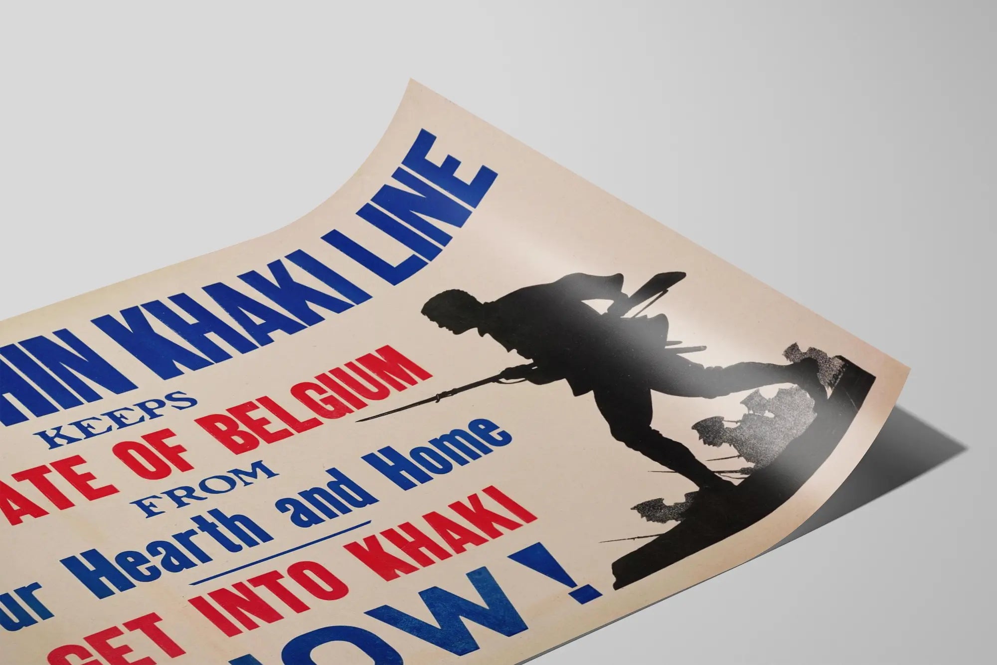 Dekorera dina väggar med denna slående vintageaffisch med titeln "The Thin Khaki Line". Denna militärstilposter framhäver ett starkt budskap om rekrytering, med text i blå och röda versaler som omedelbart fångar uppmärksamheten. Den grafiska sammansättningen kombinerar text och en svart siluett av en beväpnad soldat, vilket ger ett intryck av dynamik och brådska. Denna väggdekoration väcker en känsla av mod och försvar, perfekt för ett retro- eller historiskt inrett rum.