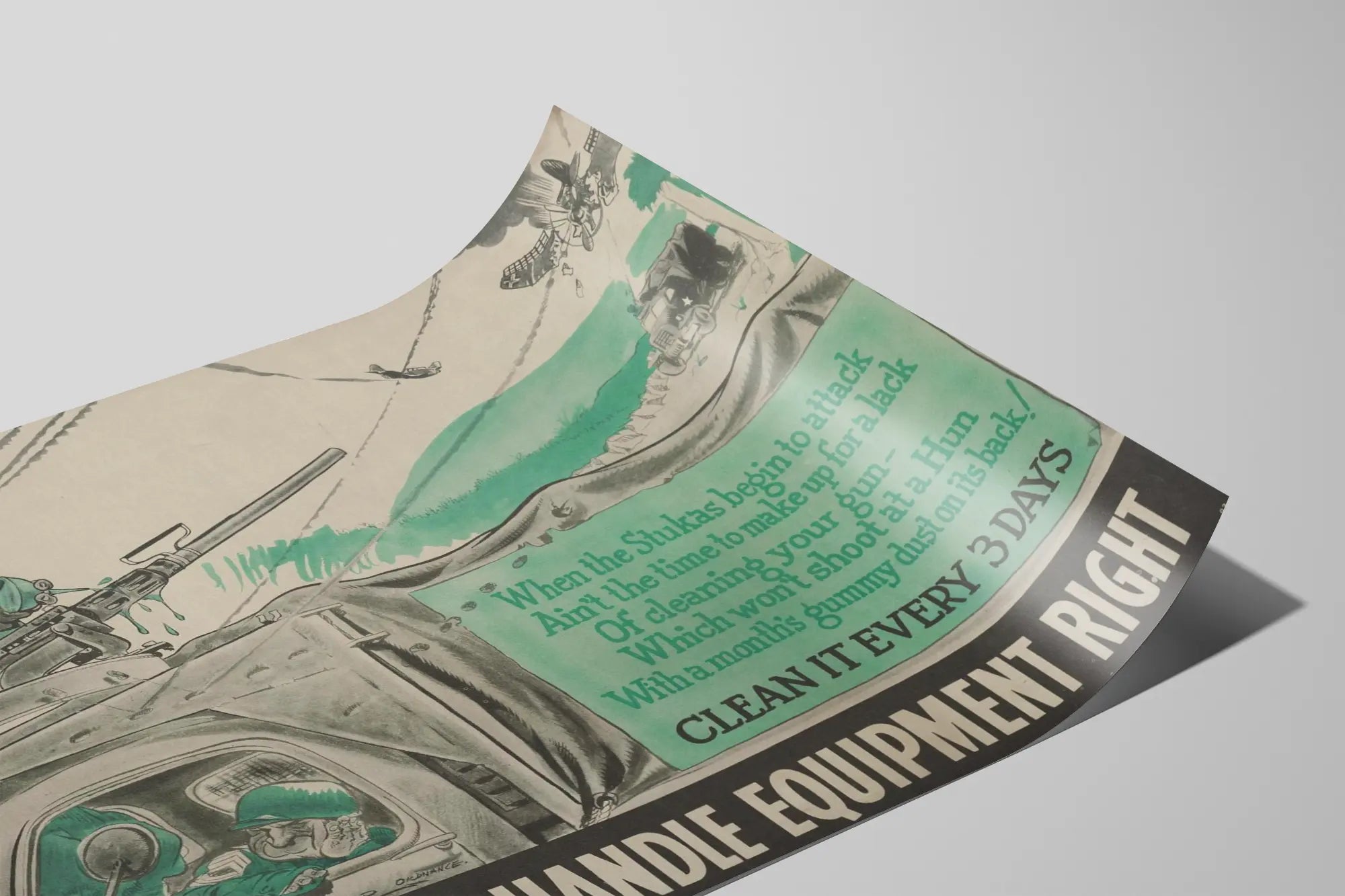 Den här vintage militäraffischen är ett perfekt inslag för att berika din väggdekoration med en historisk och lärorik touch. Plakaten föreställer en humoristisk och informativ scen där en soldat är beväpnad med ett maskingevär på ett militärfordon, medan en annan vilar i lastbilens hytt. Den dominerande färgen är nyanser av grått och grönt, vilket förstärker den retro och militära stilen.