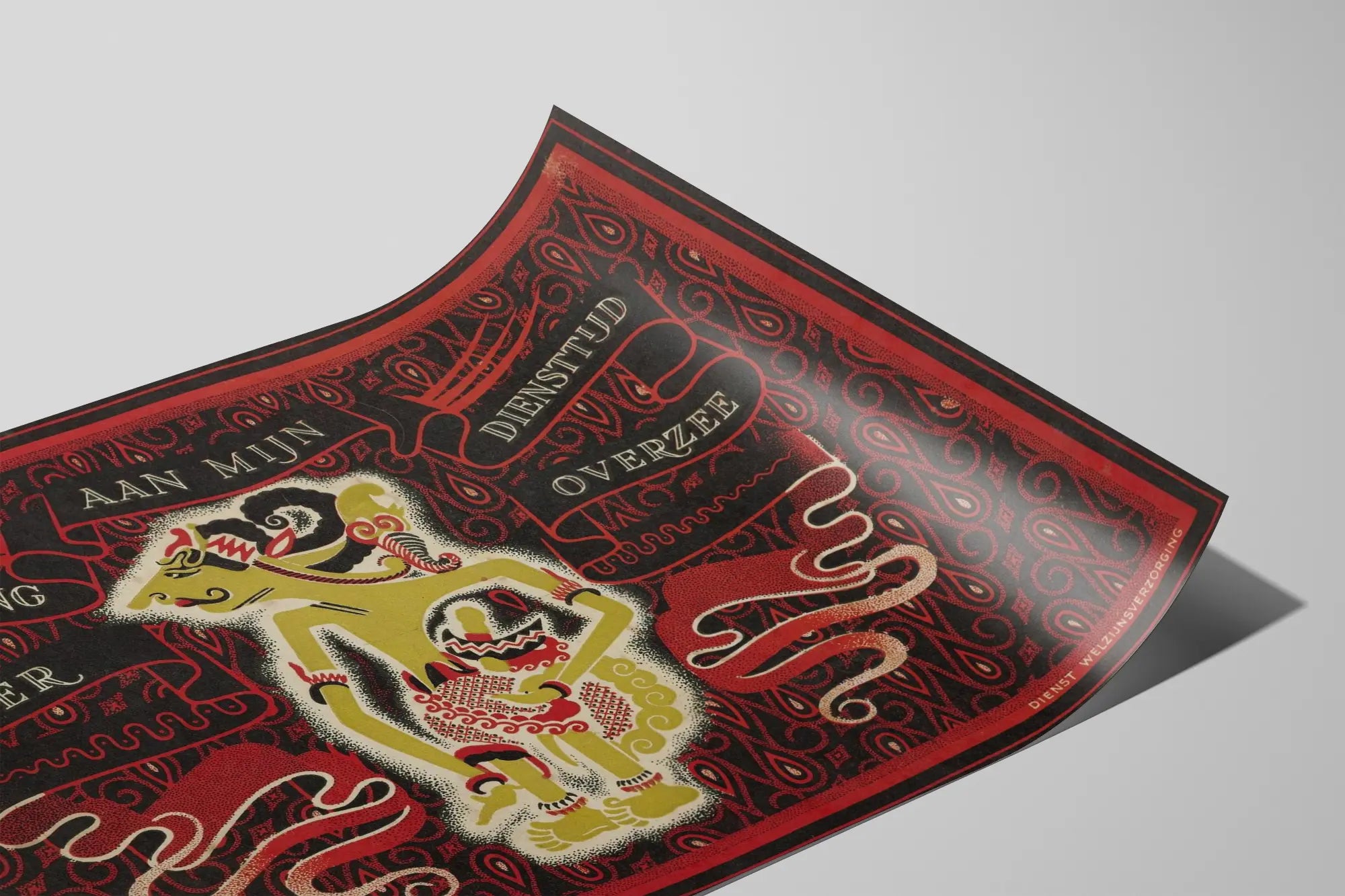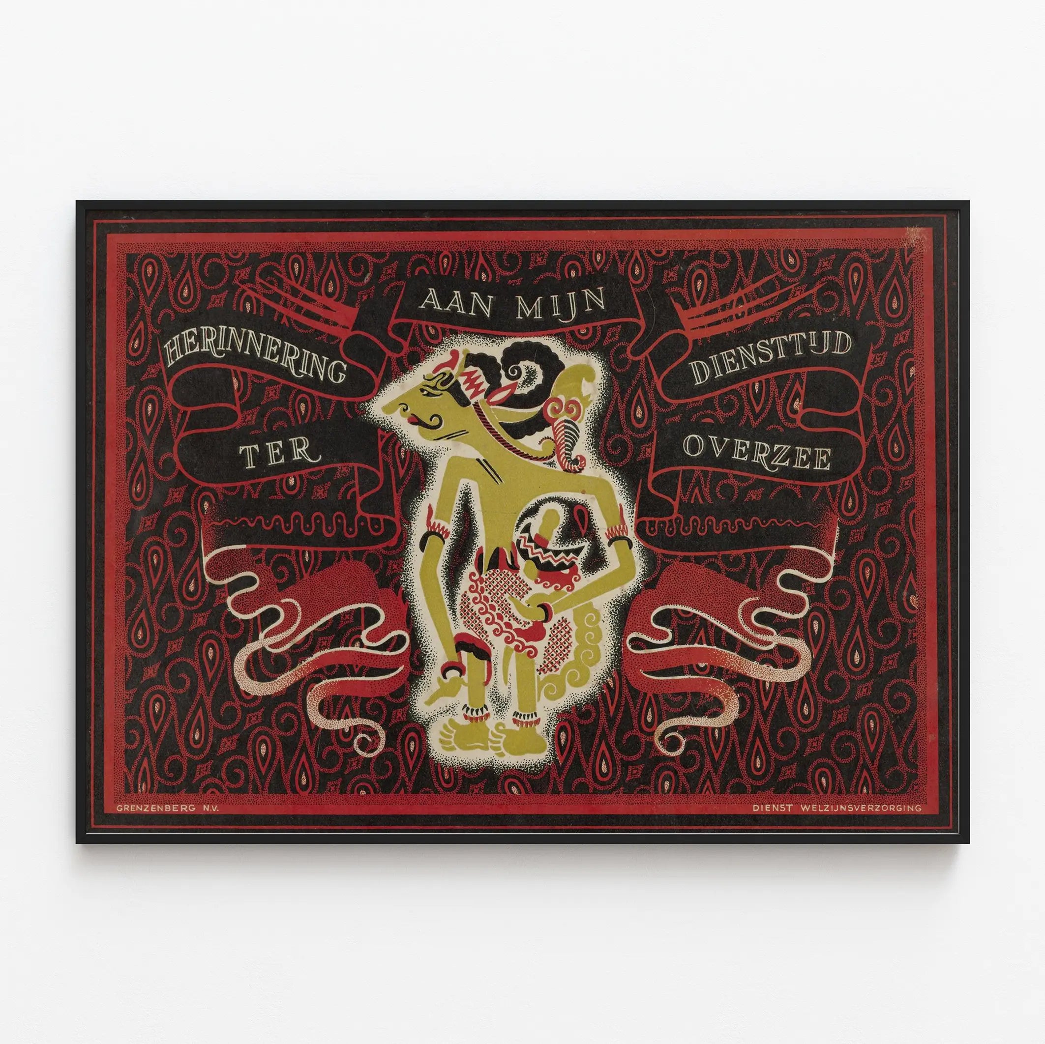 Denna vintageaffisch utgör en originell väggdekoration som förenar grafisk konst med ett personligt minne. Den bär inskriptionen på nederländska „Herinnering aan mijn diensttijd overzee”, vilket betyder „Minne av min tjänst utomlands”. Denna poster i röda, svarta, beige och med några vita inslag visar en stiliserad figur i en grafisk stil som påminner om traditionell eller folklig konst, omgiven av komplexa ornamentala mönster. Dessa mönster, utförda i en varm och kontrasterande färgpalett, skapar en rik och dynamisk ram som naturligt drar till sig blickar.