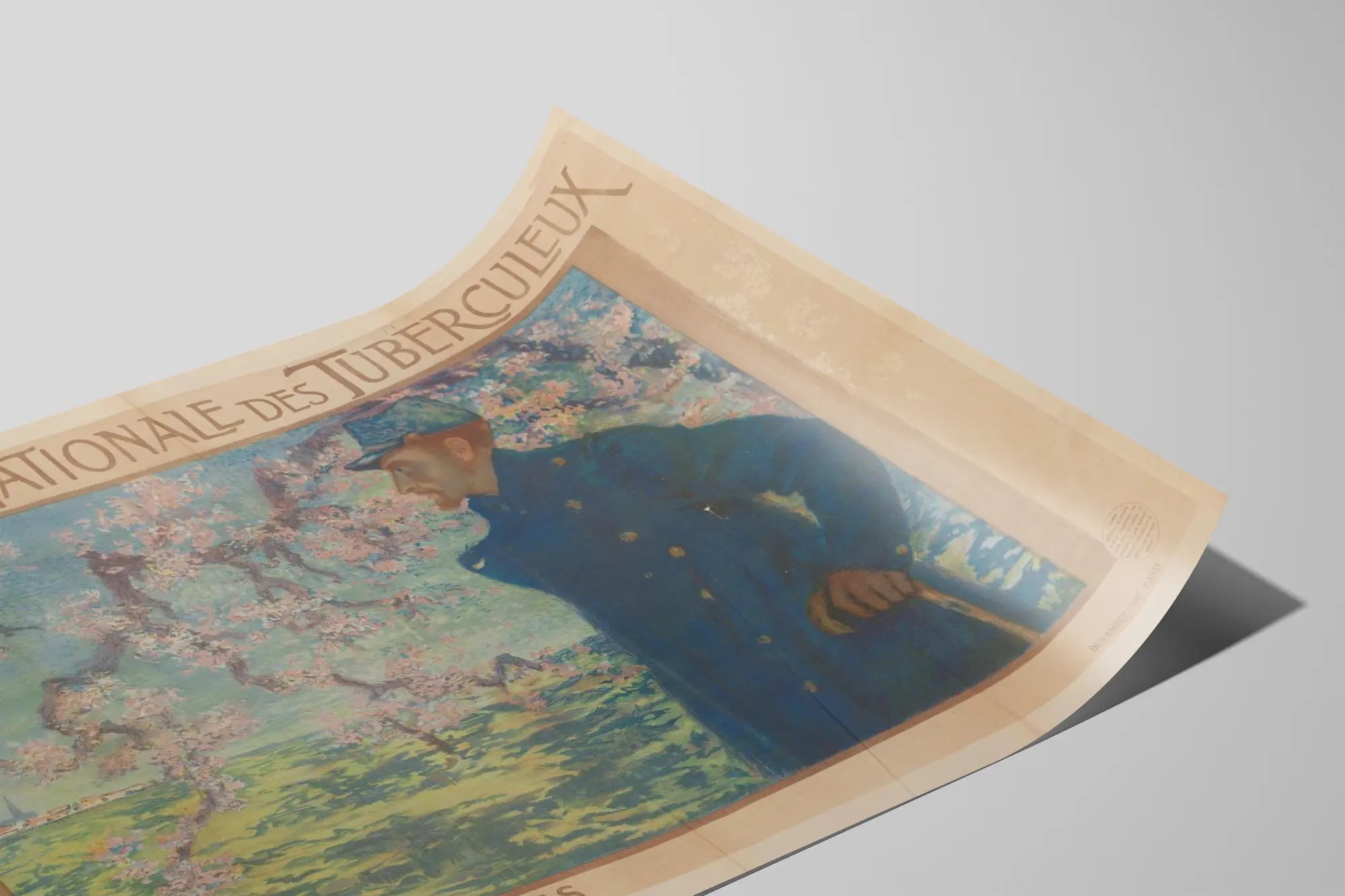 Upptäck denna gamla och sällsynta affisch med titeln "Nationella dagen för tidigare tuberkulösa militärer", ett unikt väggdekorationselement som tillför en touch av historia och minne till ditt hem. Denna affisch föreställer en före detta militär, avbildad utomhus under ett blommande träd, en symbol för förnyelse och hopp. Figuren är klädd i en mörkblå militärrock och håller en käpp, vilket understryker hans status och tidigare strider. Bakgrunden domineras av ett ljust landskap med fält, med inslag av grönt och rosa, vilket skapar en lugn och nostalgisk atmosfär i detta grafiska verk.
