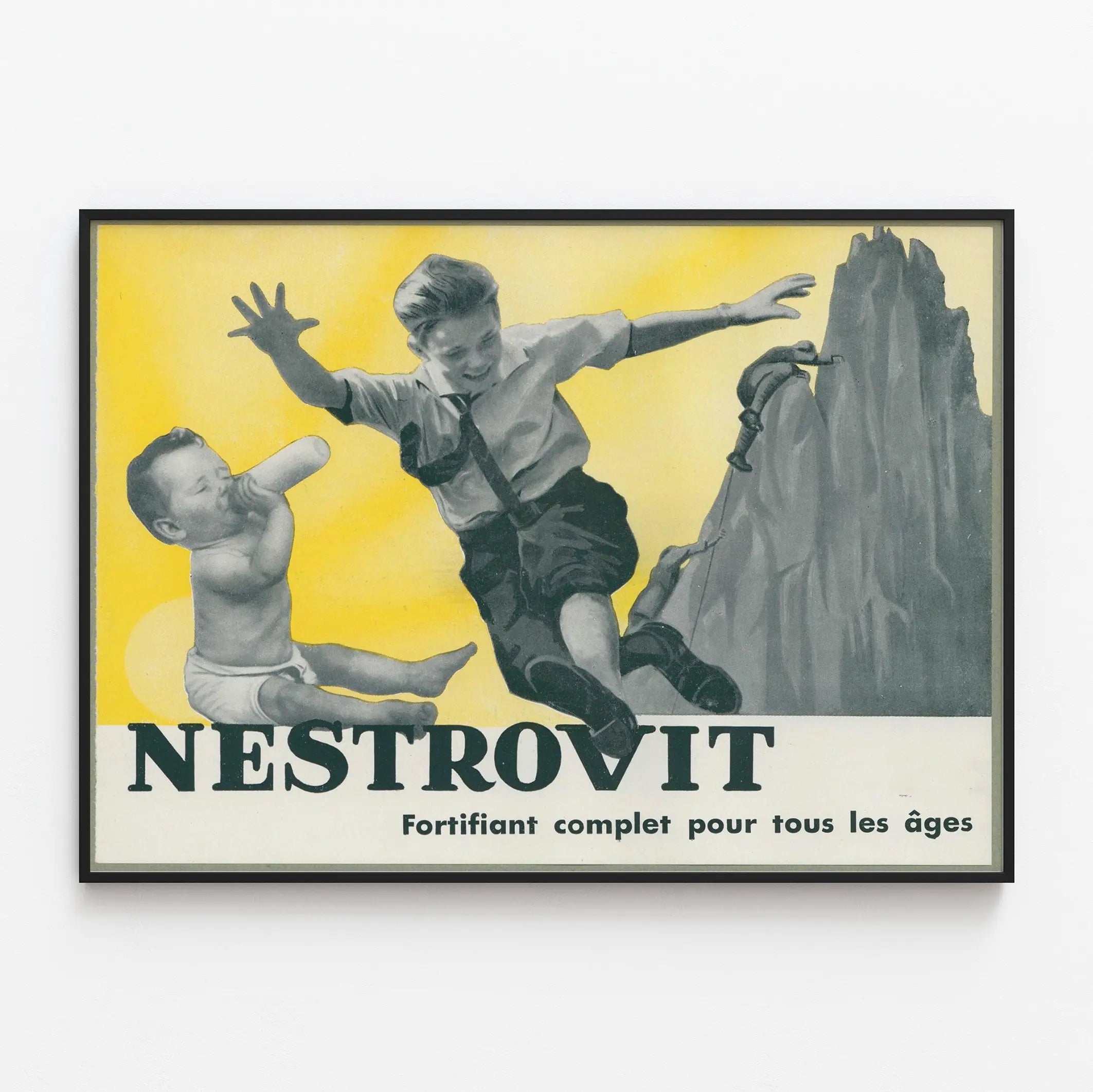 Den här vintageaffischen Nestrovit är ett unikt väggdekorationselement som tillför en retro och nostalgisk känsla till vilket som helst inomhusrum. Den visar ett barn stående i skjorta och slips som glatt hoppar, tillsammans med en bebis som dricker ur nappflaska, mot en ljusgul bakgrund som väcker vitalitet och energi. I bakgrunden klättrar bergsbor uppför en klippvägg, vilket symboliserar styrka och beslutsamhet och förstärker produktens budskap: ett komplett stärkande medel för alla åldrar. Denna originella reklamposter passar perfekt för att dekorera gemytliga rum som vardagsrum, kök eller kontor, och tillför en charm från förr. Tillverkad av material anpassade för konsttryck, är den idealisk för entusiaster av vintage väggdekoration som vill berika sin samling med en bild som är både dynamisk och estetisk. Kontrasten mellan de svartvita figurerna och den gula bakgrunden gör detta konsttryck attraktivt och lätt att integrera i olika inredningsstilar, från klassiskt till mer modernt. Oavsett om du är passionerad för gamla reklamposters eller bara söker en originell väggdekoration, utgör detta Nestrovit-konsttryck en inbjudan till upptäcktsfärd och att skildra hälsa och styrka genom en enkel och rörande bild. Ge dina väggar en touch av dynamik och historia med detta nostalgiska konsttryck som tilltalar både vuxna och yngre.