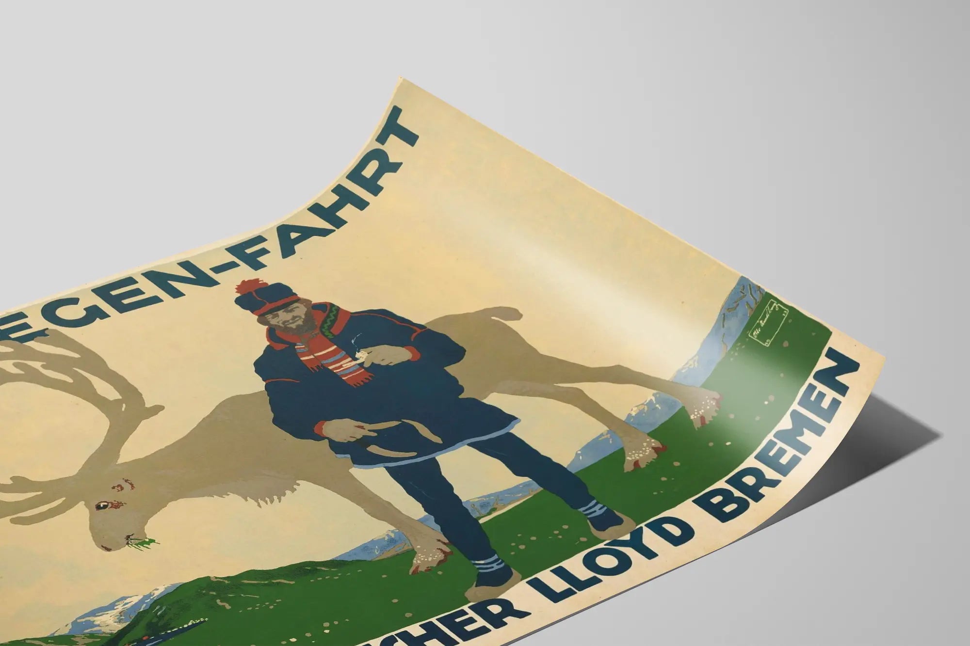 Denna vintageaffisch med titeln "Norwegen-Fahrt Norddeutscher Lloyd Bremen" är en väggdekoration som inbjuder till resa mot Norge, utförd i en grafisk och minimalistisk stil. Den visar en man klädd i en traditionell nordisk dräkt, tillsammans med en ren, mot en bakgrund av bergslandskap med snötäckta toppar och grön vegetation. De dominerande färgerna är mjuka och naturliga, främst nyanser av blått, grönt, beige och brunt. Texten upptill och nertill på affischen annonserar destinationen « Norwegen-Fahrt » (resa till Norge) och företaget Norddeutscher Lloyd Bremen, känt för sina kryssningar och sjöresor. Denna affisch skildrar med äkthet en historisk period kopplad till nordiska havsresor och kan tillföra en retro och kulturell prägel till ett rum. Denna väggdekoration utmärker sig genom sin enkla men suggestiva design, som kombinerar ett mänskligt och naturligt uttryck som tilltalar fans av vintageaffischer och grafisk konst. Den passar perfekt i ett industriellt, skandinaviskt eller klassiskt inrett hem, samtidigt som den ger en exotisk och äventyrlig marina känsla. Idealiskt för att pryda en vägg med ett konstverk som kombinerar historia, nordisk kultur och vintage design, är denna affisch ett originellt dekorativt val med mycket karaktär.
