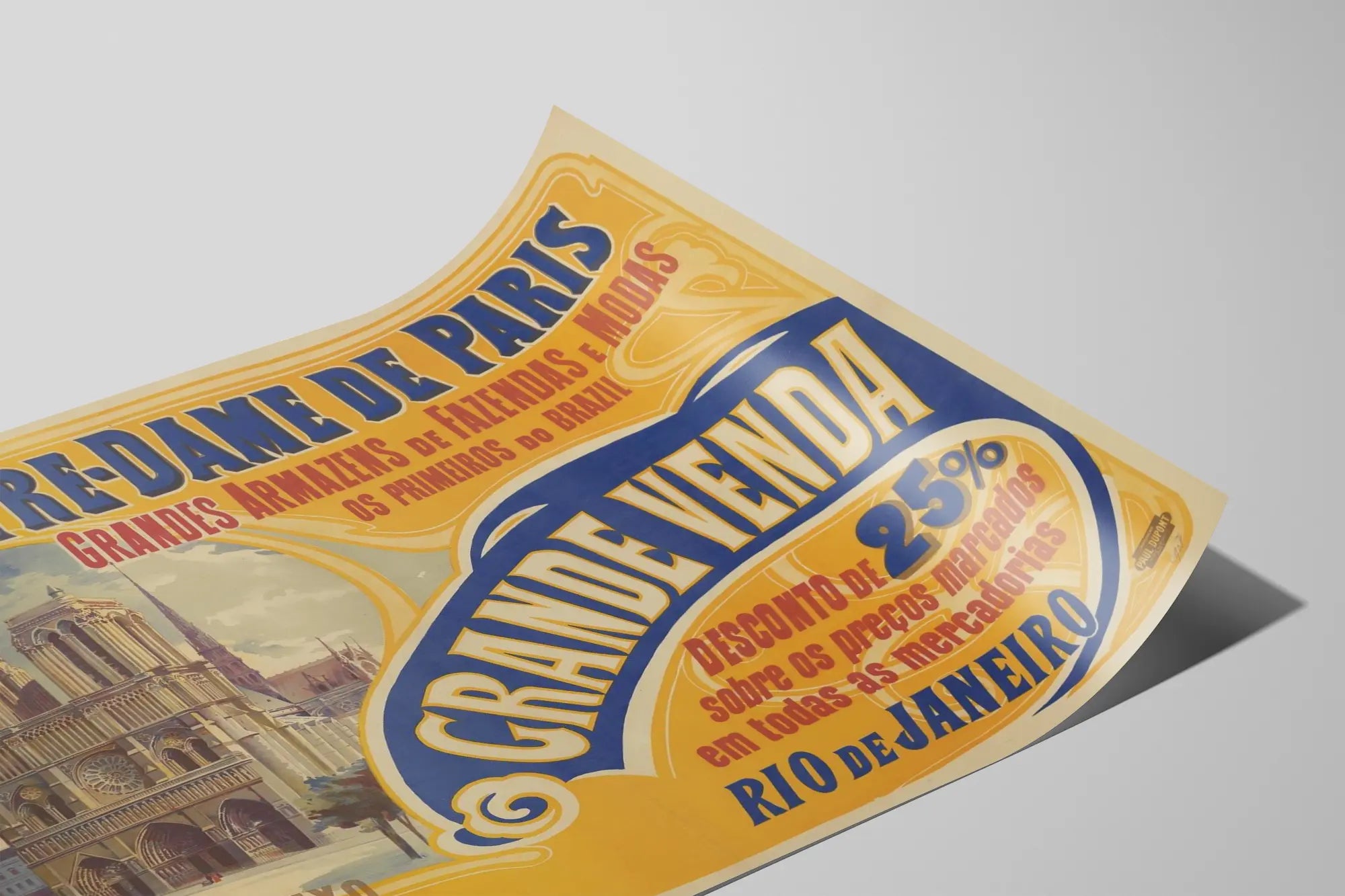 Denna vintageaffisch föreställer den berömda katedralen Notre-Dame i Paris, inramad av en rik dekoration i varma orange- och blå nyanser. Designen har en gammaldags och konstnärlig stil, typisk för illustrerade annonser från början av 1900-talet. Här upptäcker man en kampanj för "Grandes Armazens de Fazendas e Modas", som beskrivs som de första varuhusen i Brasilien, belägna i Rio de Janeiro. Den portugisiska texten lyfter fram en "Stor Försäljning" med 25 % rabatt på alla varor, vilket understryker ett större handelsarrangemang.