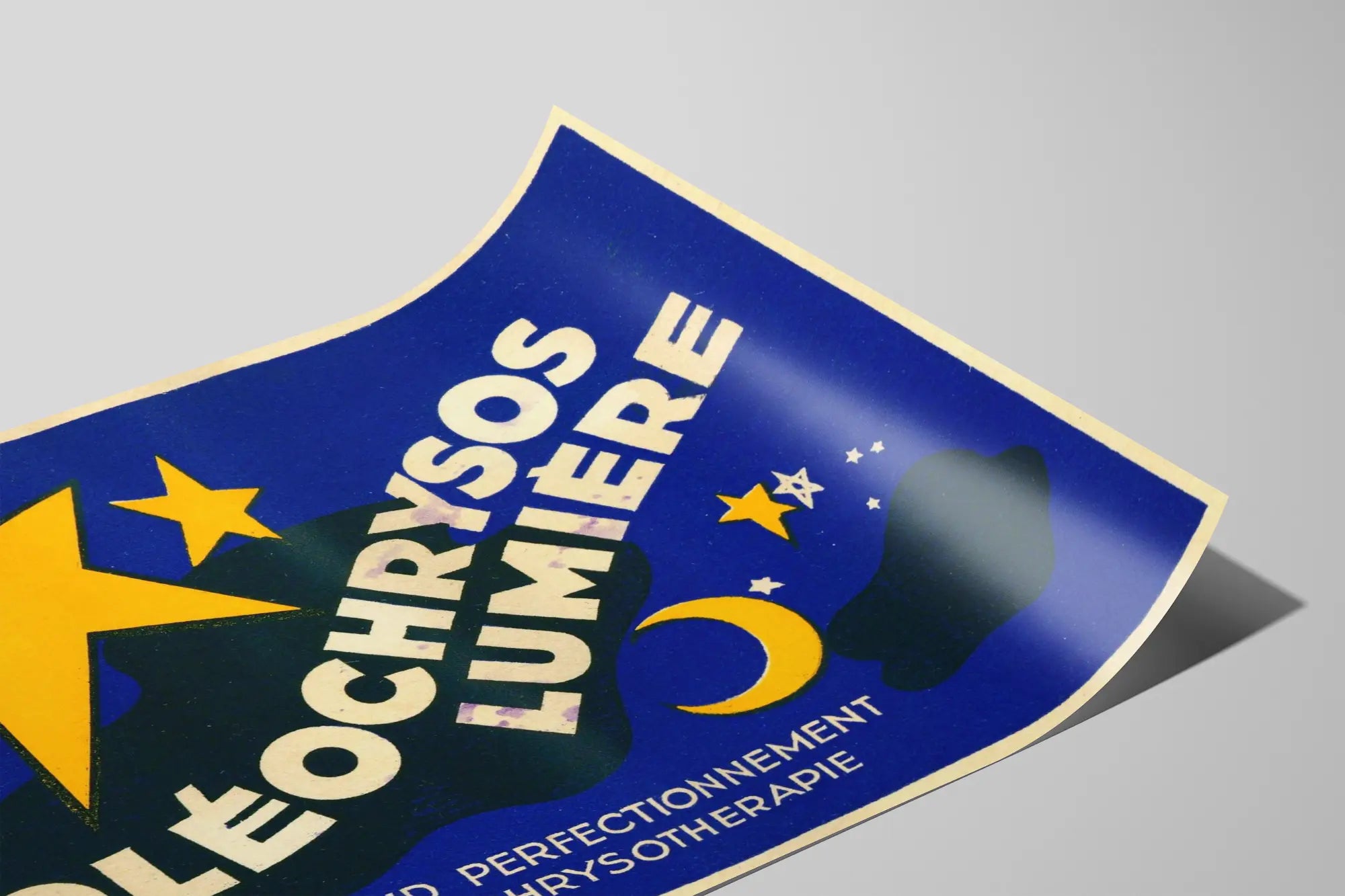 Den vintageaffisch med titeln « Oléo Chrysos Lumière » är ett fängslande grafiskt verk, perfekt för väggdekoration i ett retroinspirerat hem. Dess design utmärker sig genom en djupblå bakgrund prydd med gyllene stjärnor och en stiliserad månskära, som framkallar ljuset och natten. Den kontrasterande färgkombinationen av de klara gula stjärnorna och nattblått skapar en visuell dynamik som omedelbart fångar blickar. Den vita texten, placerad i en bågform, framhäver namnet « Oléo Chrysos Lumière » med en stark och slående närvaro, kompletterad av en mer diskret signatur som nämner « Den största förbättringen inom krysoterapi ». Detta budskap tillför en mystisk och elegant dimension till helheten, och antyder en produkt eller metod kopplad till ljusbehandling eller solterapi, utan att specificera dess natur.